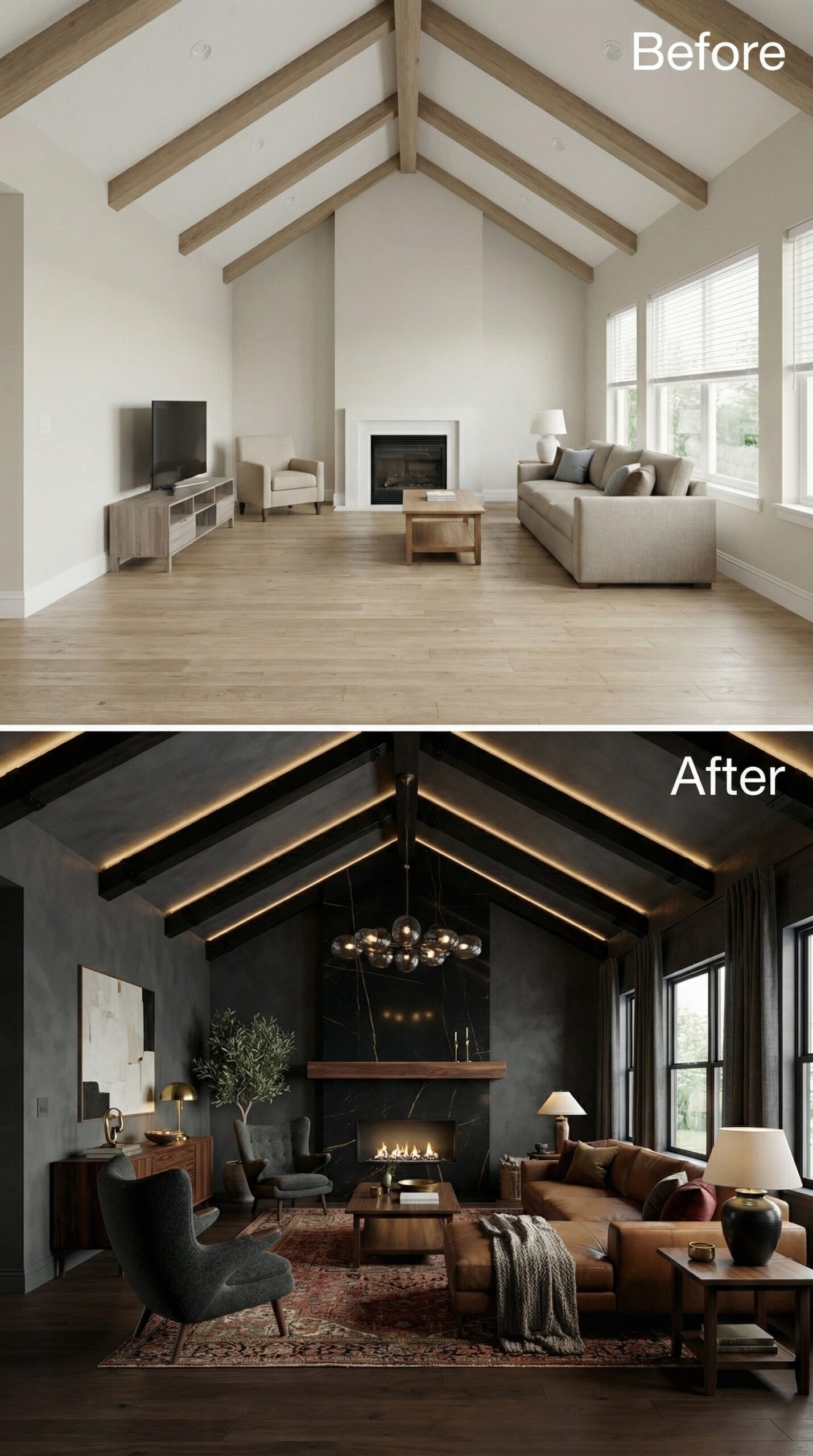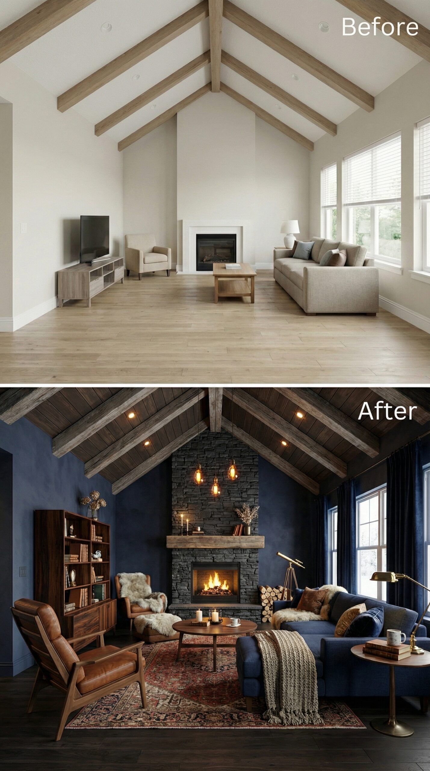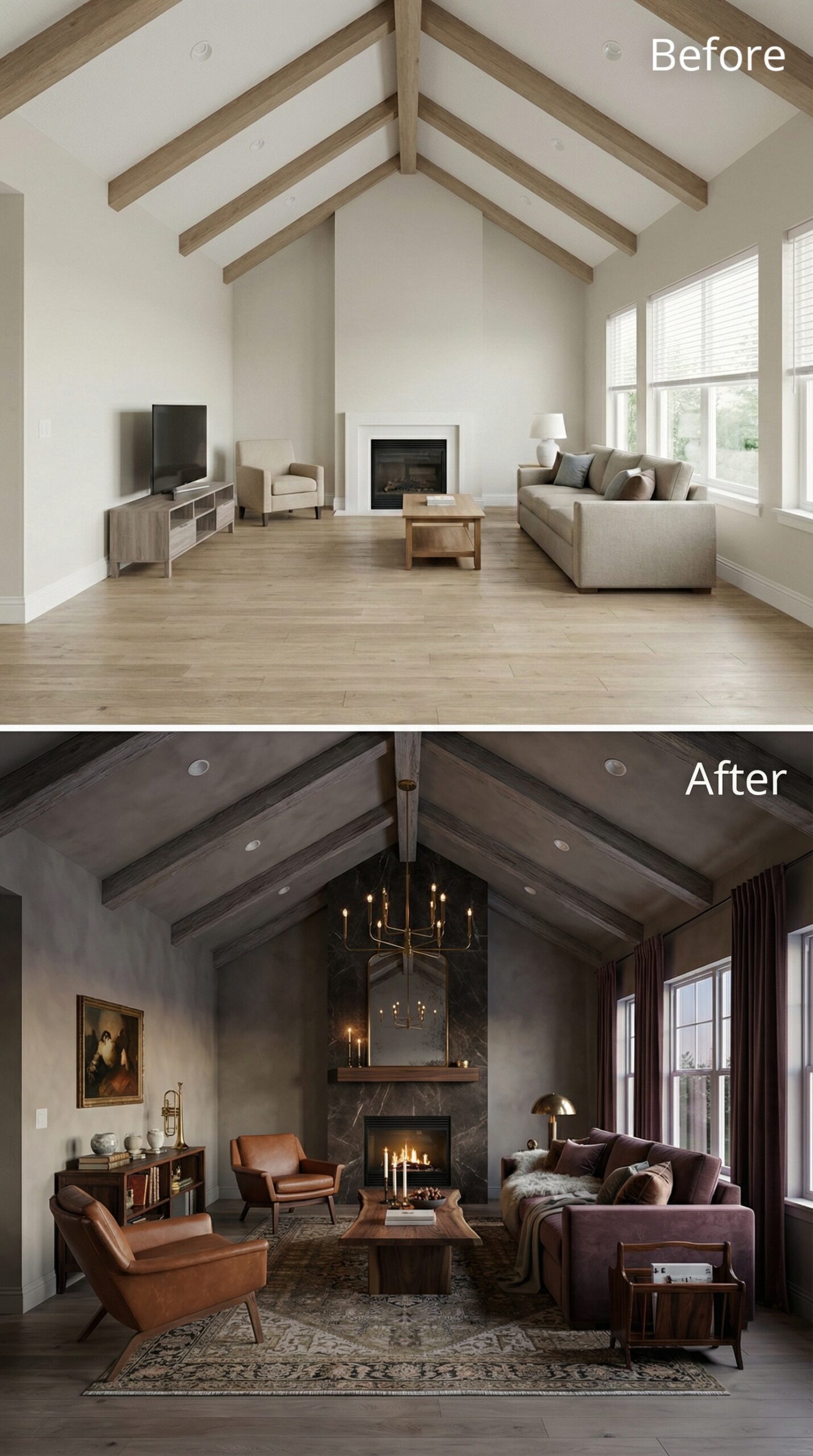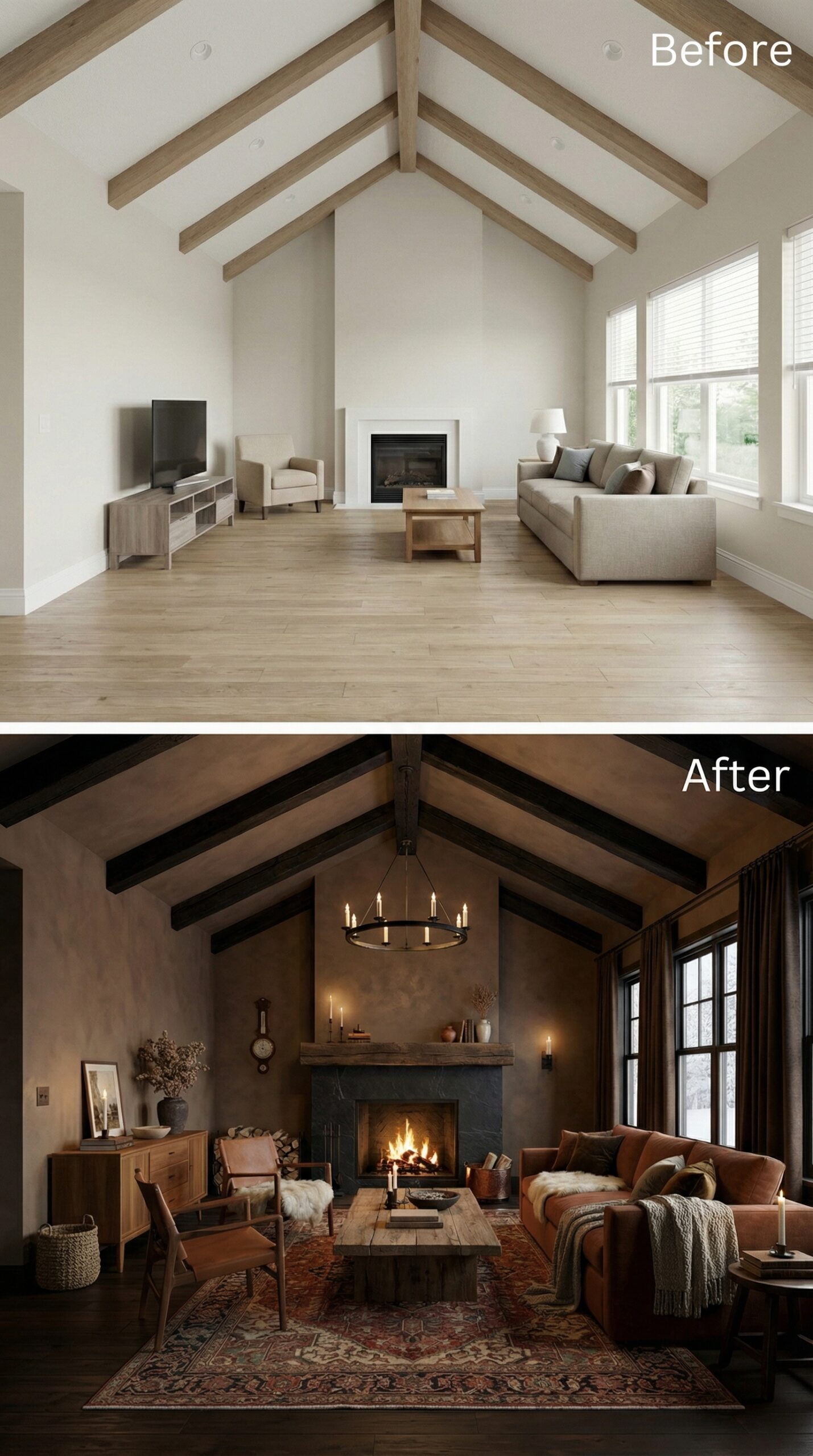 Natural light wood beams transformed into rich espresso-stained rafters anchor this dramatic makeover. Warm cognac leather seating replaces bland neutral furniture, while a live-edge wood coffee table and vintage Persian rug create authentic mid-century charm. Dark window trim, rustic stone fireplace surround, and ambient candlelight fixtures establish the cozy hygge atmosphere that makes this vaulted living room irresistibly inviting.