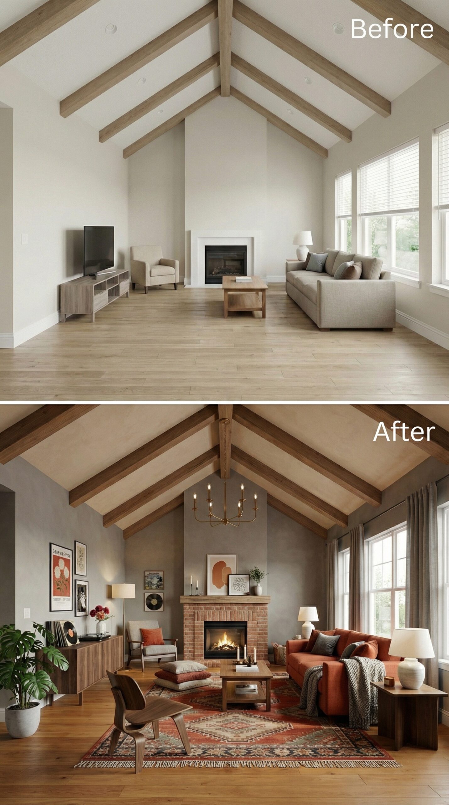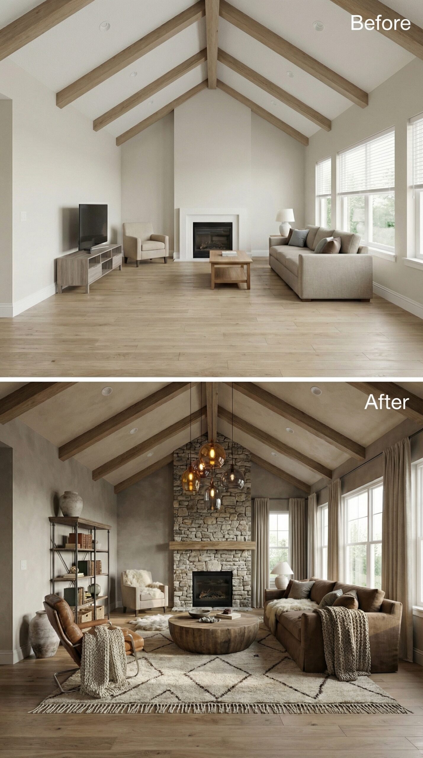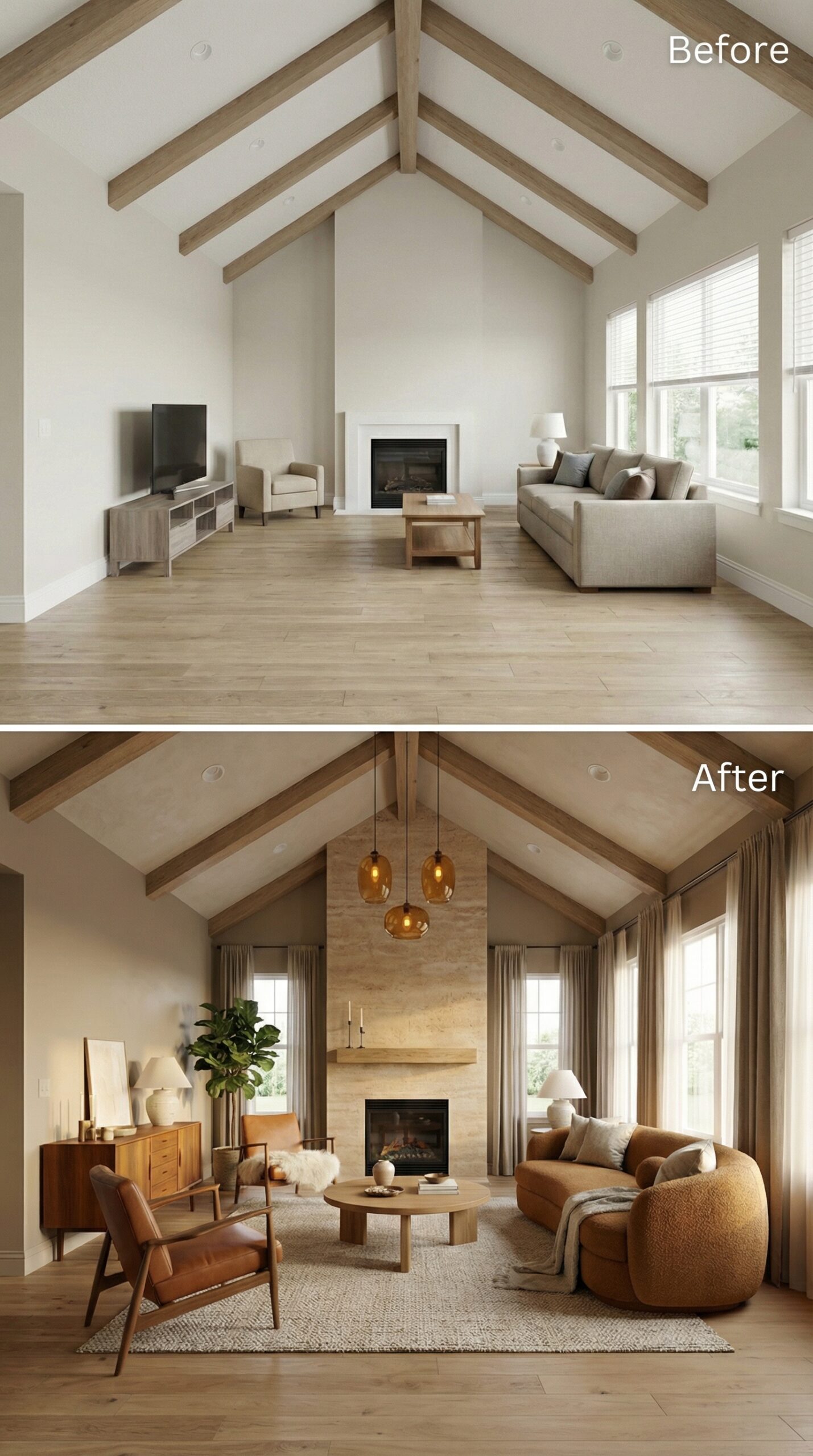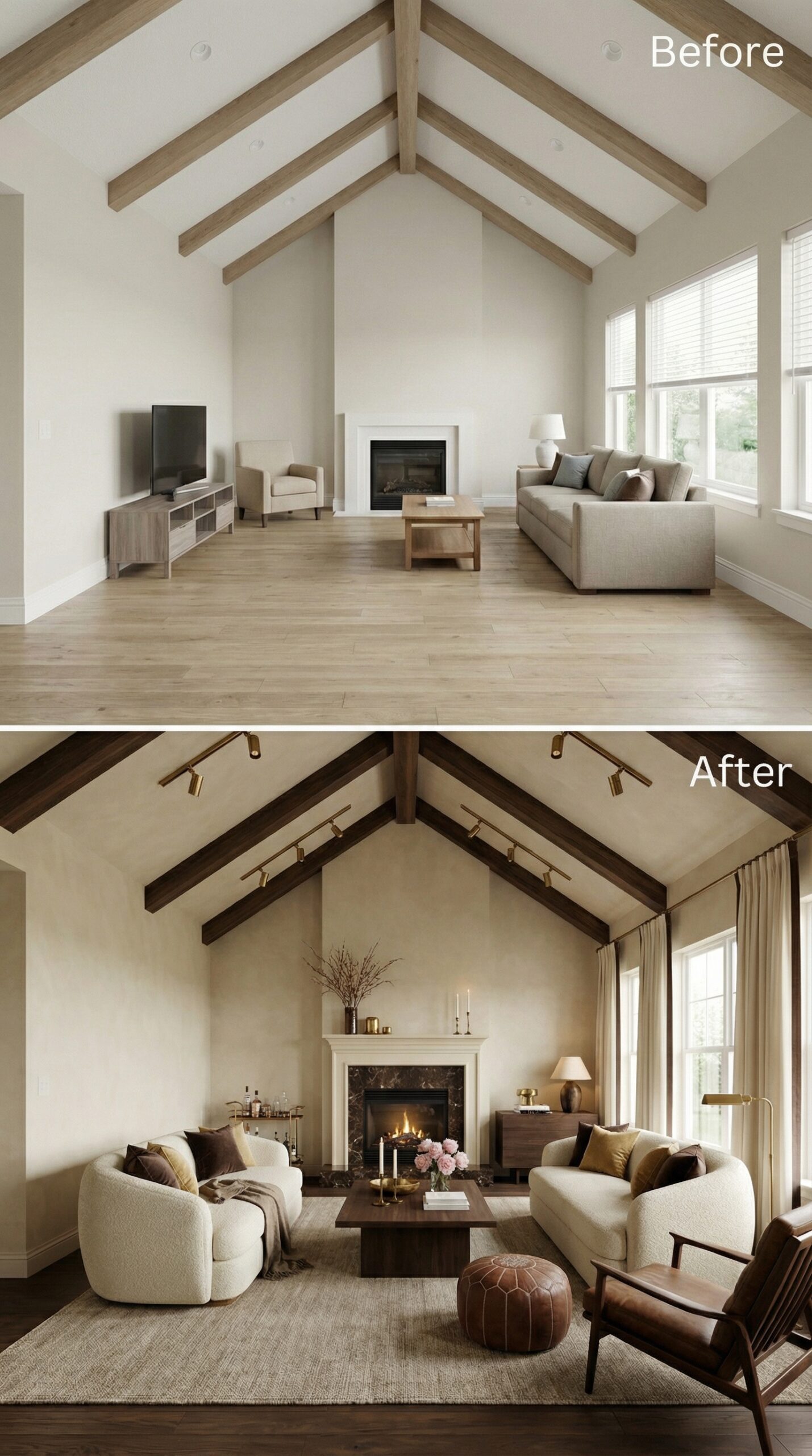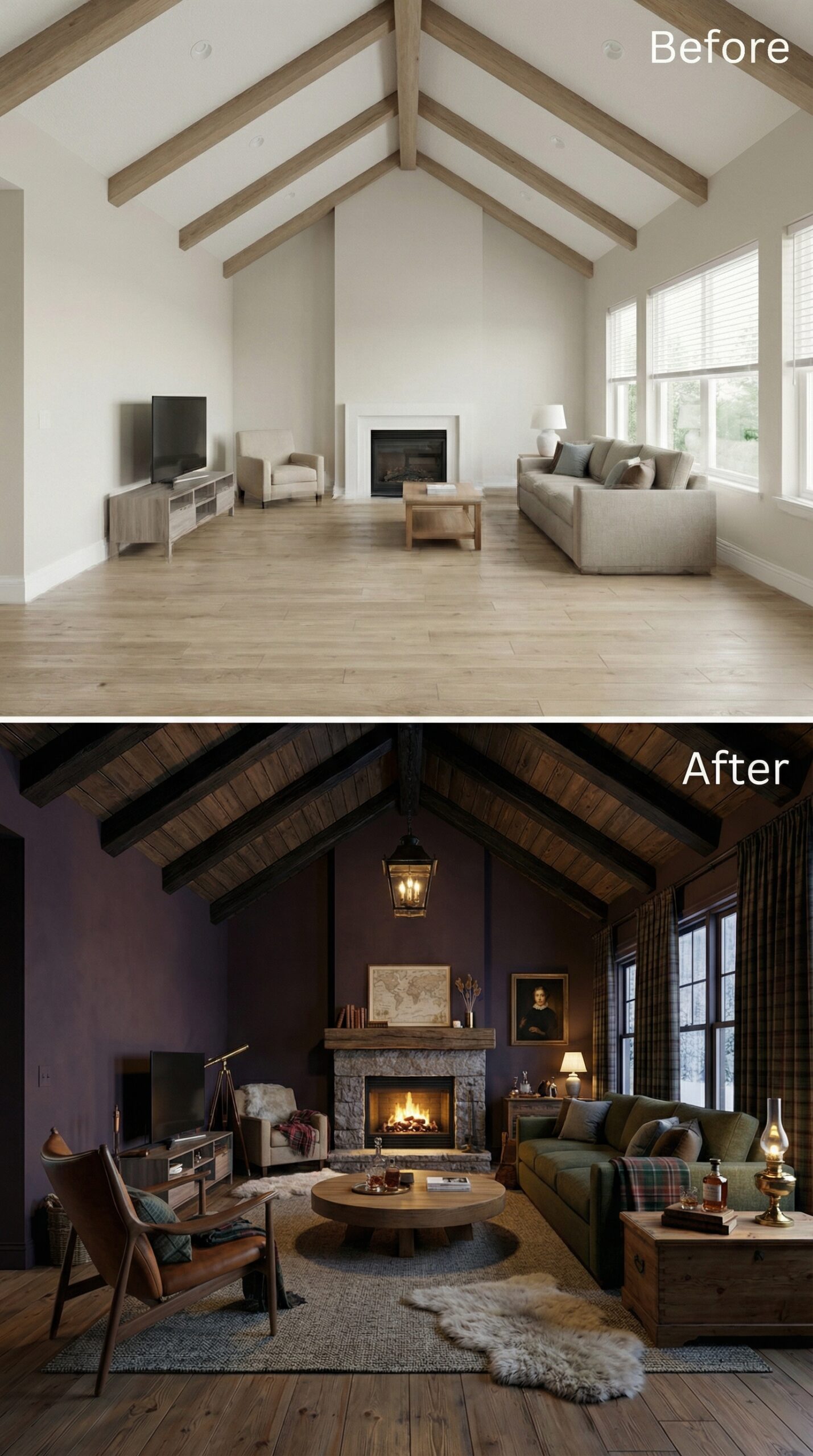 Natural light wood beams transformed into rich espresso-stained rafters anchor this dramatic makeover. Warm cognac leather seating replaces bland neutral furniture, while a live-edge wood coffee table and vintage Persian rug create authentic mid-century charm. Dark window trim, rustic stone fireplace surround, and ambient candlelight fixtures establish the cozy hygge atmosphere that makes this vaulted living room irresistibly inviting.