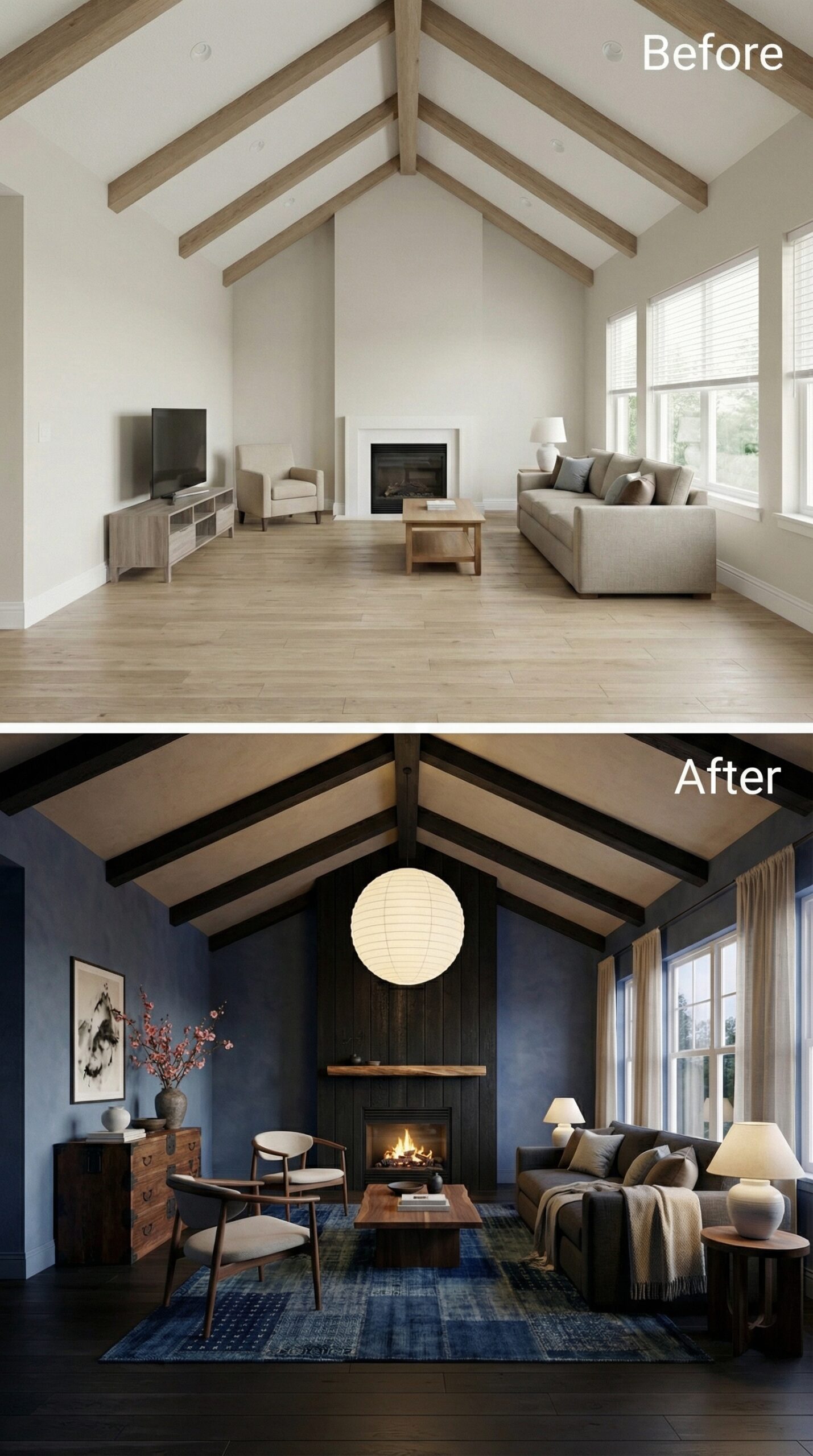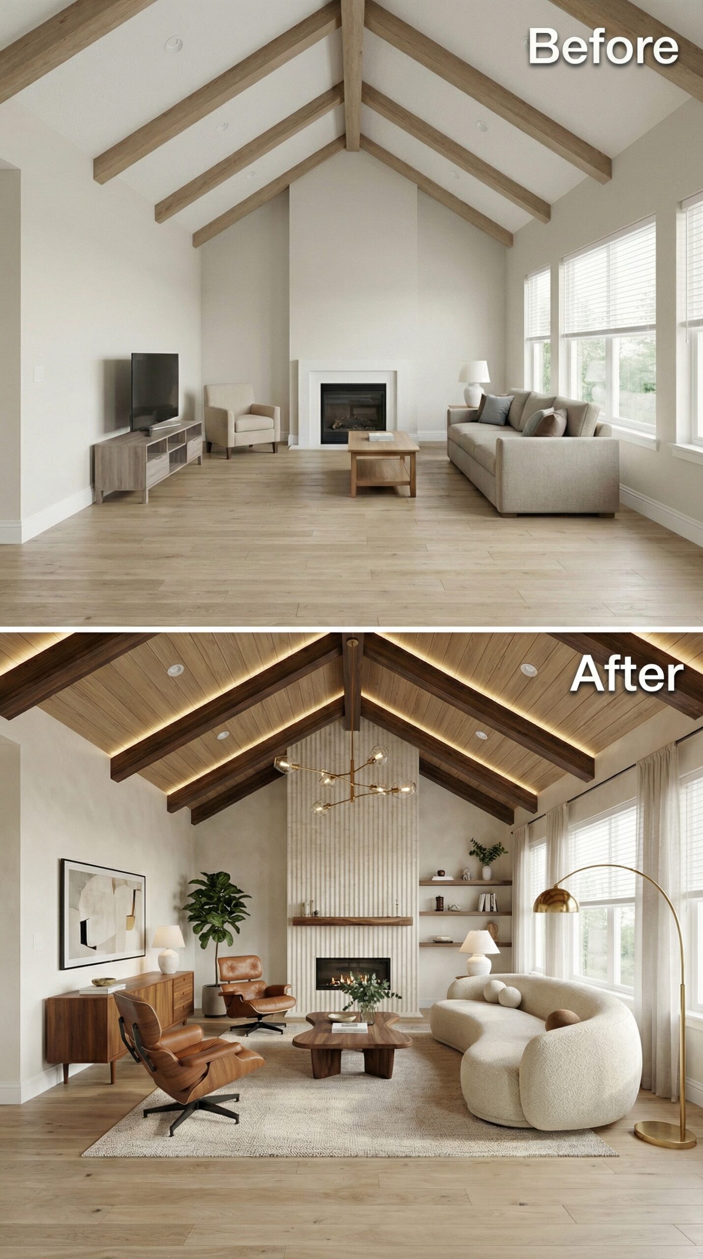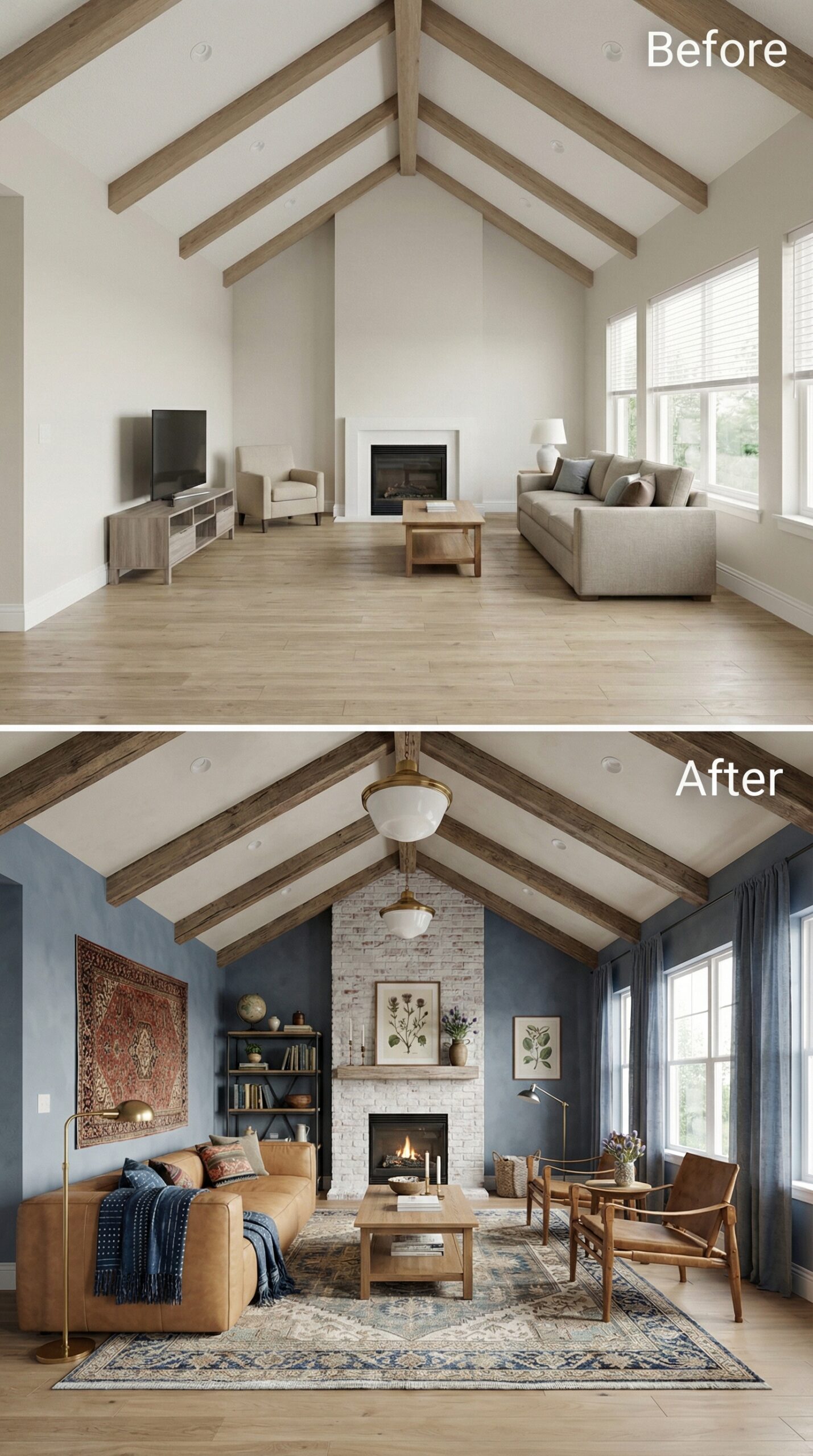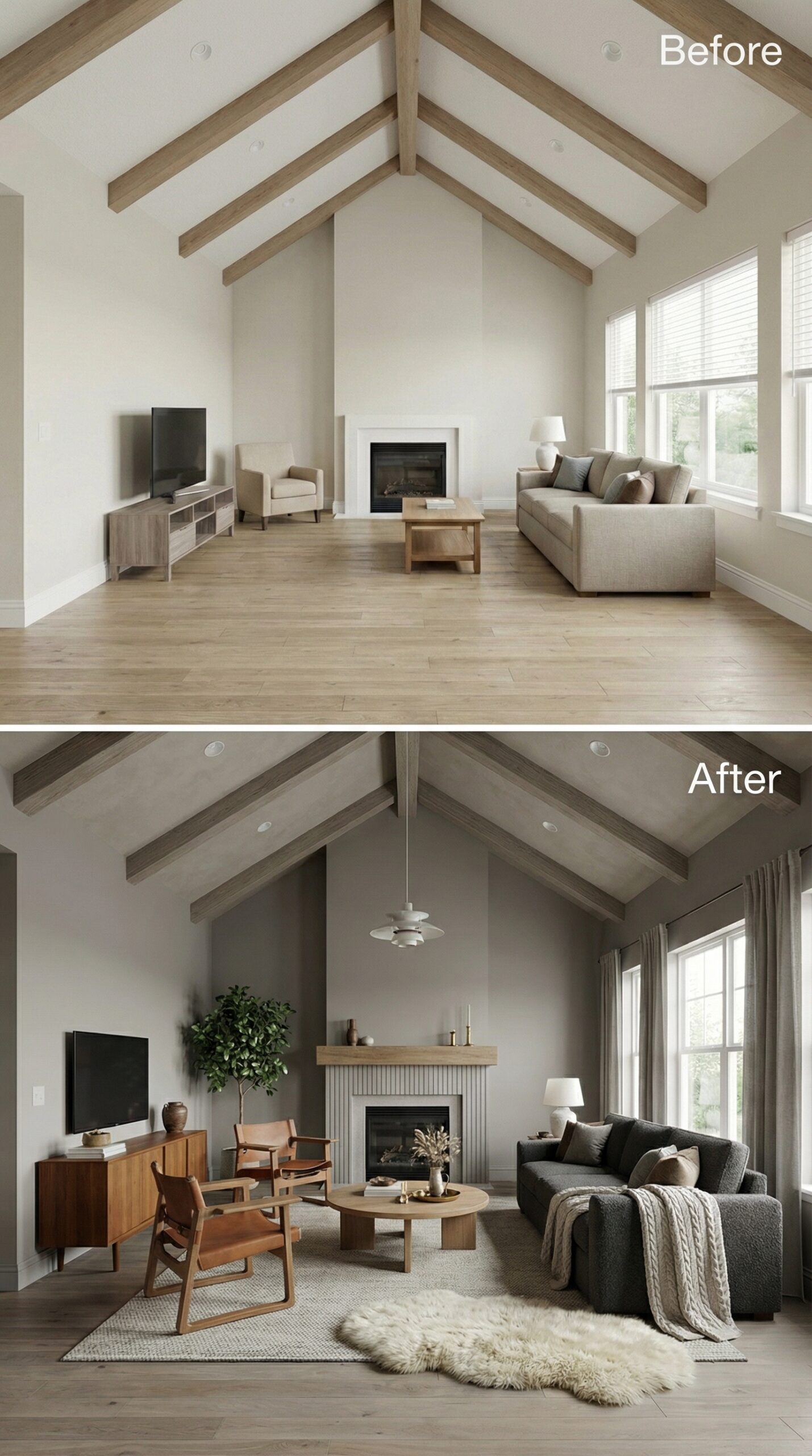 Natural light wood beams transformed into rich espresso-stained rafters anchor this dramatic makeover. Warm cognac leather seating replaces bland neutral furniture, while a live-edge wood coffee table and vintage Persian rug create authentic mid-century charm. Dark window trim, rustic stone fireplace surround, and ambient candlelight fixtures establish the cozy hygge atmosphere that makes this vaulted living room irresistibly inviting.