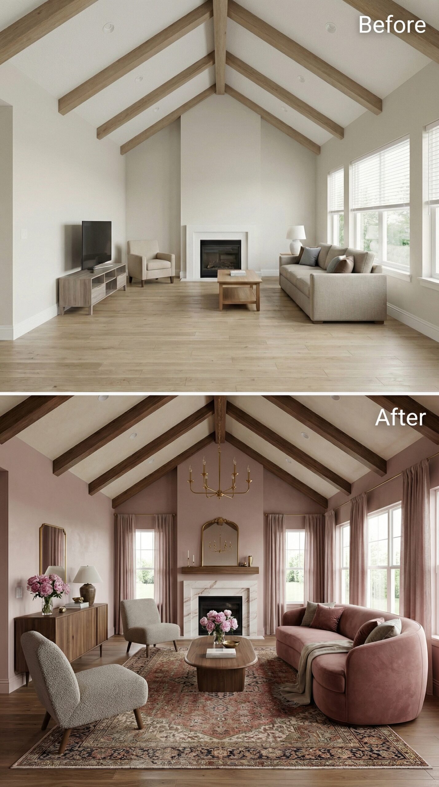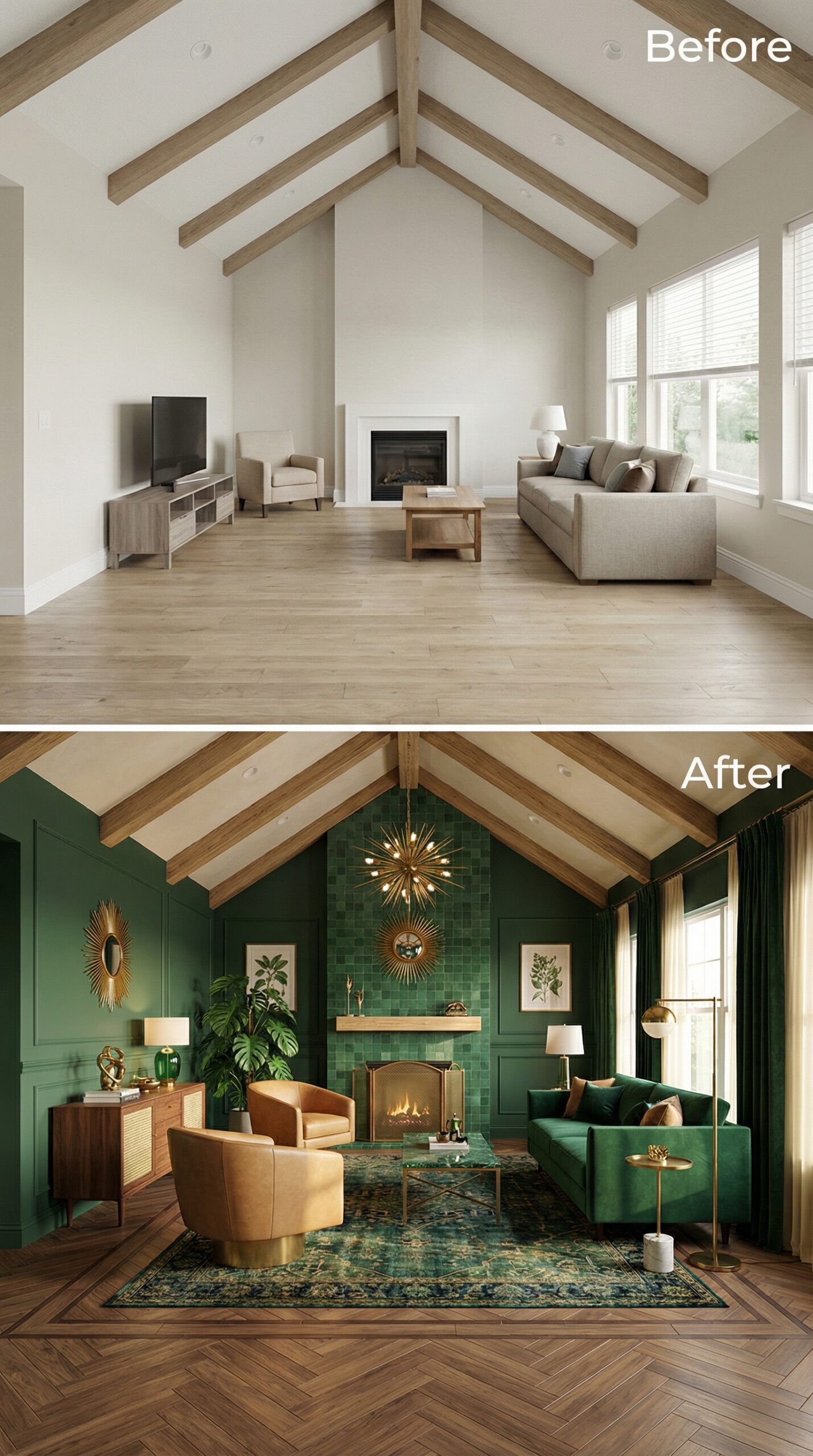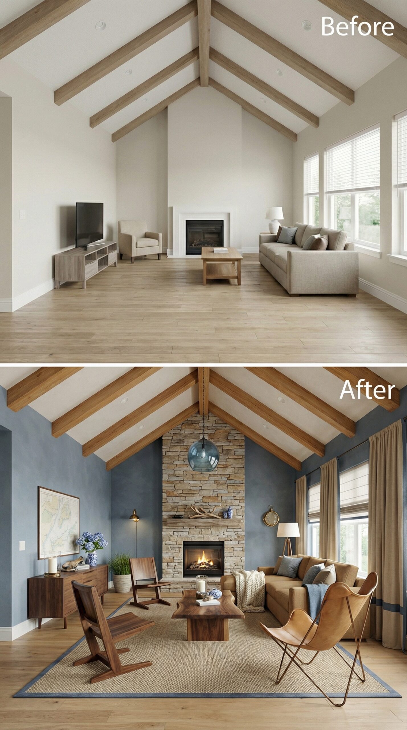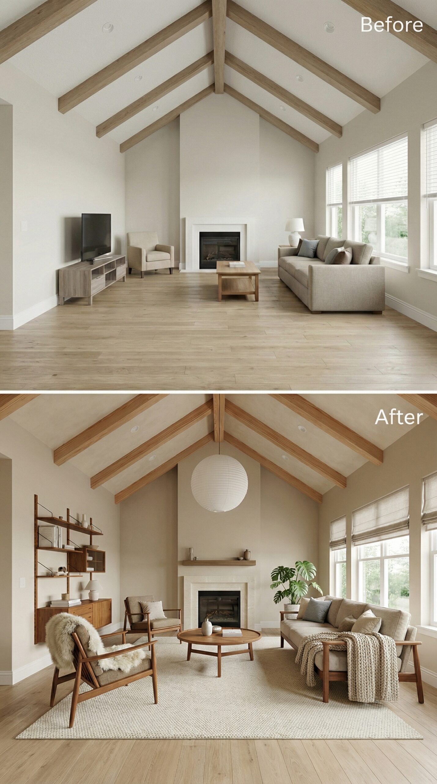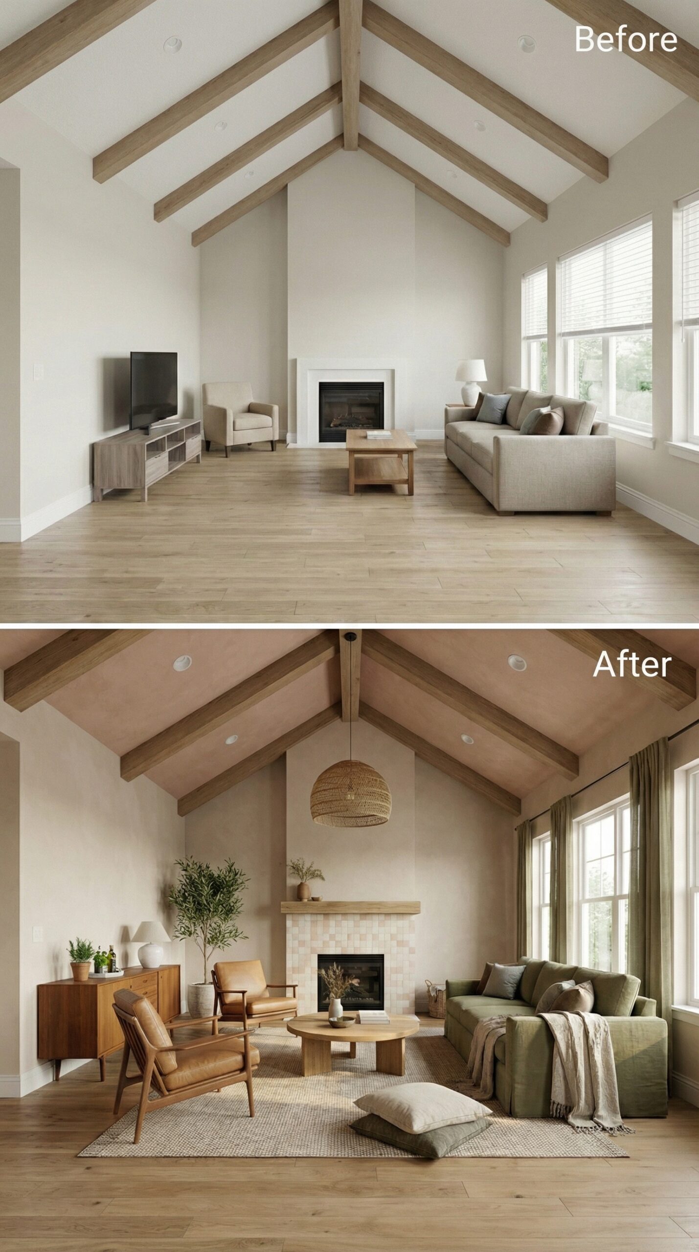 Natural light wood beams transformed into rich espresso-stained rafters anchor this dramatic makeover. Warm cognac leather seating replaces bland neutral furniture, while a live-edge wood coffee table and vintage Persian rug create authentic mid-century charm. Dark window trim, rustic stone fireplace surround, and ambient candlelight fixtures establish the cozy hygge atmosphere that makes this vaulted living room irresistibly inviting.