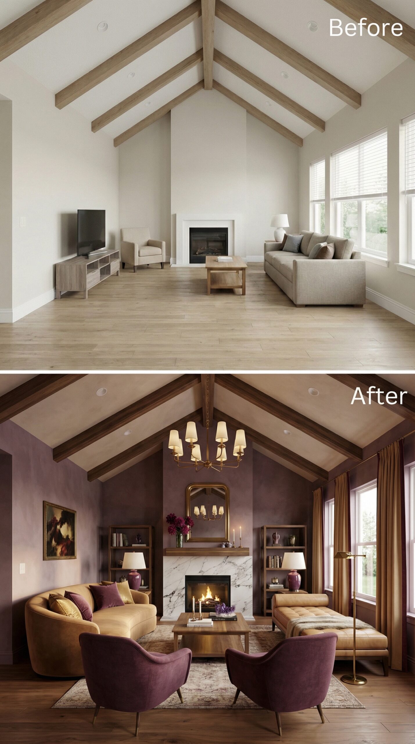 Dramatic plum accent walls replace stark white surfaces, instantly warming the builder grade living room with vaulted ceiling. Rich burgundy velvet chairs anchor golden mustard seating, while built-in shelving flanks the marble fireplace surround. A statement chandelier transforms the soaring ceiling into a focal point, complemented by warm wood tones and brass fixtures throughout.