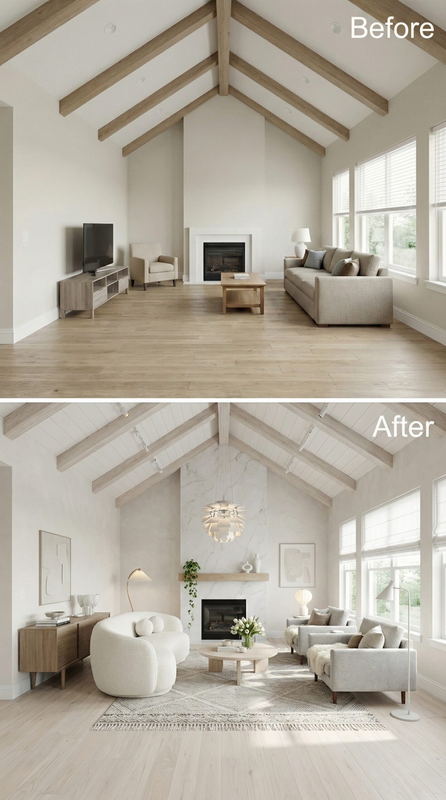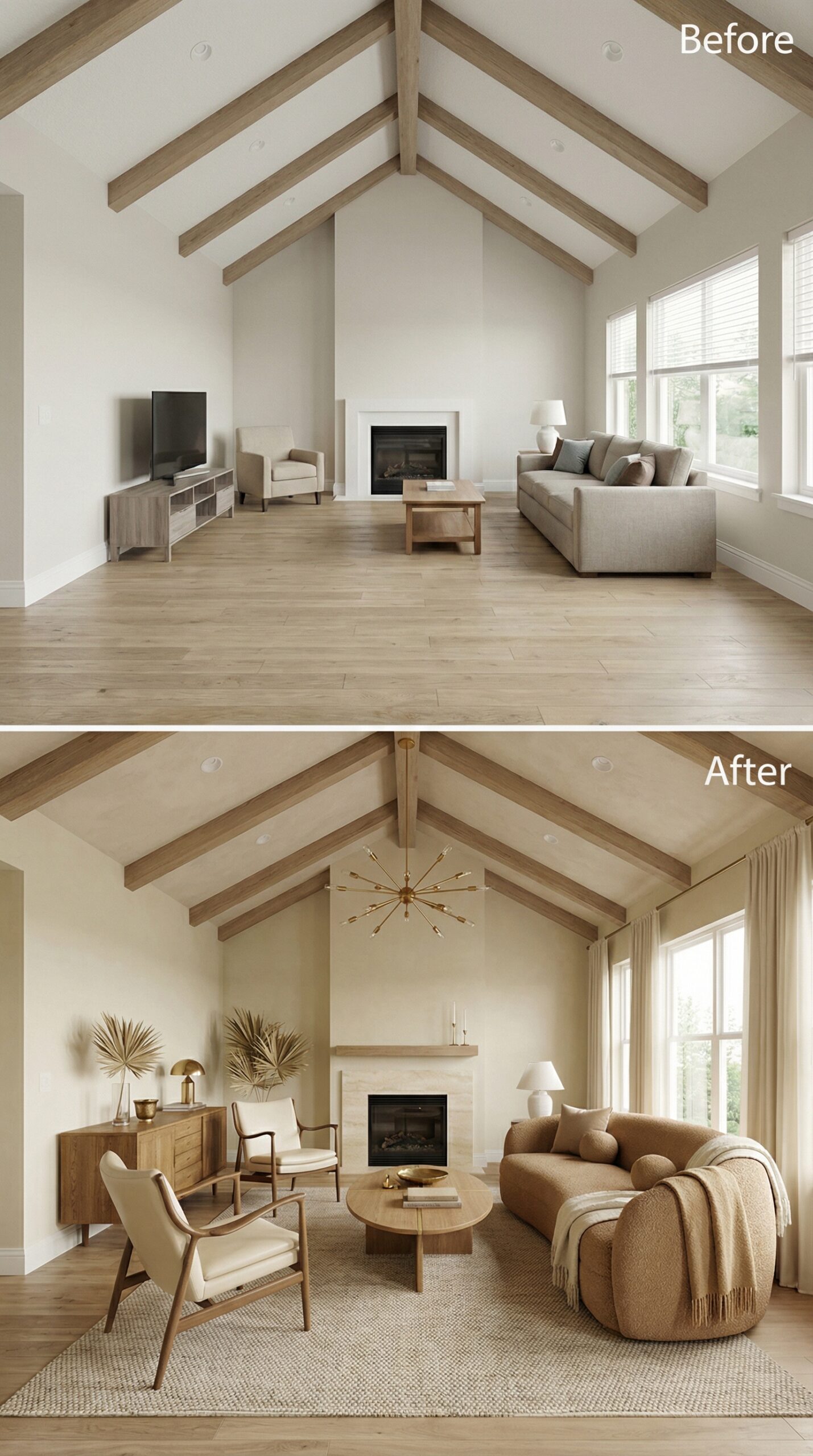 Warm wood ceiling beams now add architectural interest to this once-sparse builder grade living room with vaulted ceiling. The transformation introduces a sophisticated furniture arrangement with curved cream sofas, a rich walnut coffee table, and leather moroccan poufs that create intimate conversation zones. Flowing curtains and layered lighting replace the stark emptiness, while the fireplace gains prominence with carefully curated styling and a classic white mantel treatment.