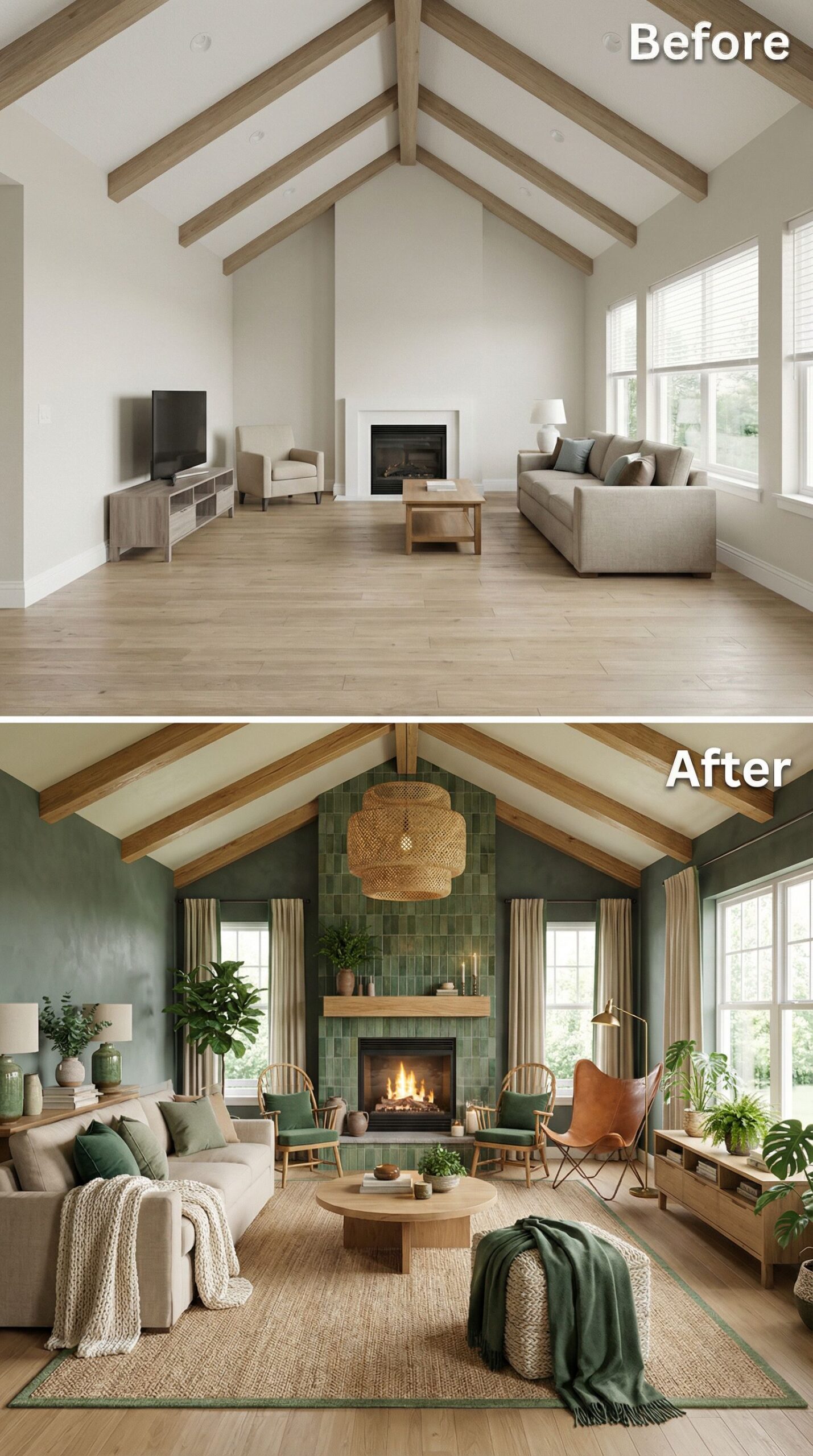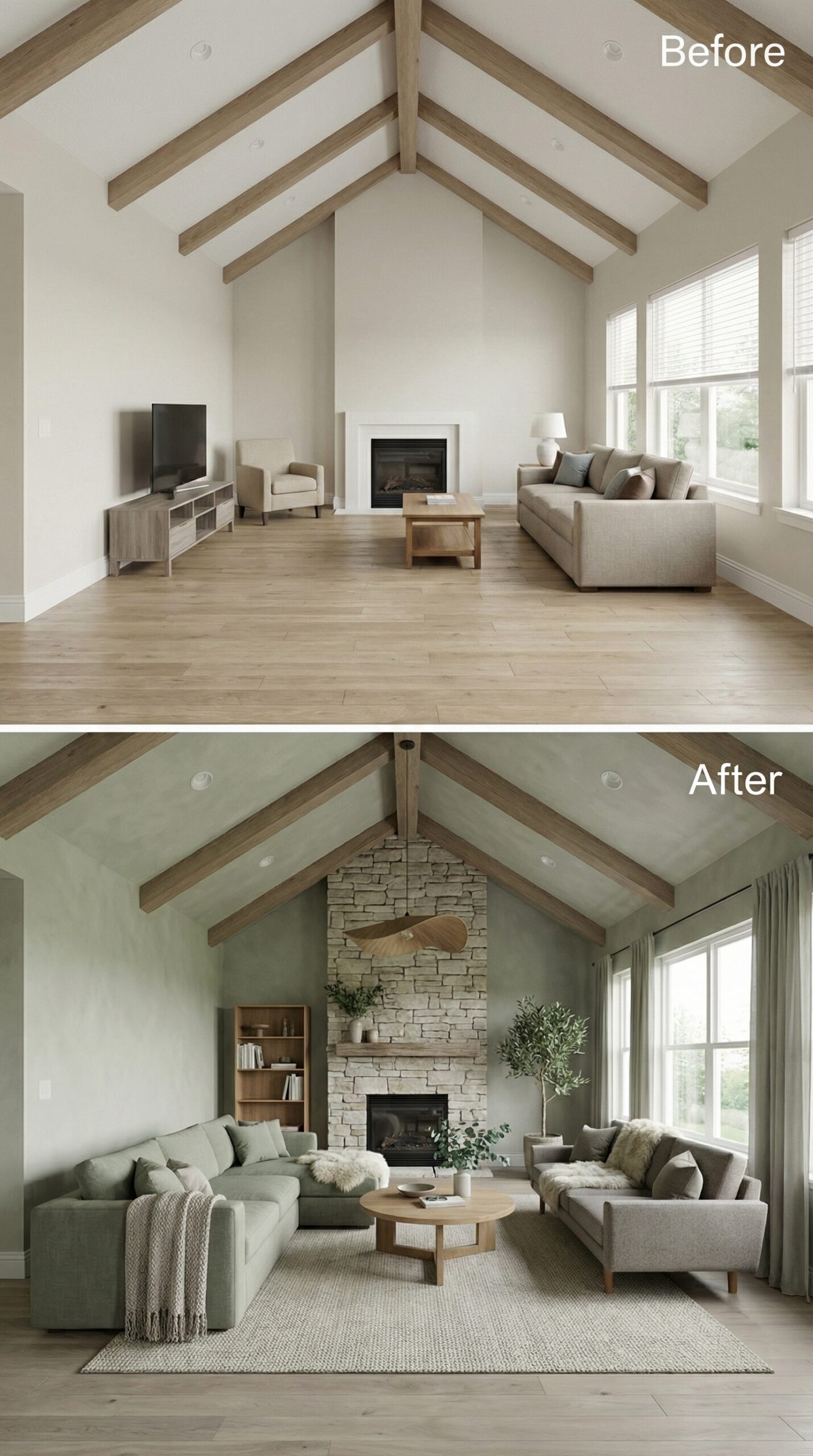 Natural stone transforms this builder grade living room with vaulted ceiling into a cozy retreat centered around texture and warmth. The striking stacked stone fireplace wall anchors the redesigned space, while sage green walls replace stark white for a calming backdrop. Layered seating arrangements, woven textures, and organic greenery complete the transformation from sparse to sophisticated hygge living.