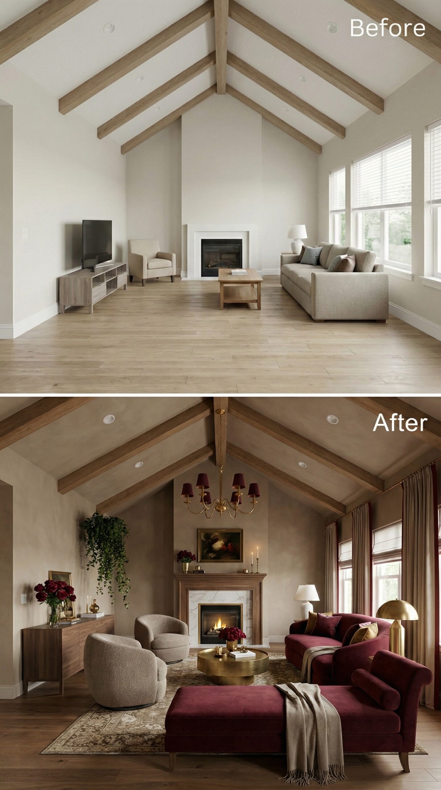 Builder grade living room with vaulted ceiling transforms into a luxurious retreat through rich burgundy velvet seating and warm brass accents. The fireplace gains a sophisticated wood surround while flowing curtains replace bare windows. Layered lighting from a brass chandelier and table lamps creates intimate ambiance, while curated accessories and lush florals add sophisticated warmth to the once-sparse space.
