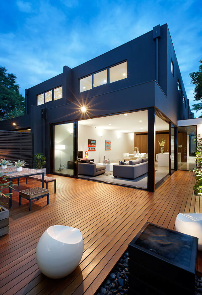 The patio is an exercise in rich minimalism, with sumptuous timber flooring and privacy fending that wraps the entire space, dotted with manicured plant life. Novel white bean chairs and a traditional picnic table make for a truly useful space.