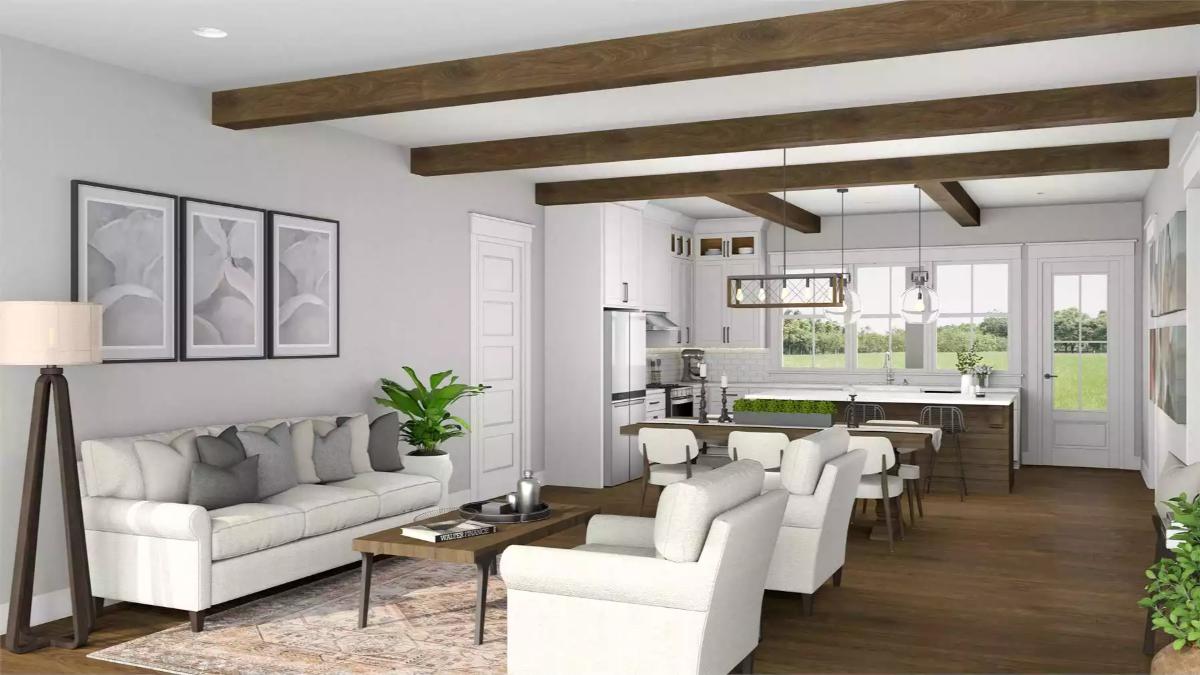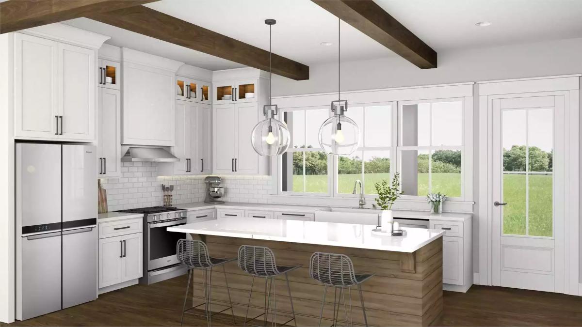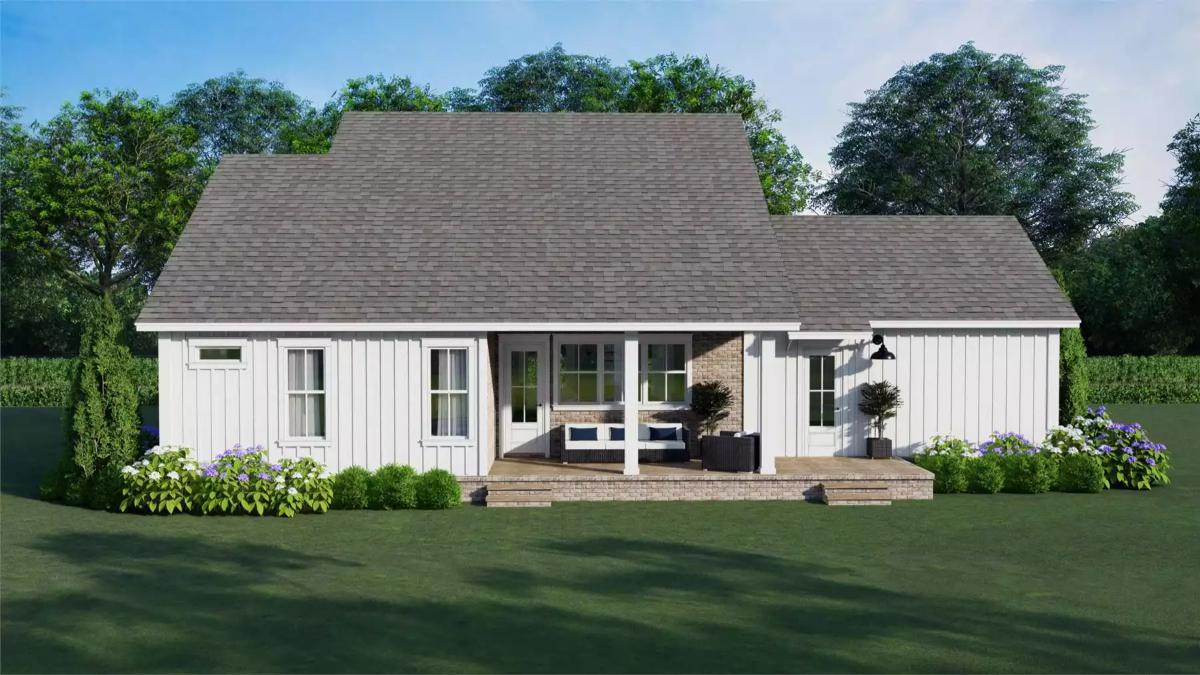 A classic country farmhouse of modest size, House Plan 4367 would make a wonderful home for a family on a budget! The one-level layout features 1,479 square feet with three bedrooms and two bathrooms. Enter through the front door and the open-concept living area stretches back to the kitchen, complete with an island with an eating bar.