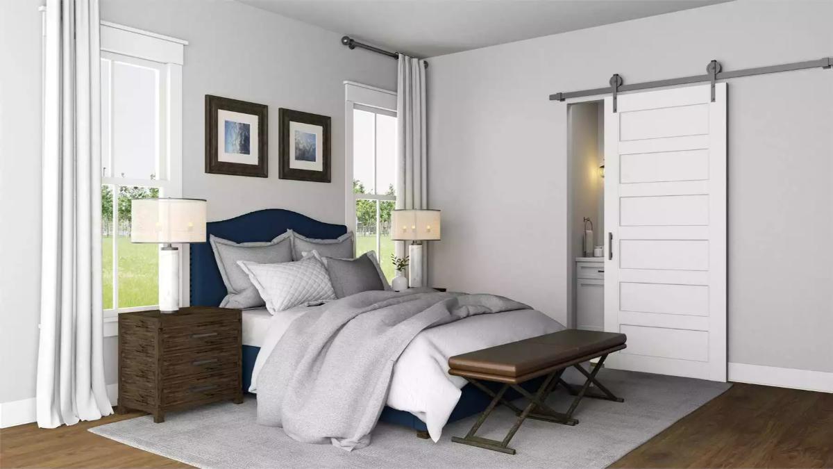 The two secondary bedrooms and a hall bath are located in a hallway to the side while the master suite is in another hallway behind them, beside the laundry. The two-car garage is placed on the opposite side of the house from the bedrooms.