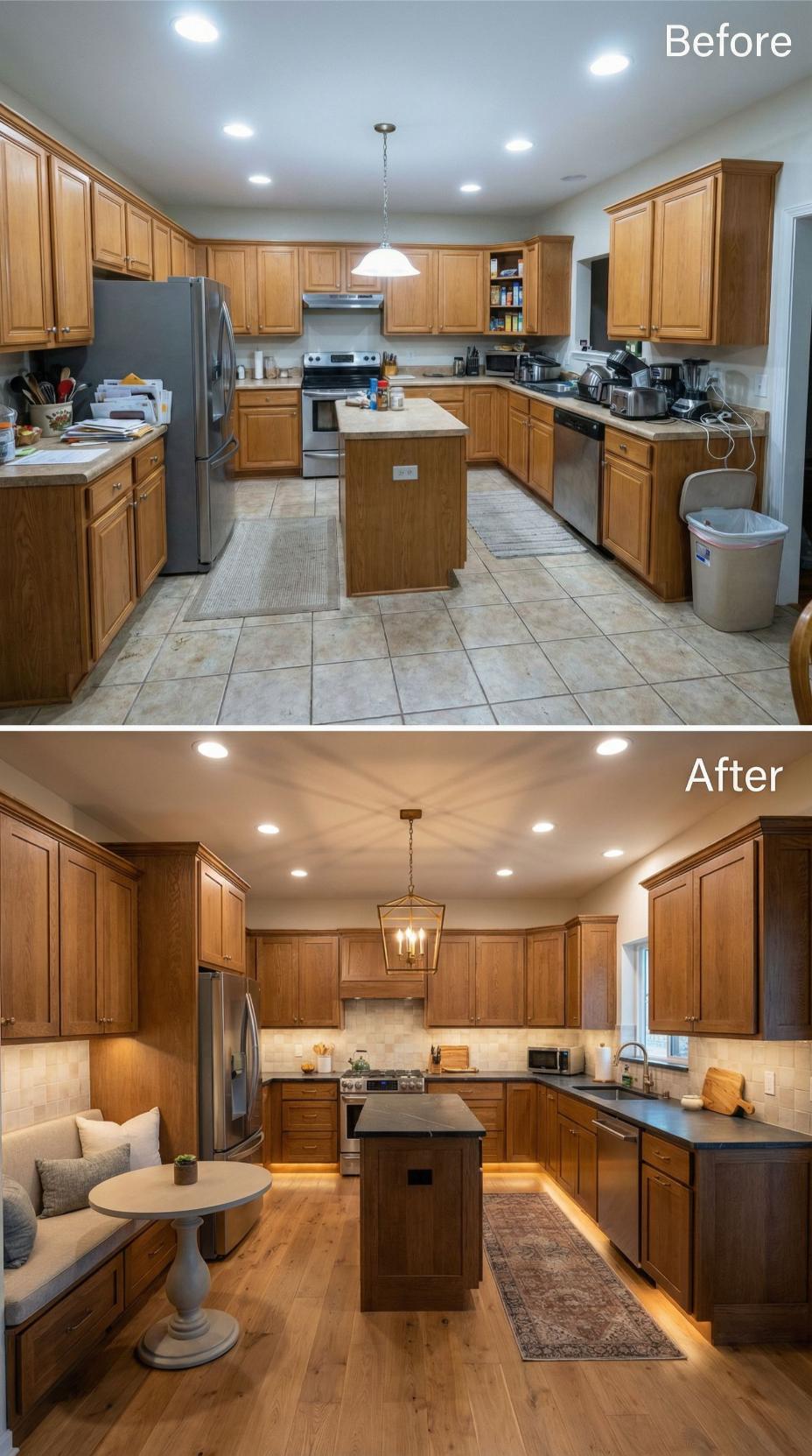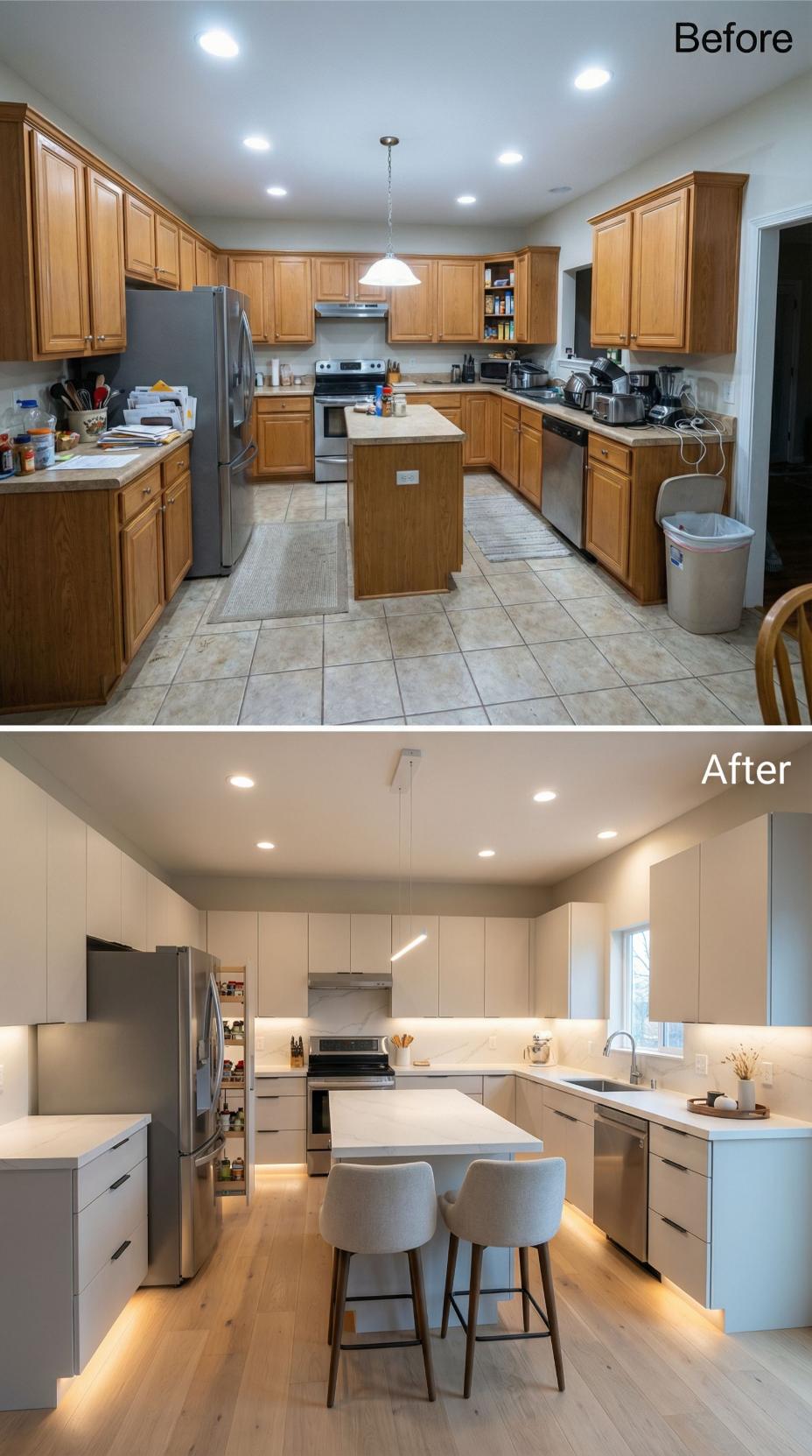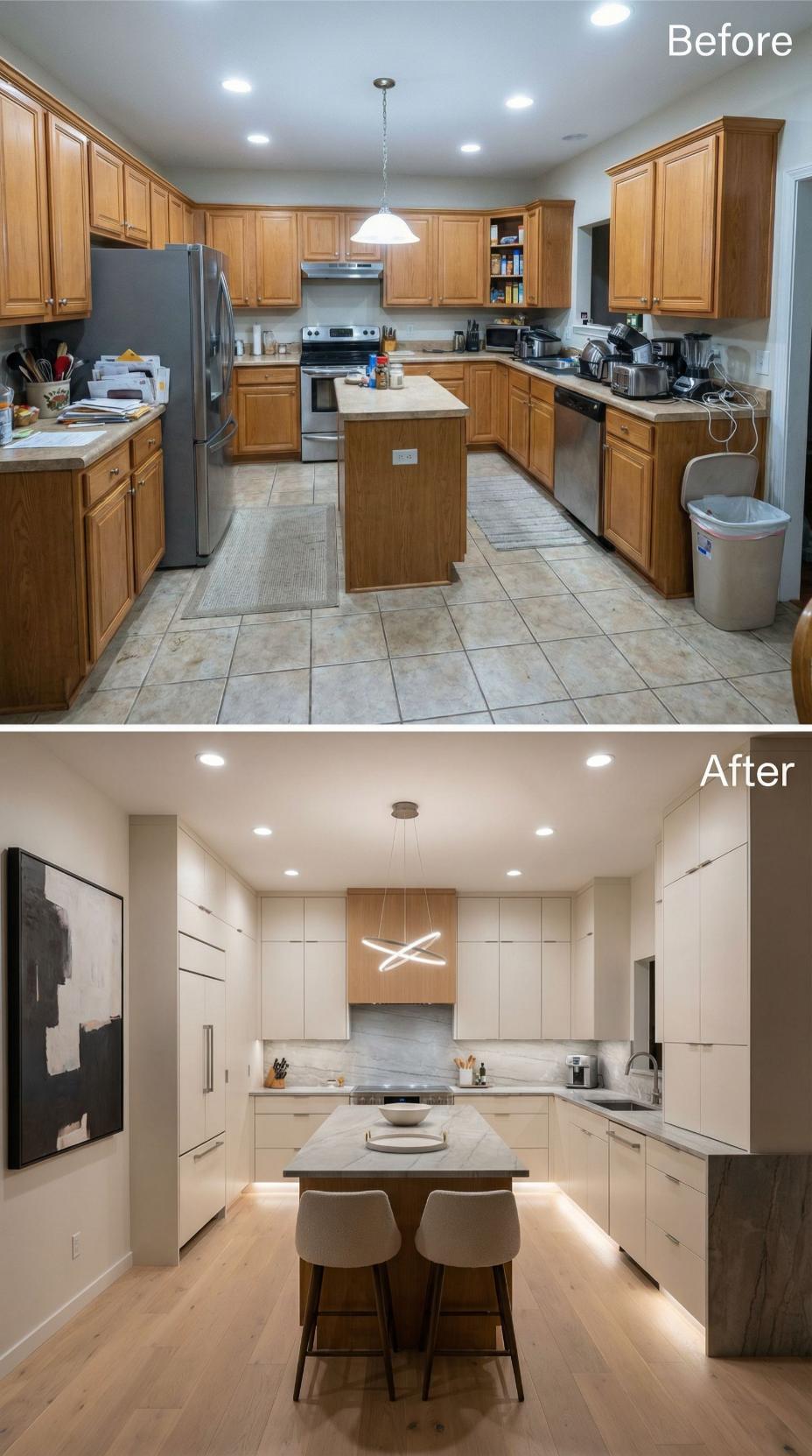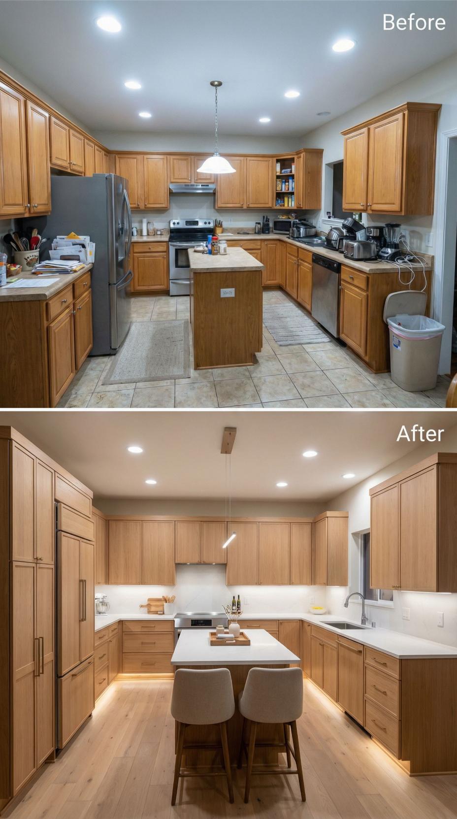 Warm honey oak cabinets and dated tile floors gave way to streamlined light wood cabinetry with sleek horizontal grain patterns. Under-cabinet LED lighting creates ambient warmth while eliminating harsh overhead glare. The updated island features waterfall edges and contemporary bar seating, transforming the cramped builder grade kitchen into an open, sophisticated culinary workspace with clean lines and modern functionality.