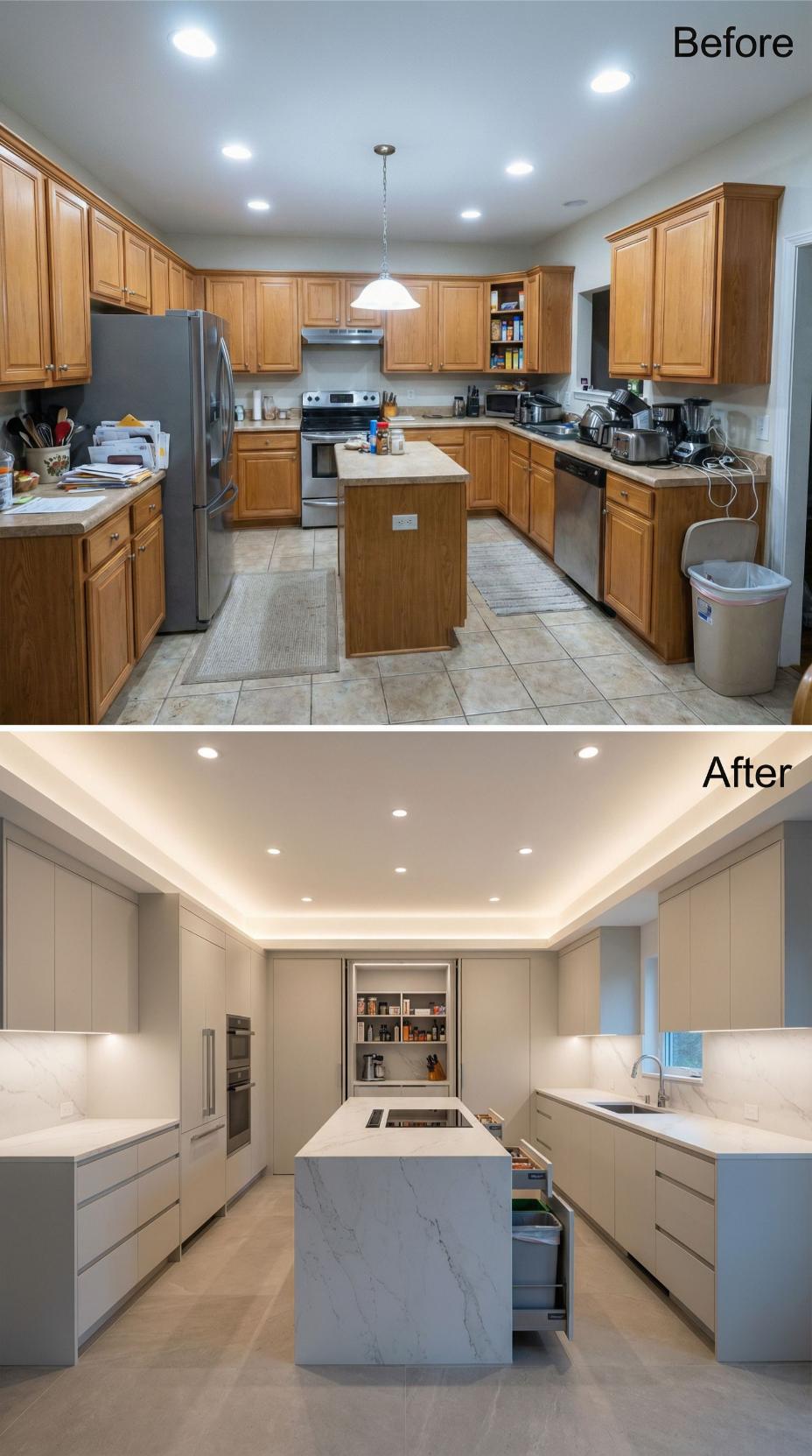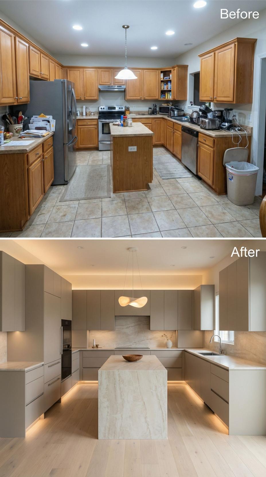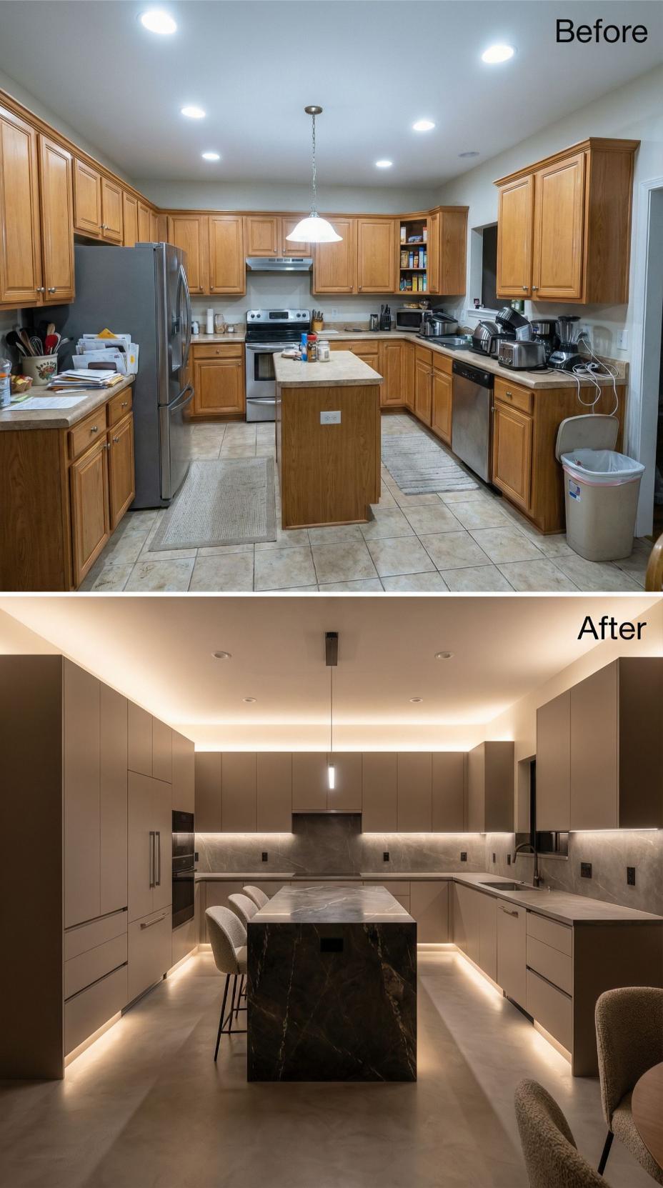 Warm oak cabinets and traditional tile floors gave way to sophisticated taupe flat-panel cabinetry and luxurious marble surfaces. Under-cabinet LED strips create ambient lighting throughout, while the streamlined waterfall island anchors the space with dramatic presence. Integrated appliances and handleless doors maintain clean lines, transforming this builder grade kitchen into a serene culinary sanctuary with spa-like elegance.