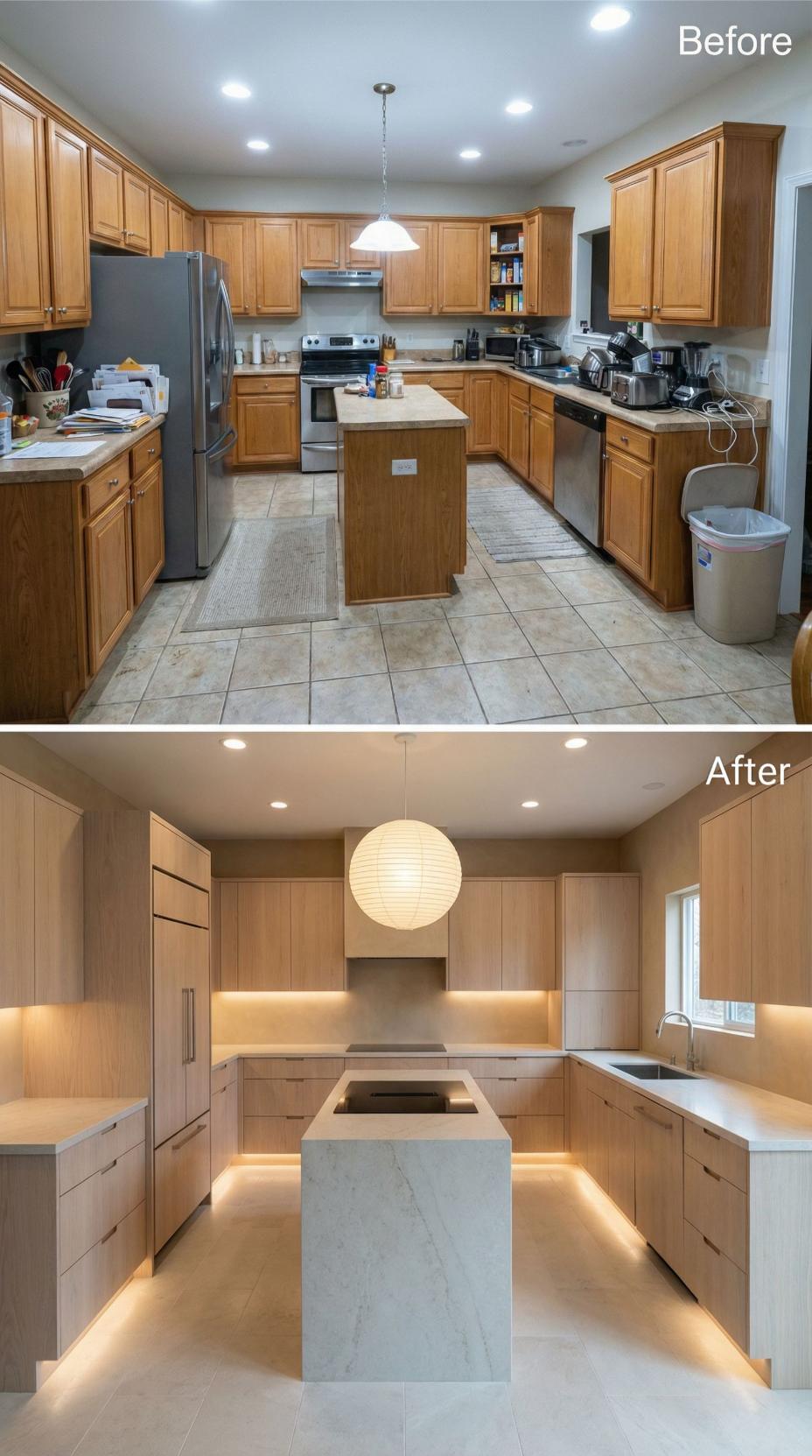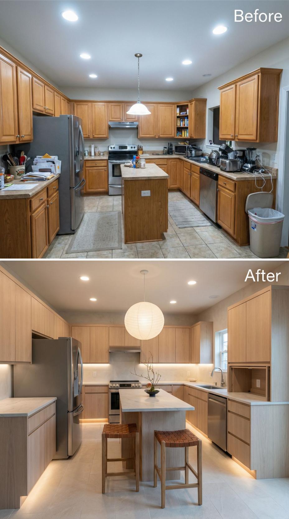 Warm wood cabinetry transforms this formerly cluttered builder grade kitchen into a sophisticated culinary workspace. Clean-lined flat-panel doors replace raised panel cabinets while under-cabinet LED strips create ambient illumination. White quartz countertops and minimalist hardware elevate the space, complemented by a striking paper lantern pendant that anchors the expanded island with integrated seating.