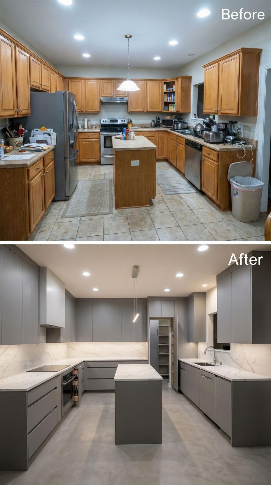 Warm honey oak cabinets and beige tile floors disappeared to make way for streamlined flat-panel cabinetry in charcoal gray. White quartz countertops with dramatic veining create stunning contrast against the modern gray finish, while under-cabinet LED strips illuminate the marble-look backsplash. The original U-shaped layout remains functional, but now radiates contemporary elegance with clean lines and monochromatic sophistication.