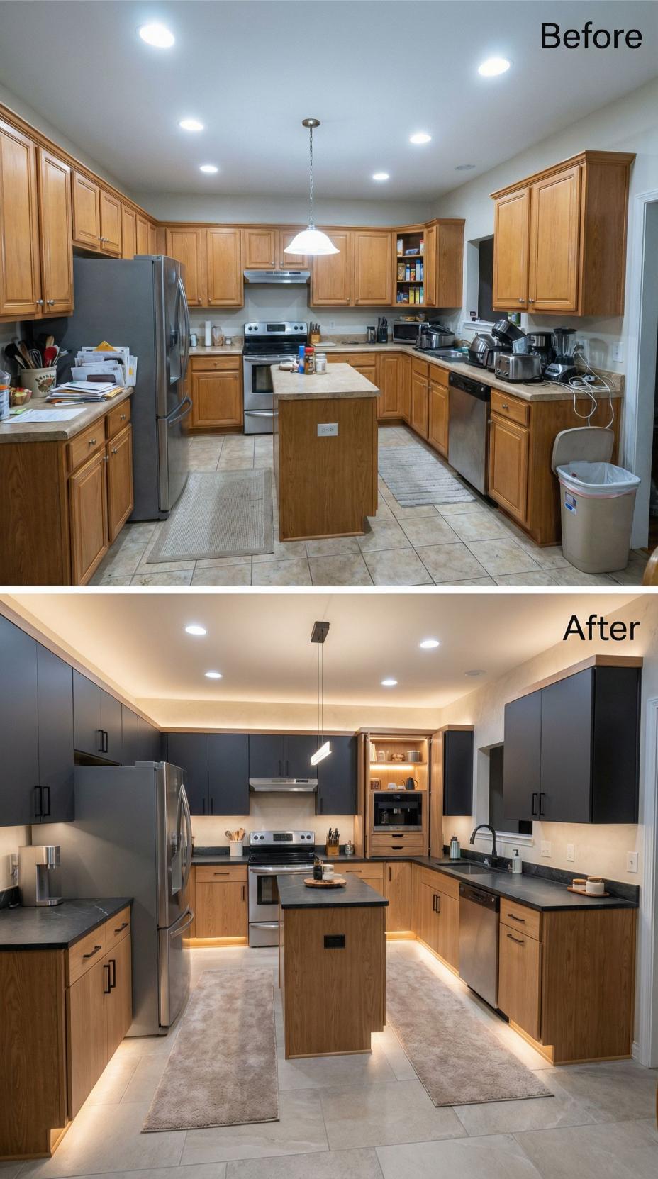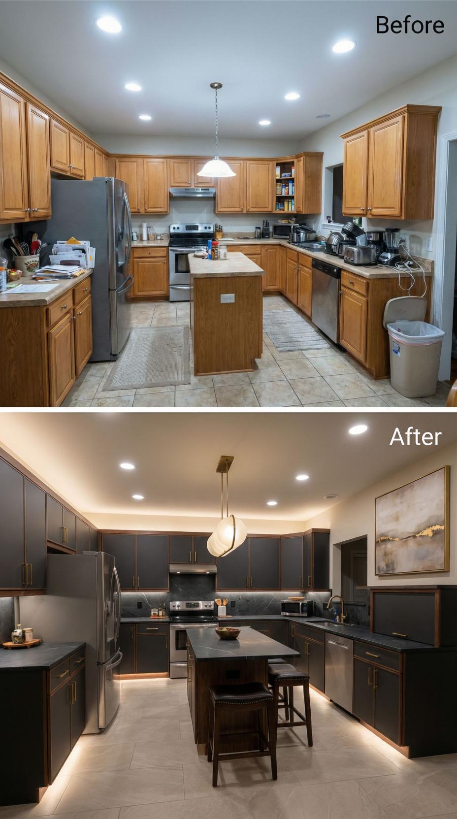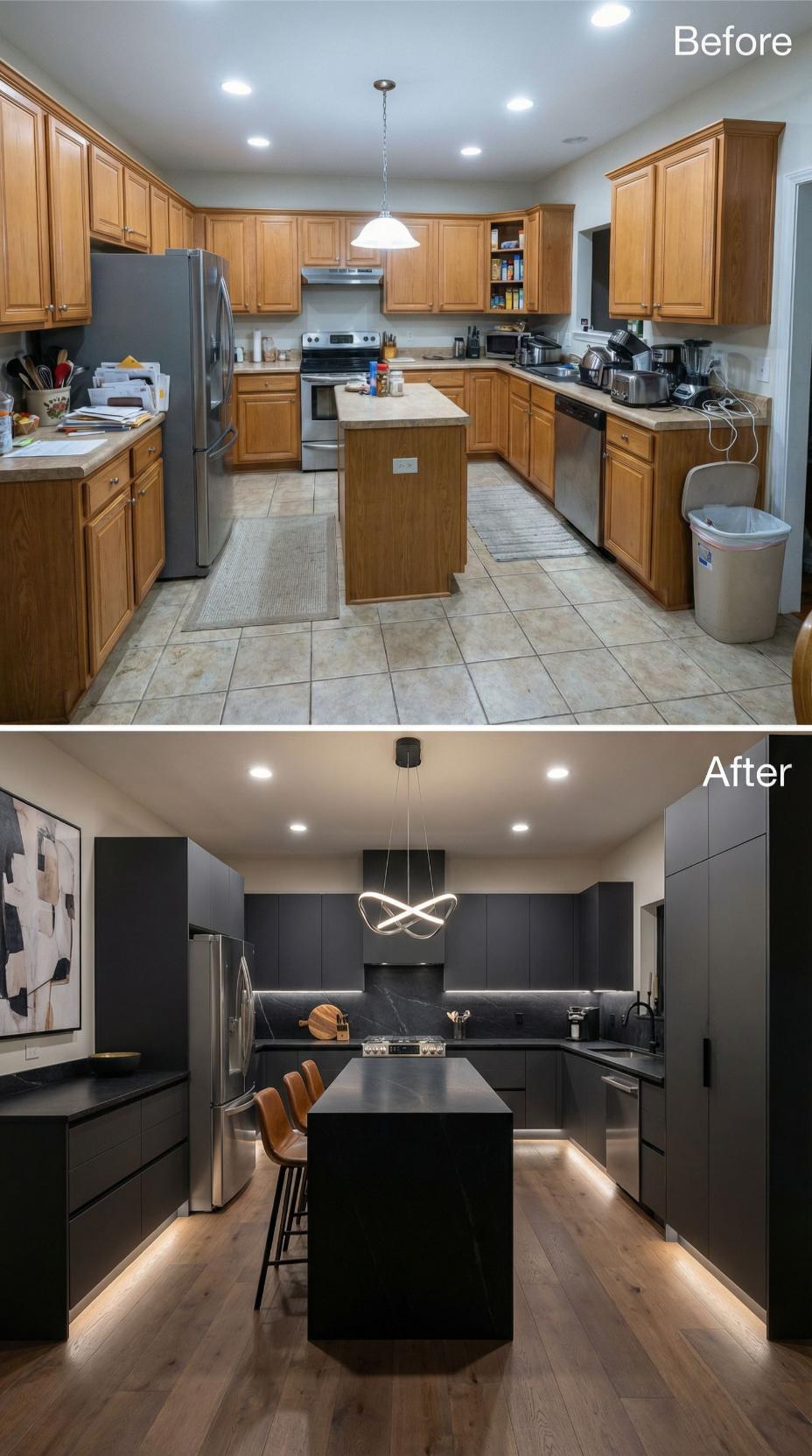 Dark charcoal cabinetry transforms this builder grade kitchen into a sophisticated culinary haven. Handleless upper cabinets create clean lines while warm wood flooring softens the dramatic palette. Under-cabinet LED strips and a sculptural pendant light elevate the ambiance beyond typical contractor-installed fixtures. The extended island now serves as both workspace and casual dining zone with integrated seating.