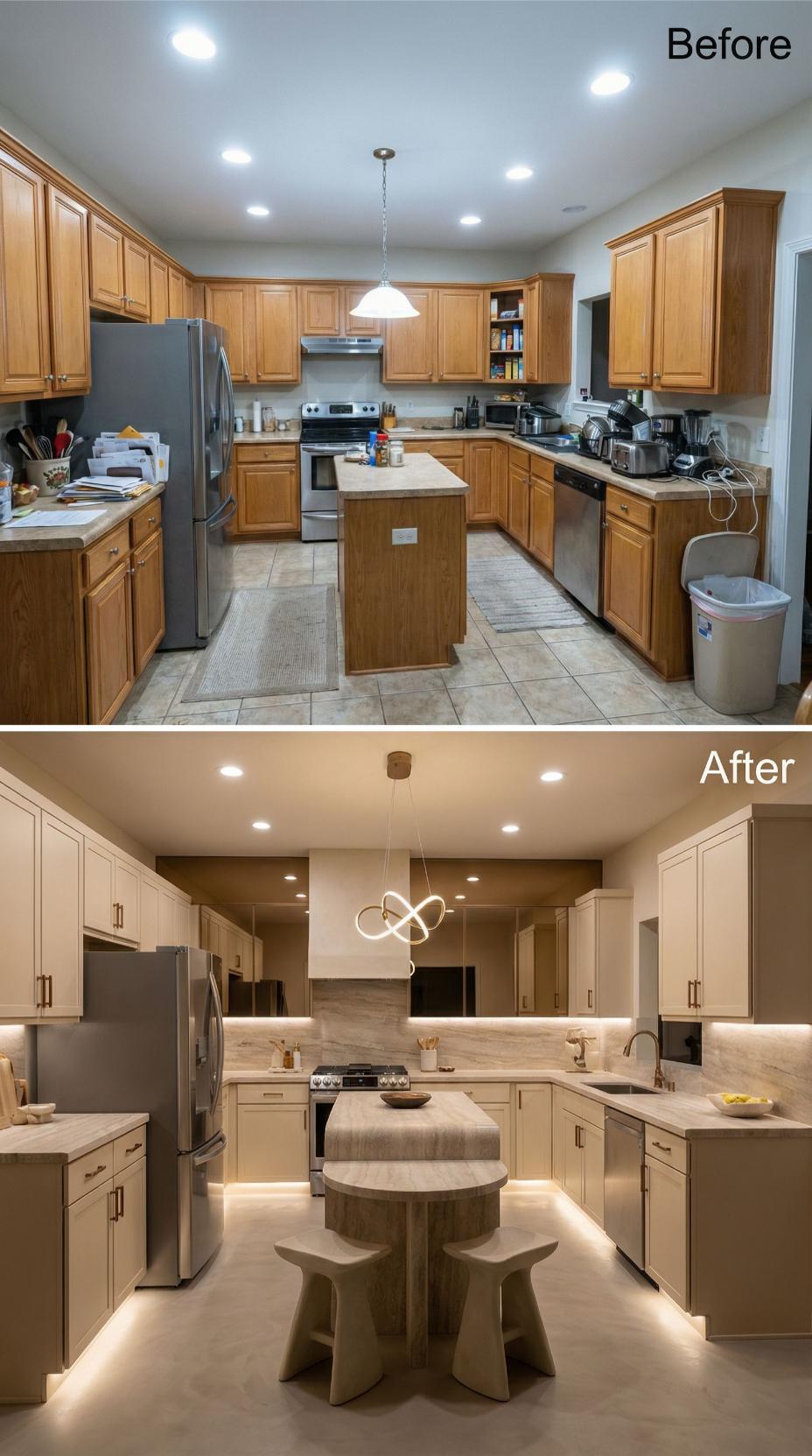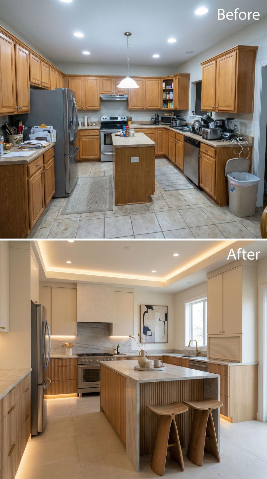 Warm honey oak cabinets and tile countertops gave way to sleek contemporary design featuring cream flat-panel cabinetry with integrated LED strip lighting. Natural stone waterfall countertops anchor the expanded island, while fluted wood accent panels add textural warmth. The transformation eliminated visual clutter through streamlined hardware and created sophisticated ambiance with layered lighting throughout the space.