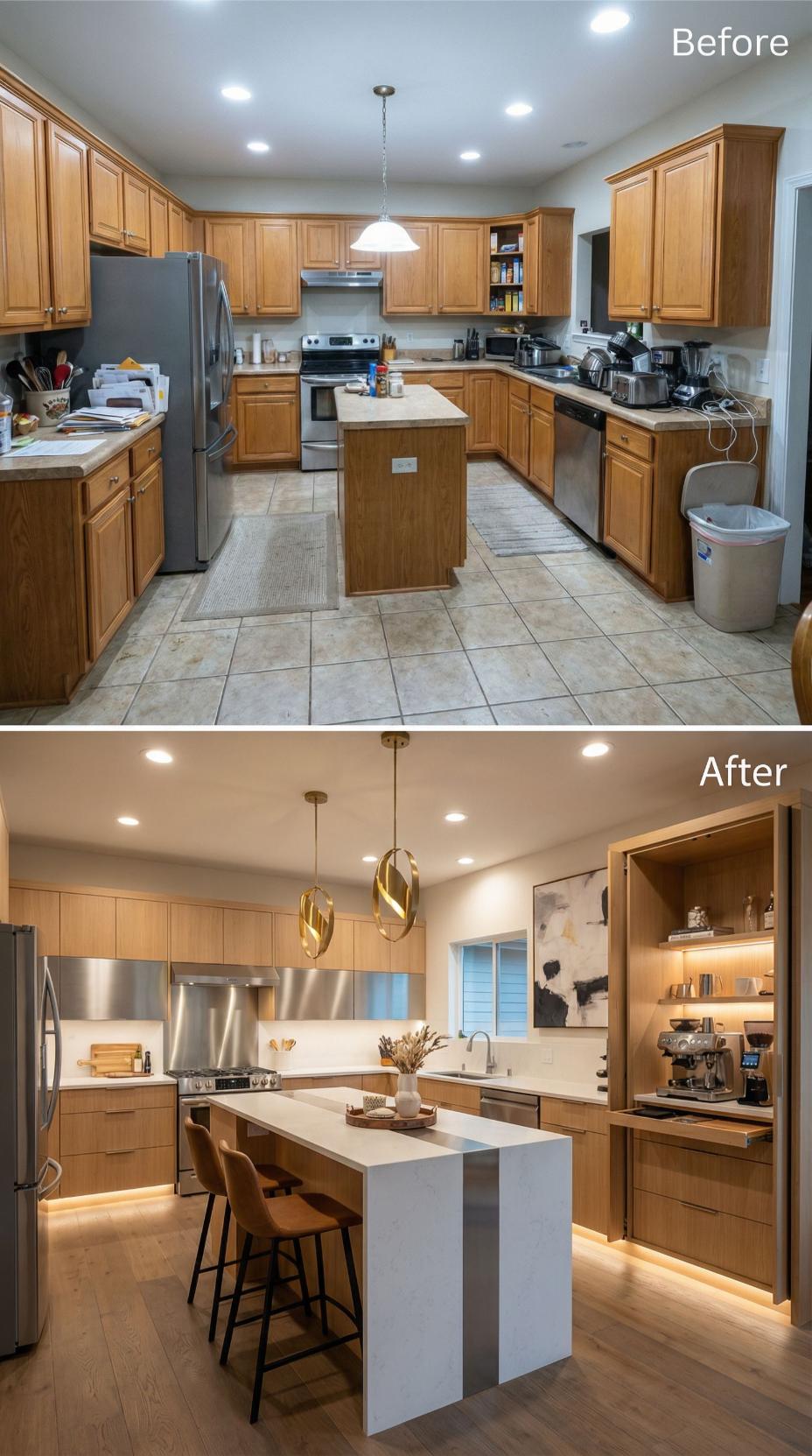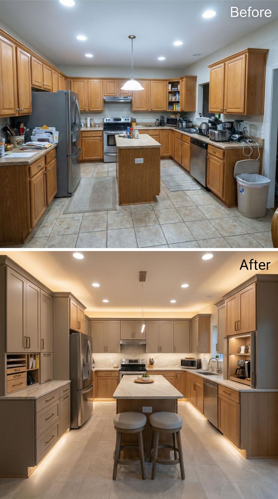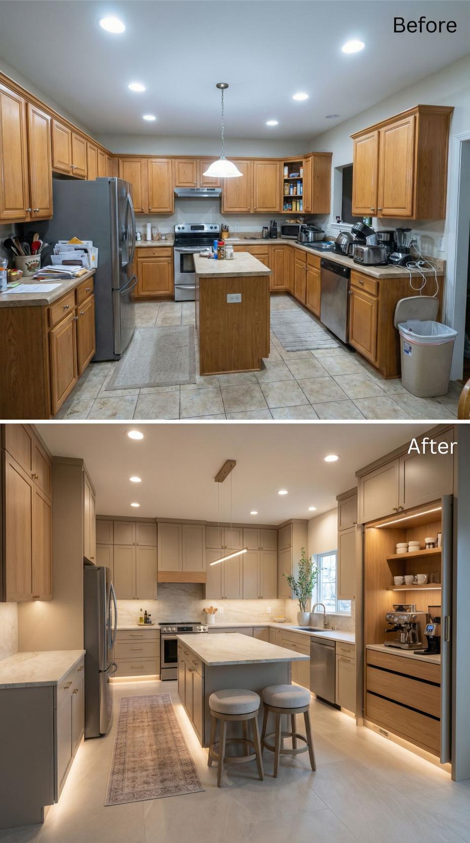 Warm taupe cabinetry replaces dated honey oak, creating sophisticated vertical lines that extend to the ceiling. Under-cabinet LED strips illuminate pristine quartz countertops, while a dedicated coffee station with walnut accents adds functional luxury. Two-toned bar stools complement the neutral palette, transforming this builder grade kitchen into an entertaining-ready space with seamless storage solutions and refined finishes.
