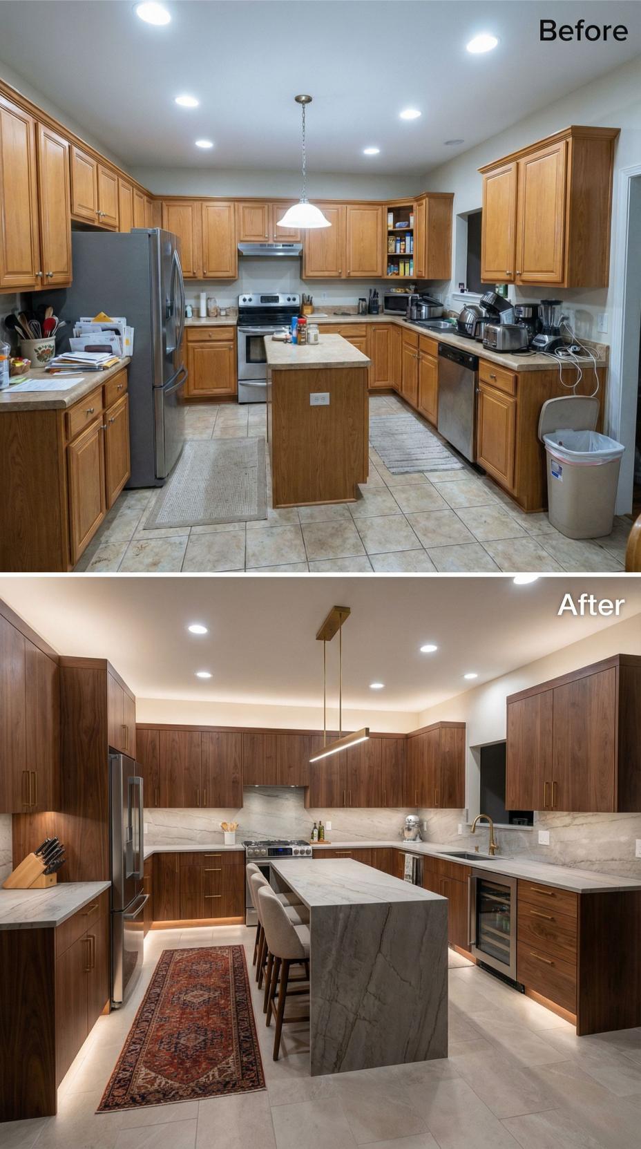 This stunning transformation elevates a builder grade kitchen into a sophisticated culinary space with sleek design elements. Warm wood cabinetry pairs beautifully with crisp white quartz countertops, while modern brass pendant lights replace dated fixtures. Under-cabinet LED lighting creates ambiance, and the extended island with seating transforms the layout into an entertaining hub perfect for modern living.