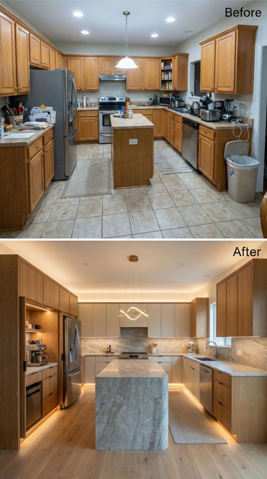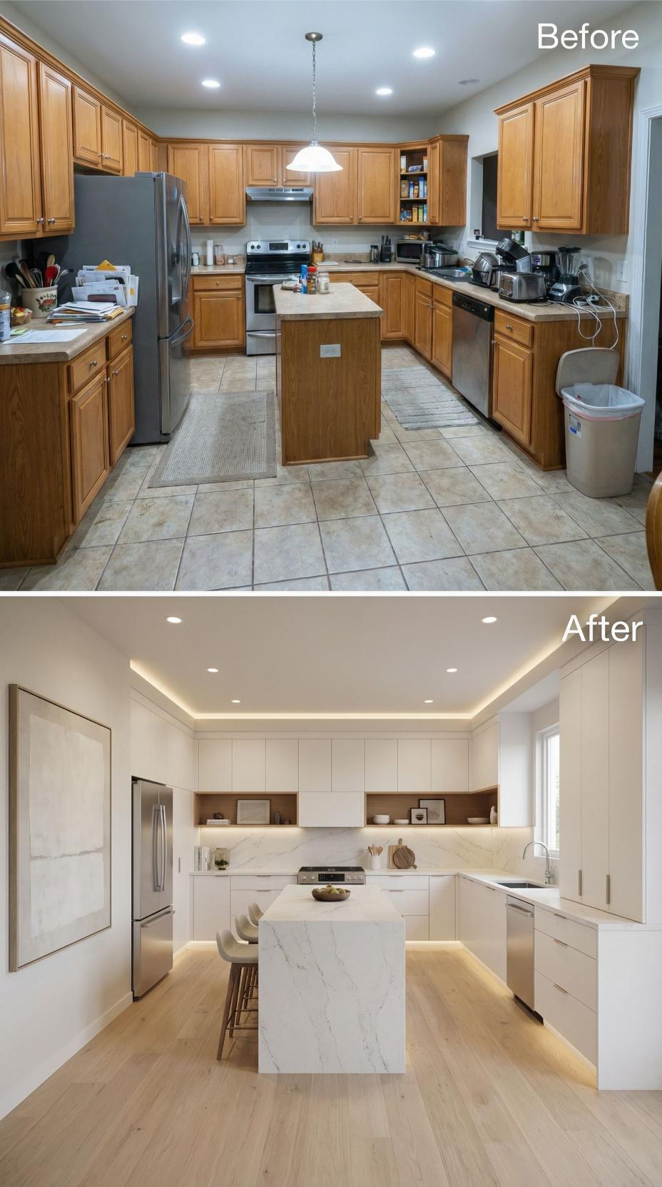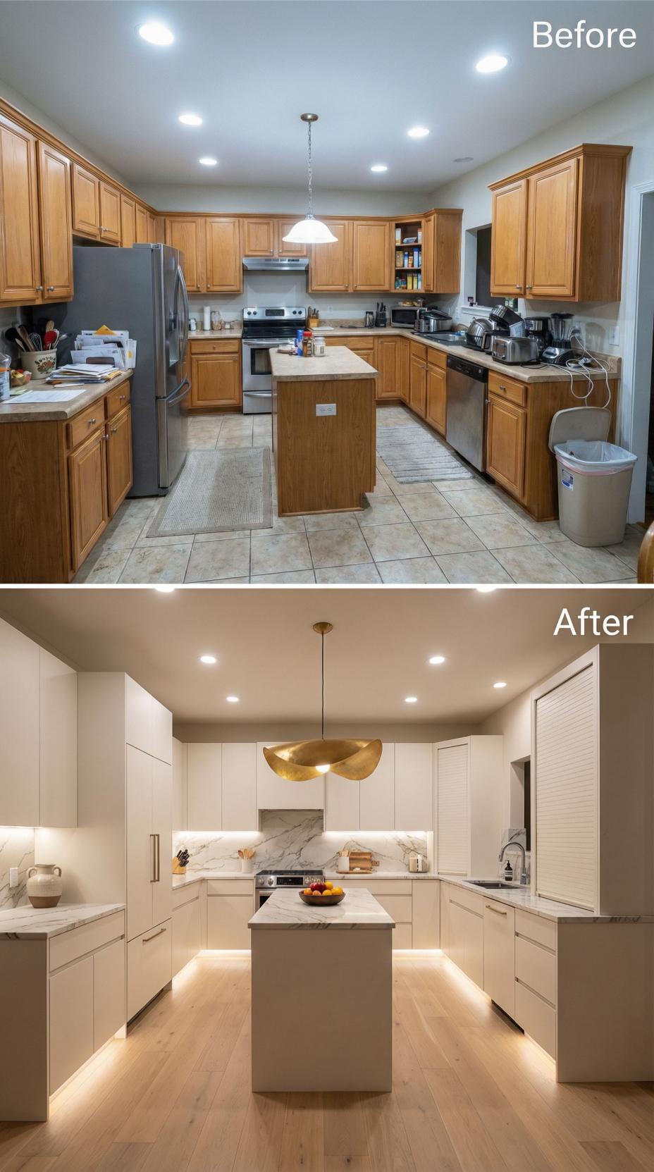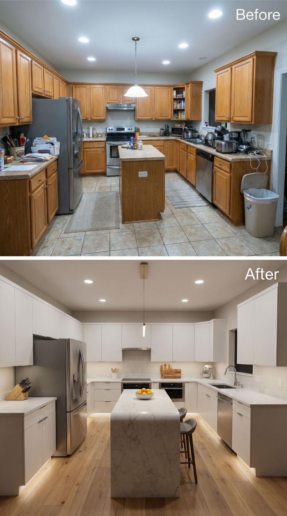 Warm honey oak cabinets and beige tile floors gave way to streamlined white flat-panel cabinetry and rich hardwood planks in this stunning transformation. The cramped U-shaped layout opened up with a spacious waterfall-edge island, while pendant lighting and marble-look countertops elevated the entire aesthetic. Under-cabinet LED strips now illuminate the workspace, creating a sophisticated modern sanctuary.