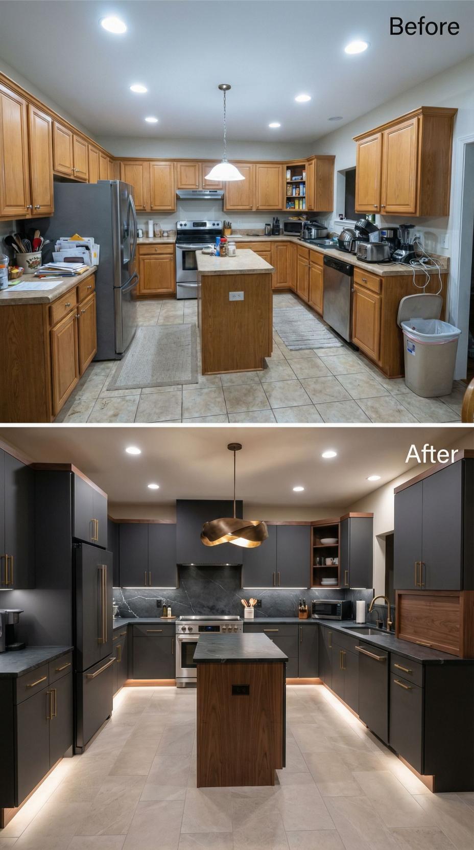 Bold charcoal cabinets completely transformed this builder grade kitchen from dated honey oak into a striking contemporary showpiece. Dark granite countertops and a dramatic veined marble backsplash create luxurious contrast against warm wood accents on the island. Integrated LED toe-kick lighting and a sculptural brass pendant elevate the space with sophisticated ambient illumination that highlights the seamless modern design.