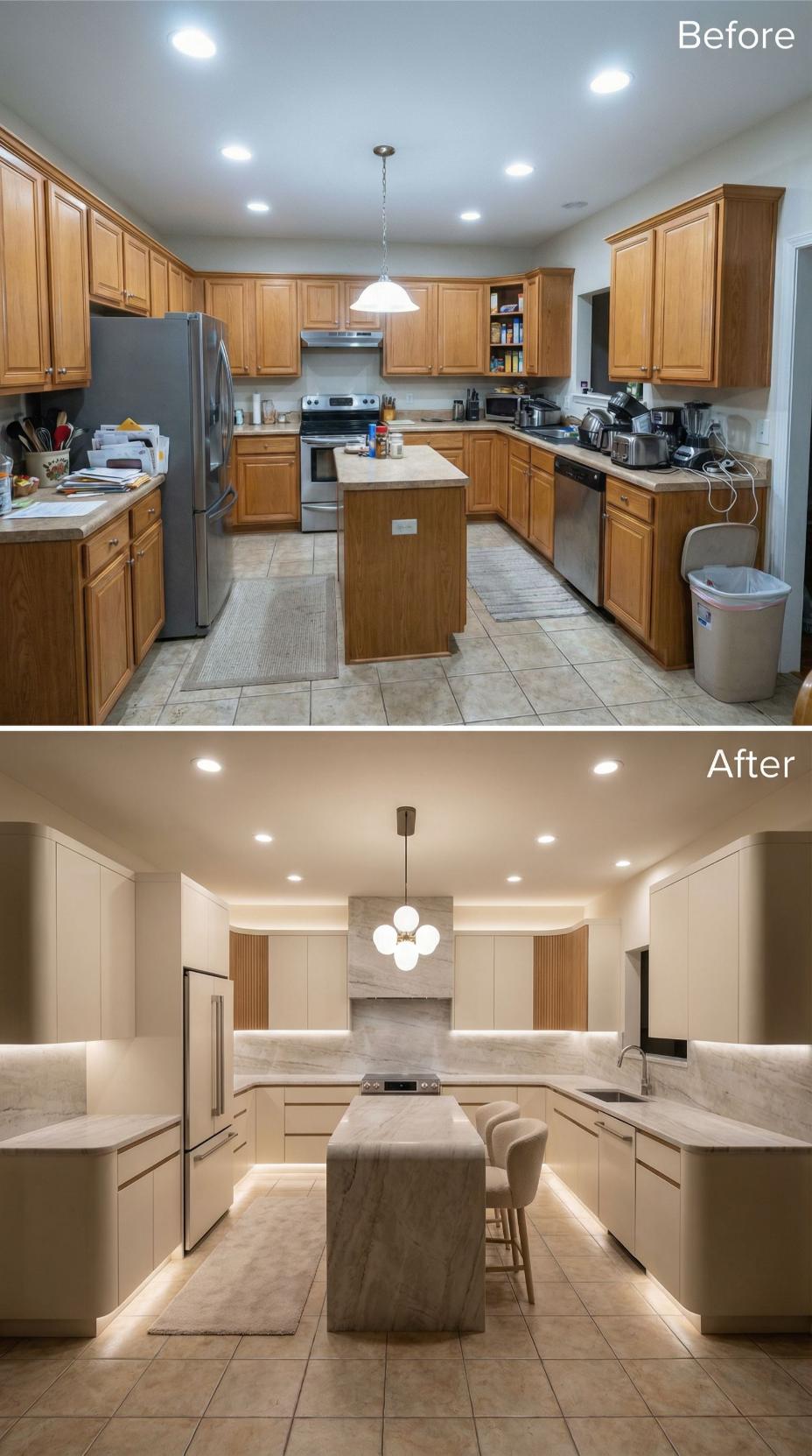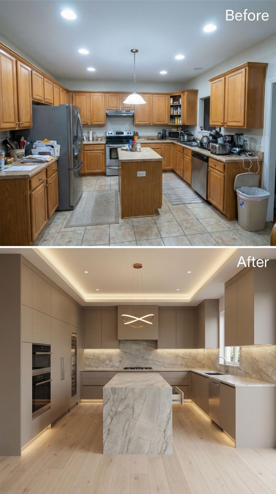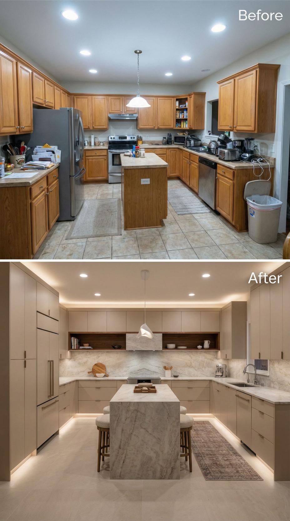 Warm beige flat-panel cabinetry replaces traditional raised-panel oak, creating clean lines throughout this transformed space. Dramatic marble countertops and backsplash elevate the entire aesthetic, while integrated LED strip lighting adds sophisticated ambiance. The redesigned island now features waterfall edges and provides elegant seating, completely reimagining the kitchen’s functionality and visual appeal.