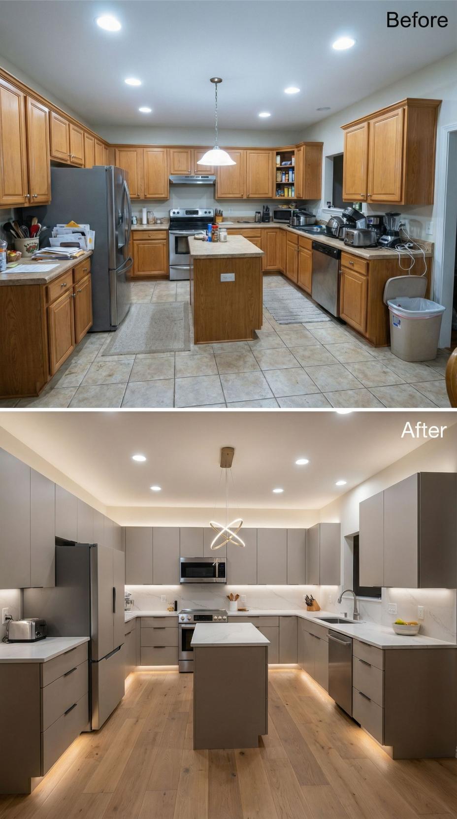 Warm wood cabinets and beige tile floors gave way to sleek gray cabinetry with stunning under-cabinet lighting that transforms the entire aesthetic. White quartz countertops create striking contrast against the contemporary flat-panel doors, while strategic accent lighting beneath the island adds dramatic ambiance. Hardwood floors and a coffered ceiling with integrated lighting complete this sophisticated transformation from ordinary to extraordinary.