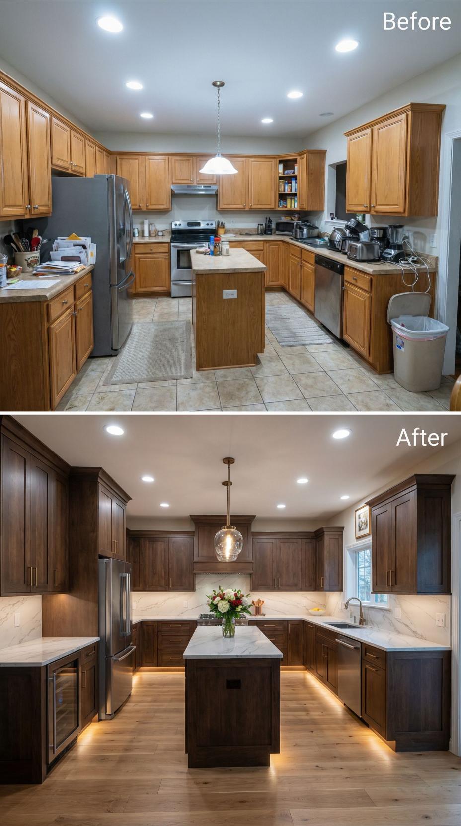 Rich espresso cabinetry transforms this builder grade kitchen into a luxurious culinary space with remarkable depth and warmth. White marble countertops provide stunning contrast against the dark wood, while under-cabinet lighting creates ambient glow. Hardwood flooring replaces dated tile, and a dramatic globe pendant illuminates the expanded island workspace for both cooking and entertaining.