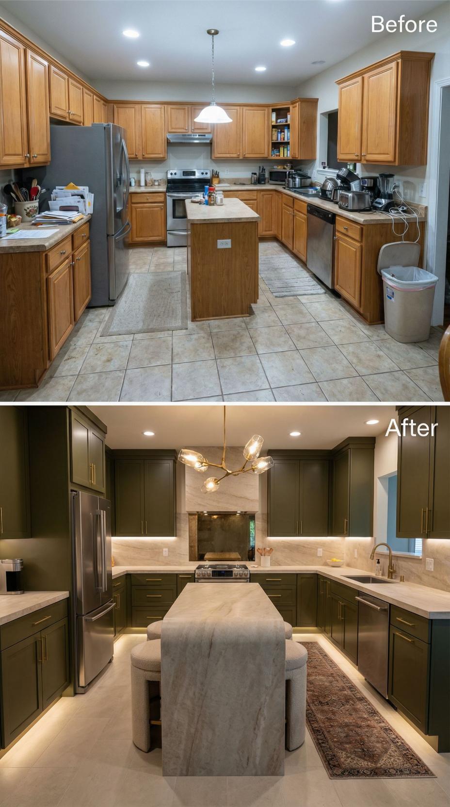 Natural stone waterfall countertops and sleek dark green cabinetry completely transformed this builder grade kitchen into a luxurious culinary haven. Under-cabinet LED lighting illuminates the marble backsplash while a modern brass chandelier replaces basic pendant lighting. The expanded island with integrated seating creates an elegant entertaining space that elevates the entire room’s functionality and style.