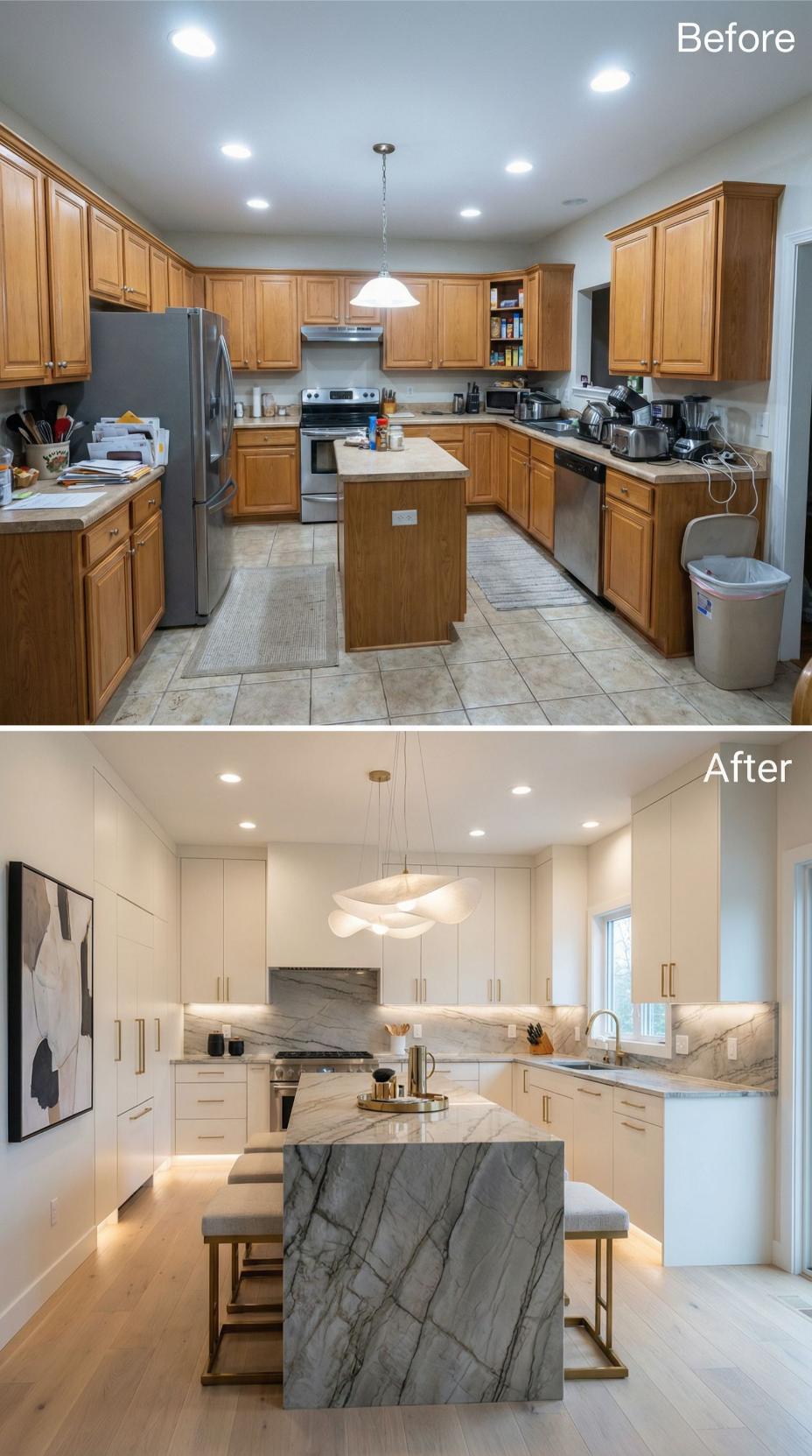 Warm wood cabinetry and tile floors gave way to a stunning modern transformation featuring crisp white minimalist cabinets with sleek marble countertops. Under-cabinet LED lighting creates ambient warmth while the dramatic brass pendant fixture commands attention above the waterfall-edge island. Wide-plank hardwood flooring and integrated appliances complete this builder grade kitchen’s evolution into contemporary luxury.