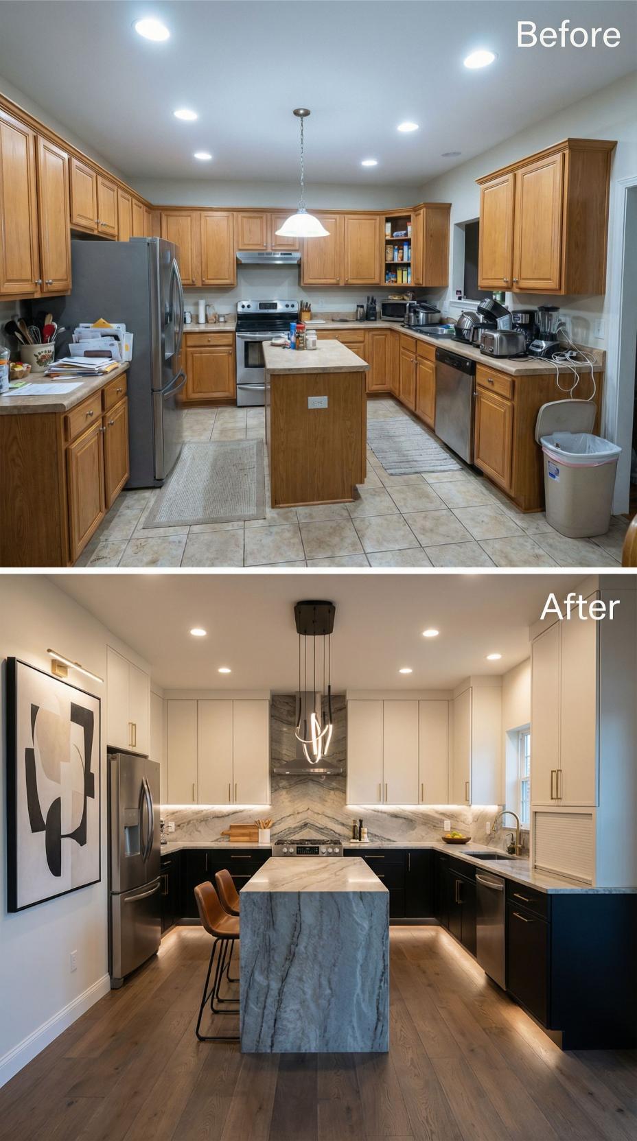 Dramatic black lower cabinets contrast beautifully with crisp white uppers, replacing the original builder grade kitchen’s honey oak cabinetry. Stunning marble countertops and a waterfall island create luxury focal points, while warm hardwood floors and sleek pendant lighting complete this sophisticated transformation. Under-cabinet LED strips illuminate the gorgeous marble backsplash, elevating every design element.