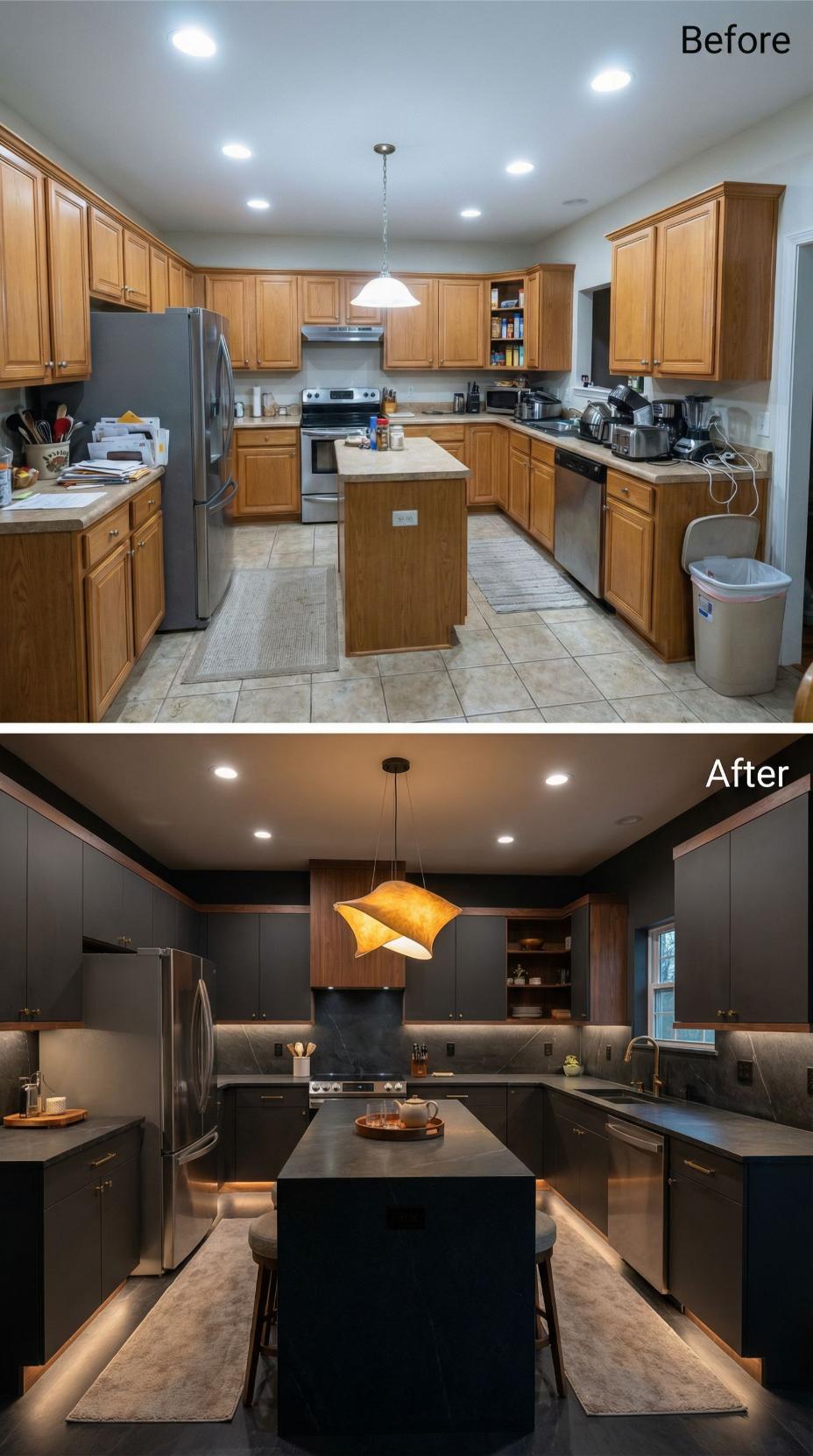 Dark charcoal cabinets completely transform this builder grade kitchen into a sophisticated culinary haven. Rich wood accents warm the sleek palette while dramatic lighting creates intimate ambiance. The expanded island anchors the space with luxurious black countertops, replacing cramped functionality with restaurant-quality style. Brass hardware and warm pendant lighting elevate every surface from mundane to magnificent.