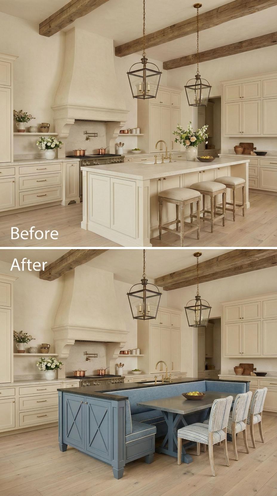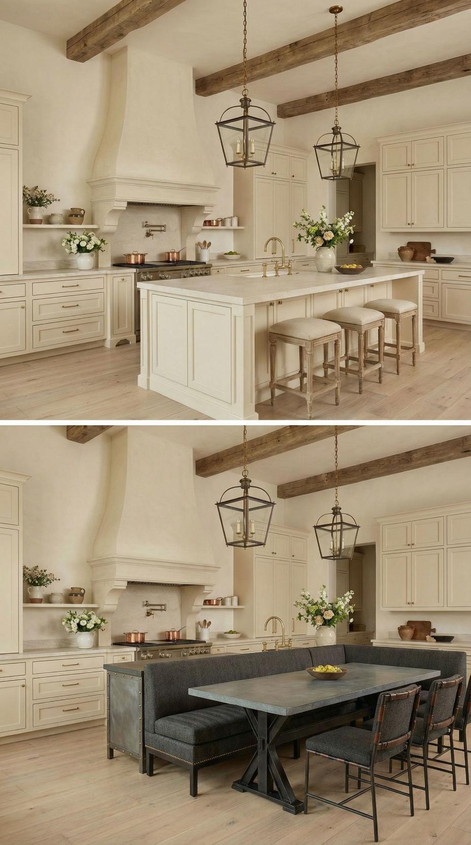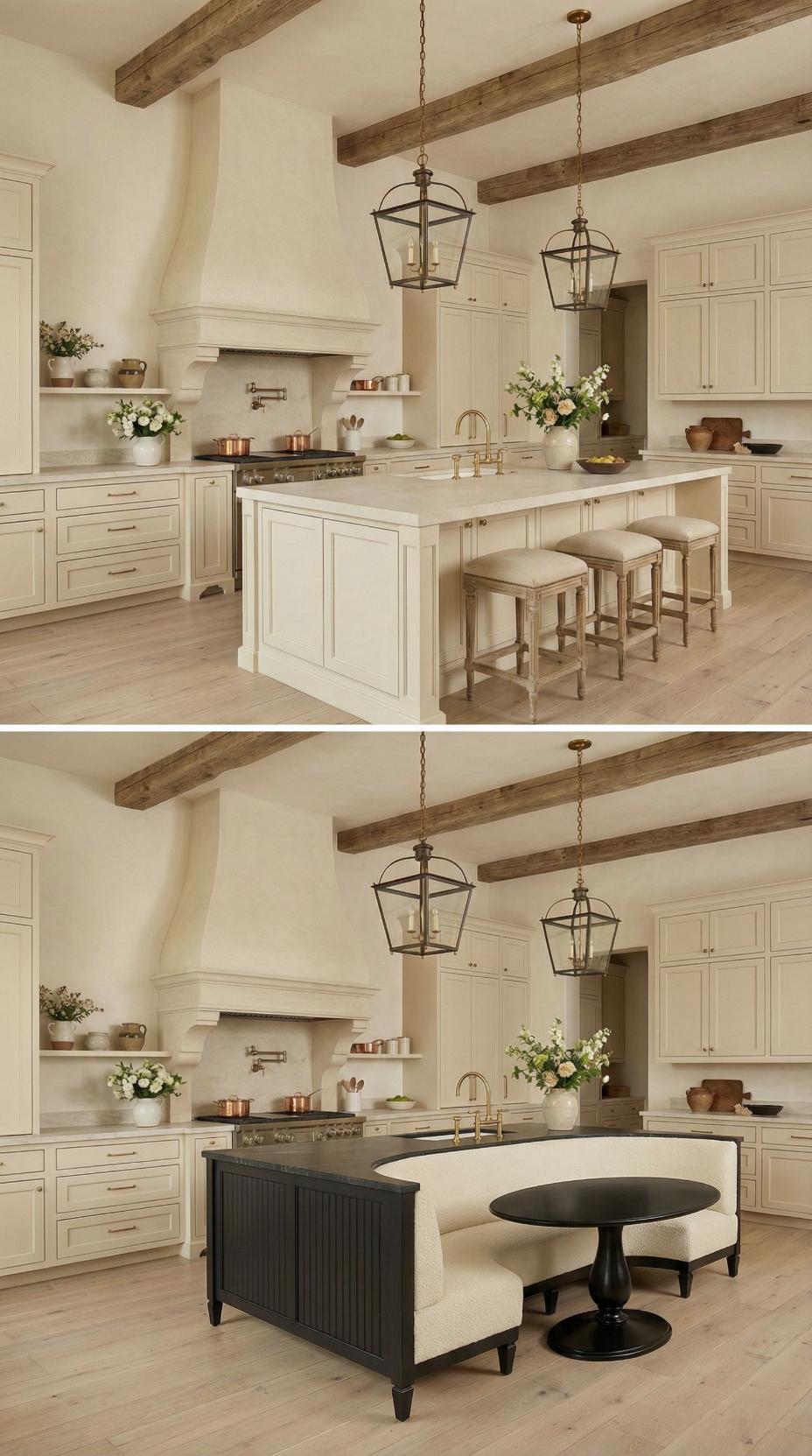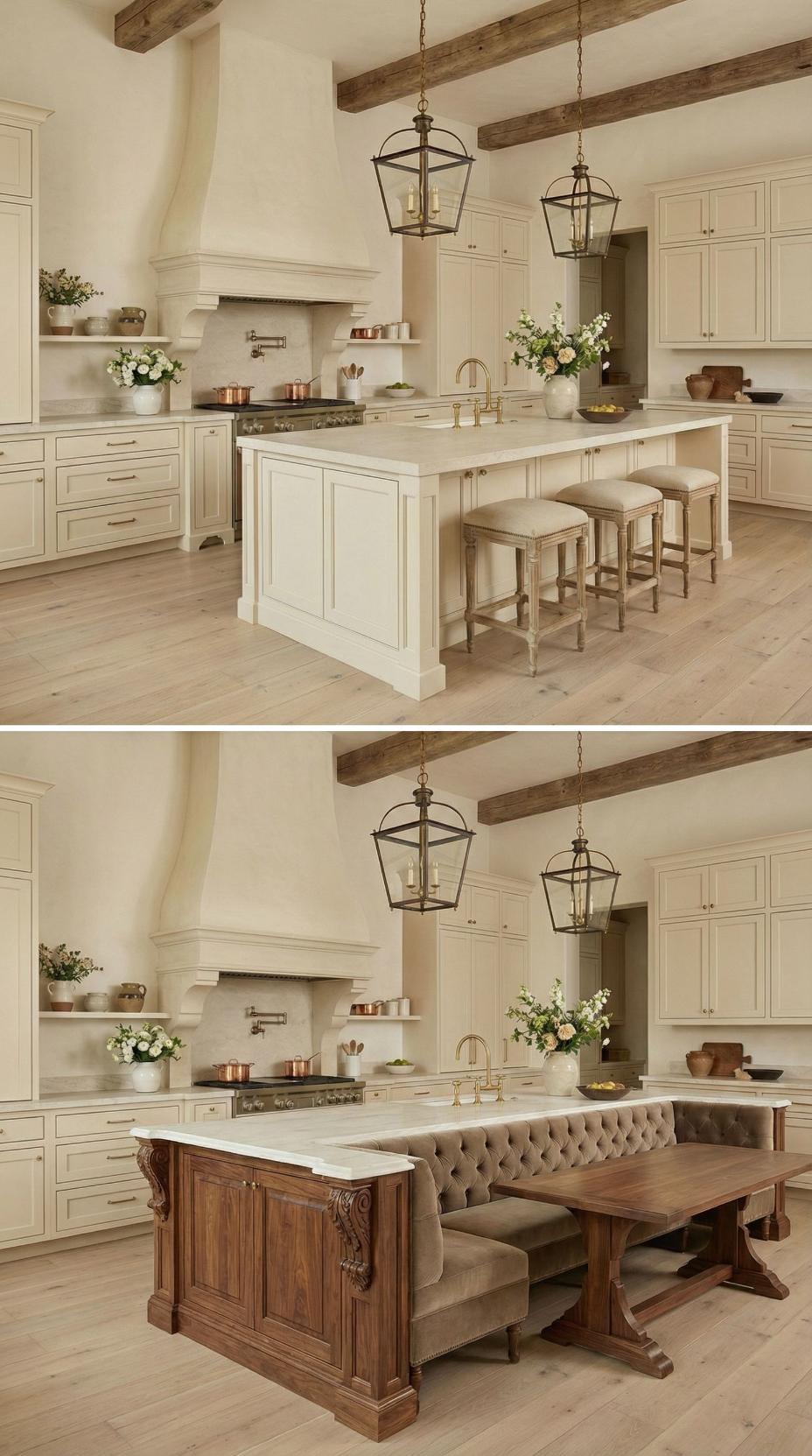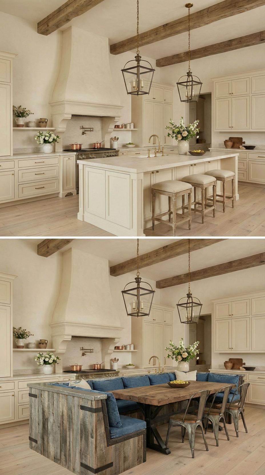 Gone are the basic bar stools that lined this French Country kitchen with plain island! A custom banquette with neutral linen cushions now wraps around one end, paired with a rustic wood dining table that extends the workspace into an intimate breakfast nook. Exposed ceiling beams and lantern-style pendants maintain the kitchen’s authentic charm while maximizing both seating capacity and comfort for family meals.