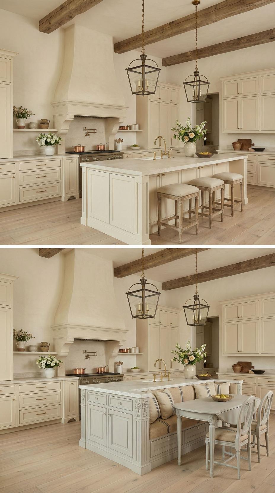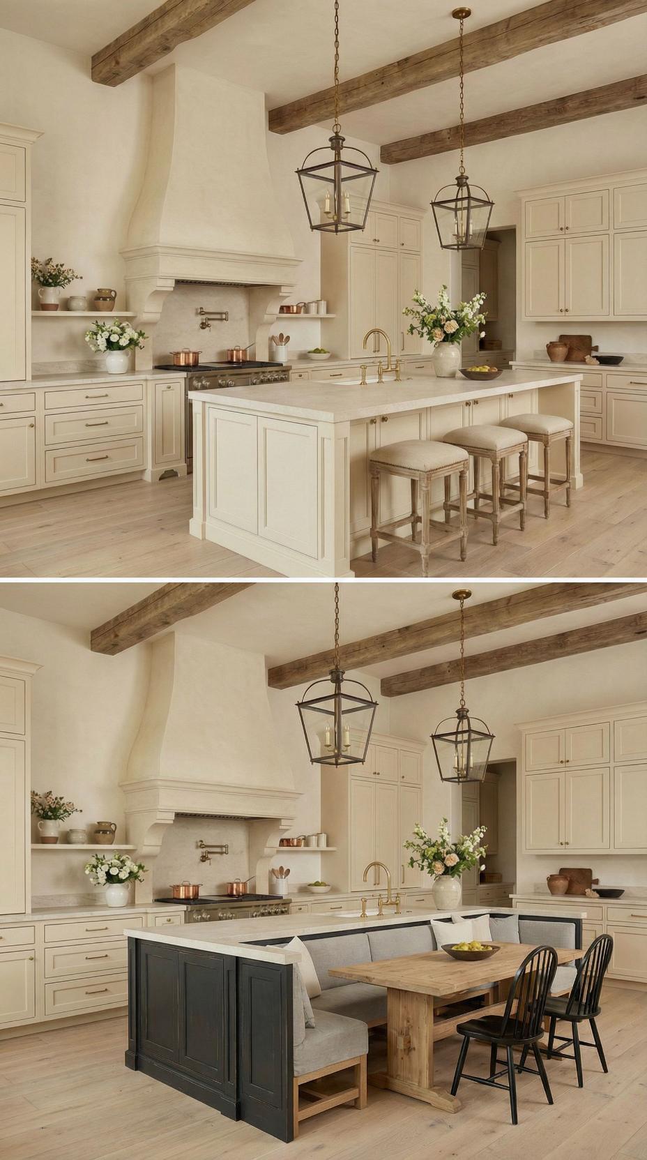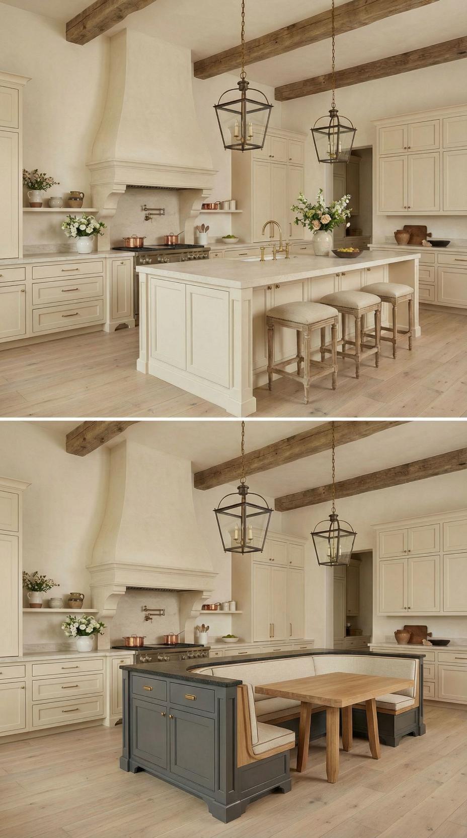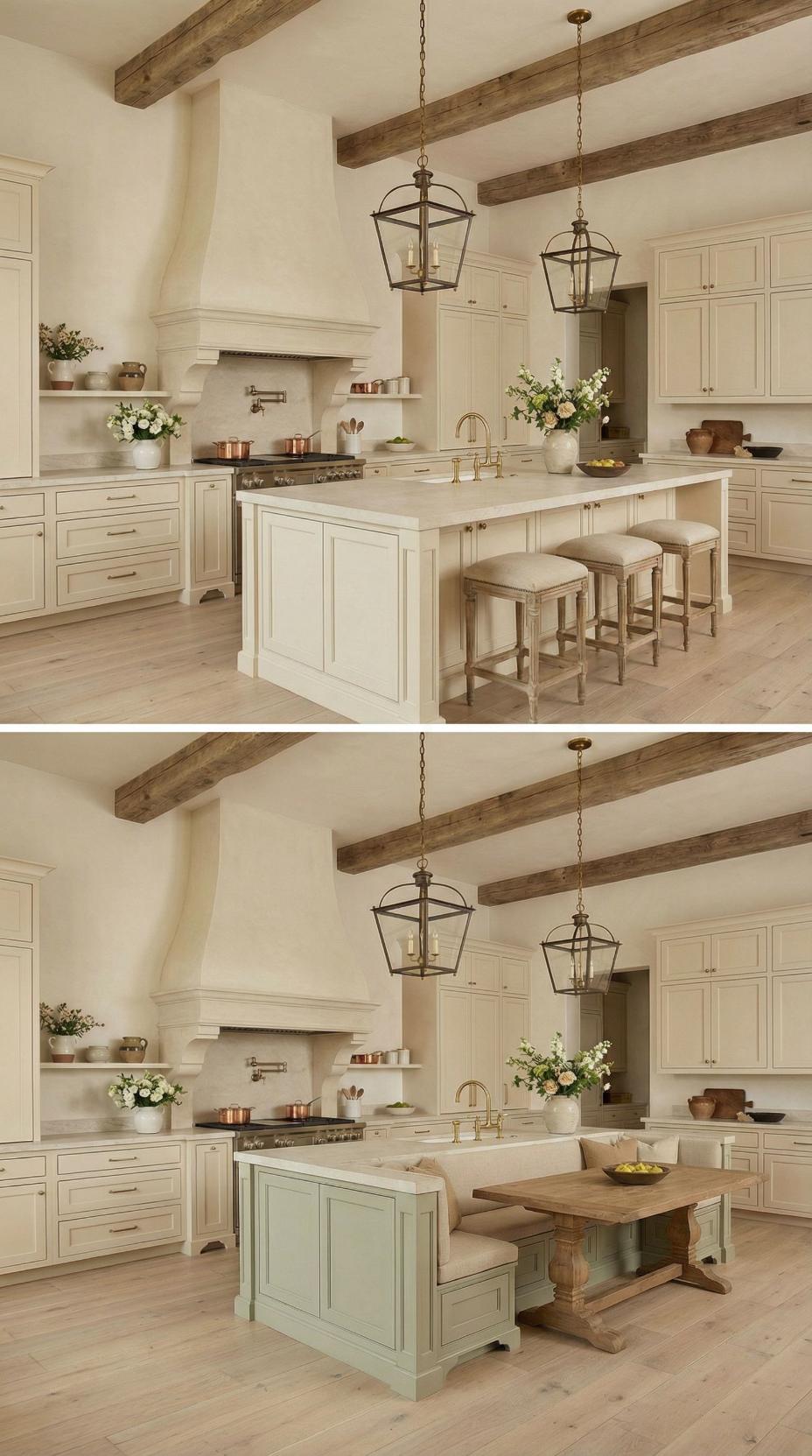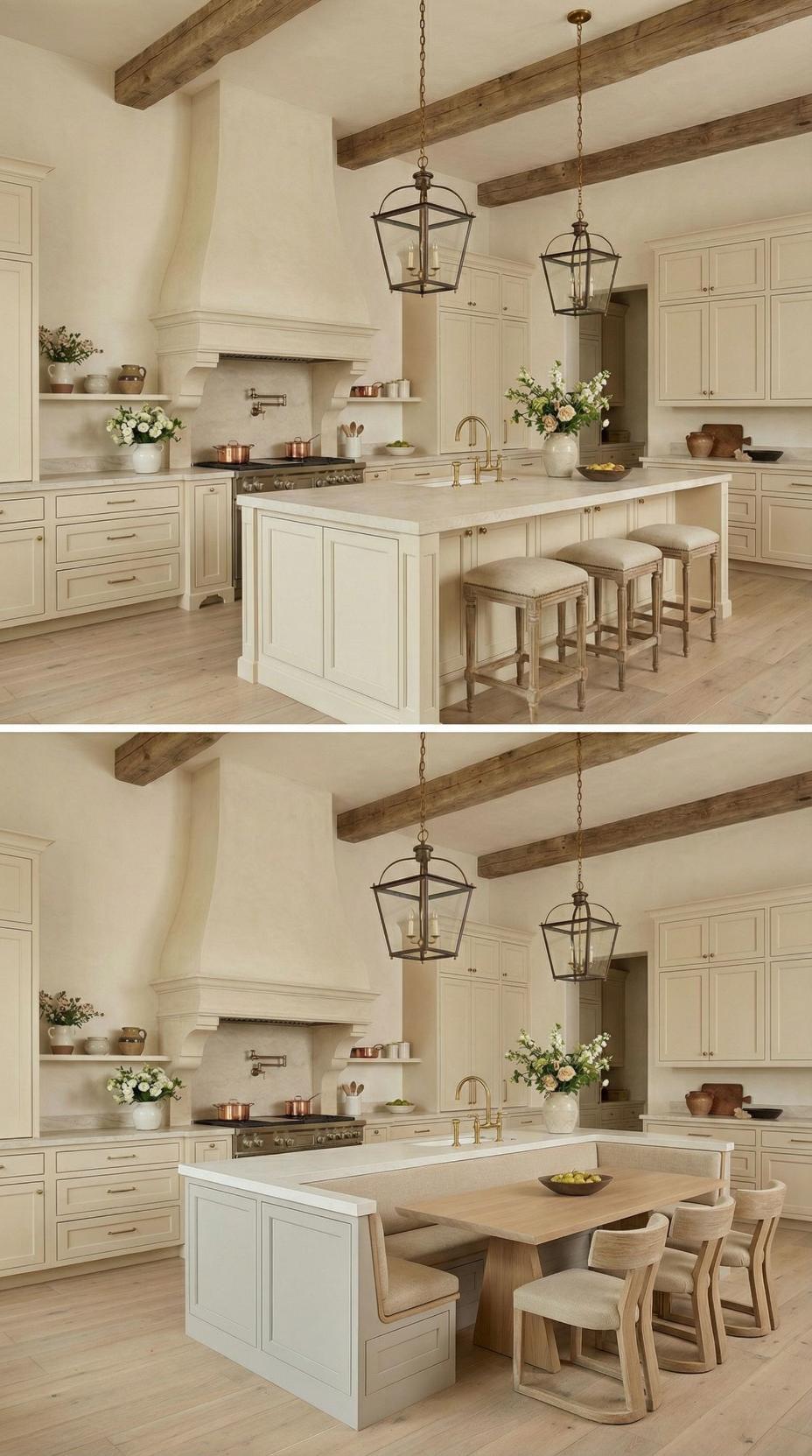 Gone are the basic bar stools that lined this French Country kitchen with plain island! A custom banquette with neutral linen cushions now wraps around one end, paired with a rustic wood dining table that extends the workspace into an intimate breakfast nook. Exposed ceiling beams and lantern-style pendants maintain the kitchen’s authentic charm while maximizing both seating capacity and comfort for family meals.
