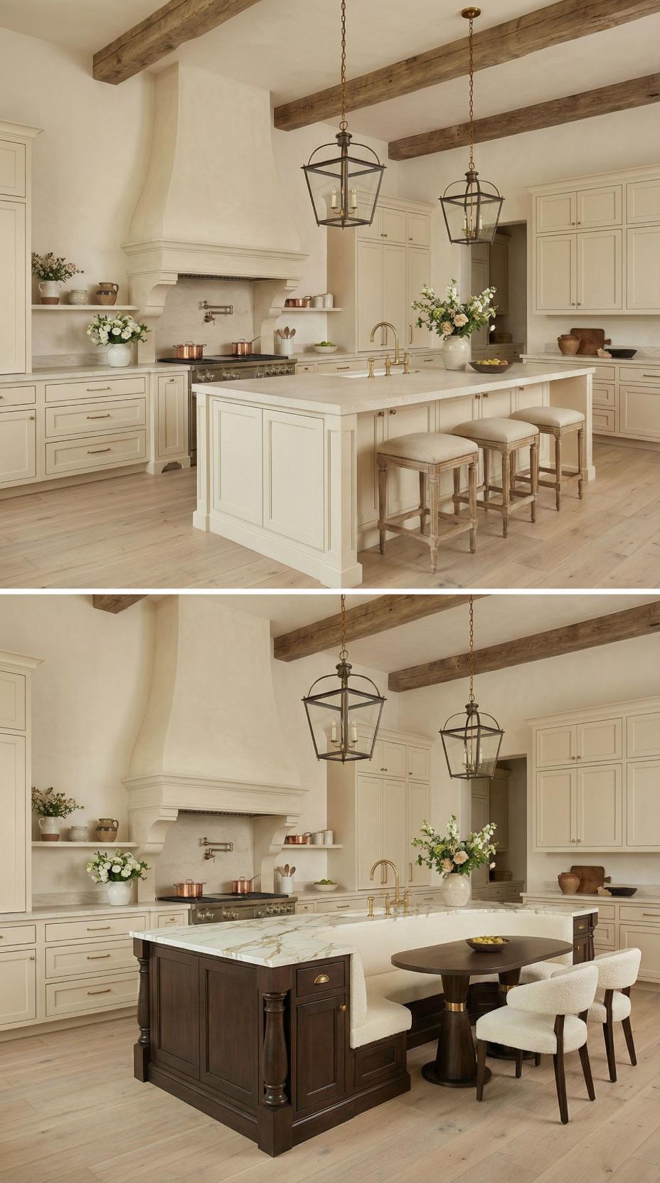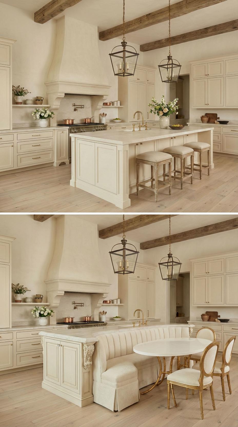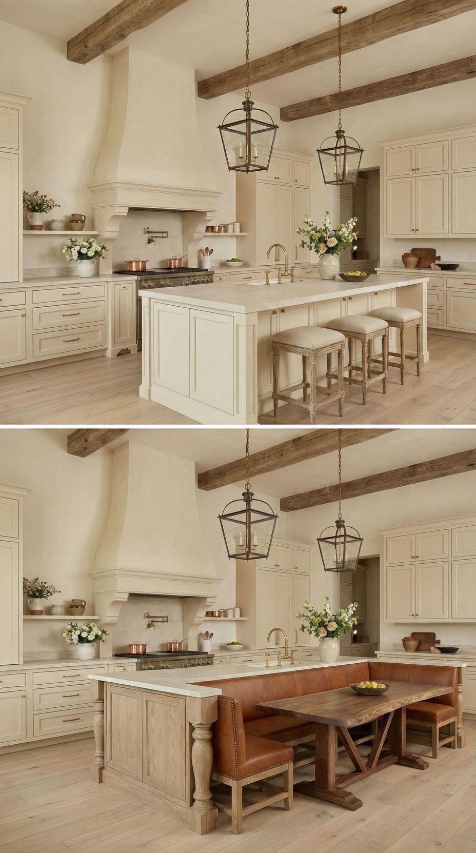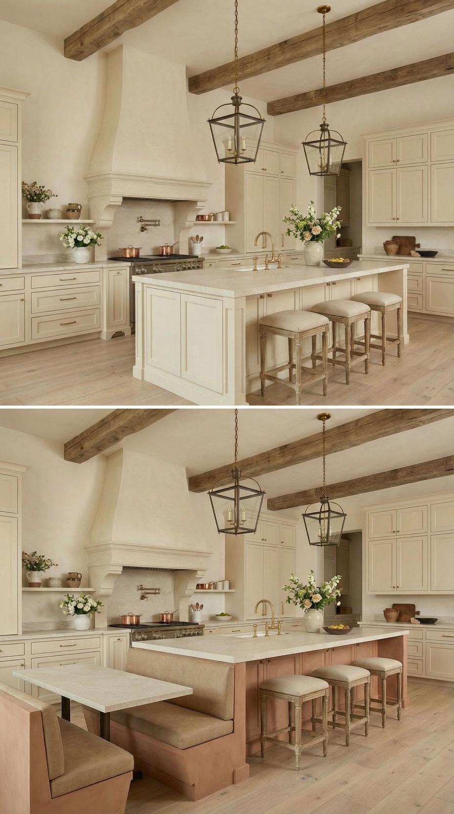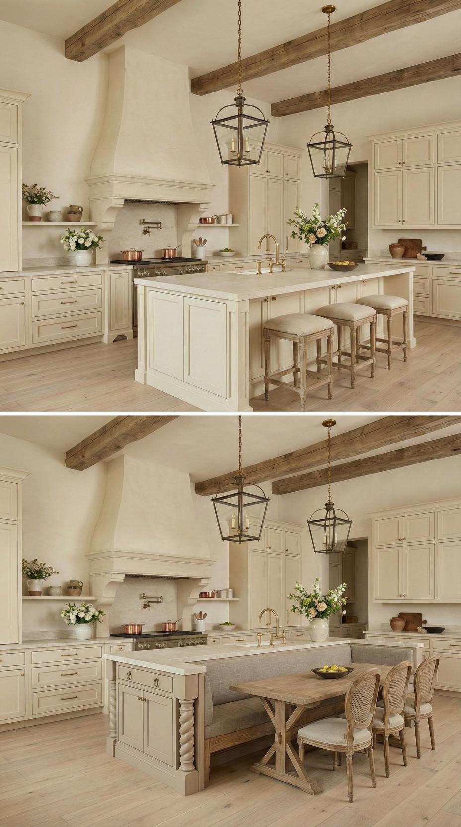 Gone are the basic bar stools that lined this French Country kitchen with plain island! A custom banquette with neutral linen cushions now wraps around one end, paired with a rustic wood dining table that extends the workspace into an intimate breakfast nook. Exposed ceiling beams and lantern-style pendants maintain the kitchen’s authentic charm while maximizing both seating capacity and comfort for family meals.