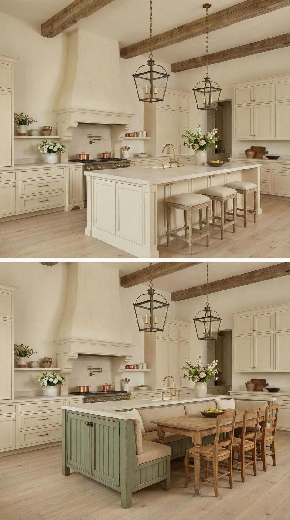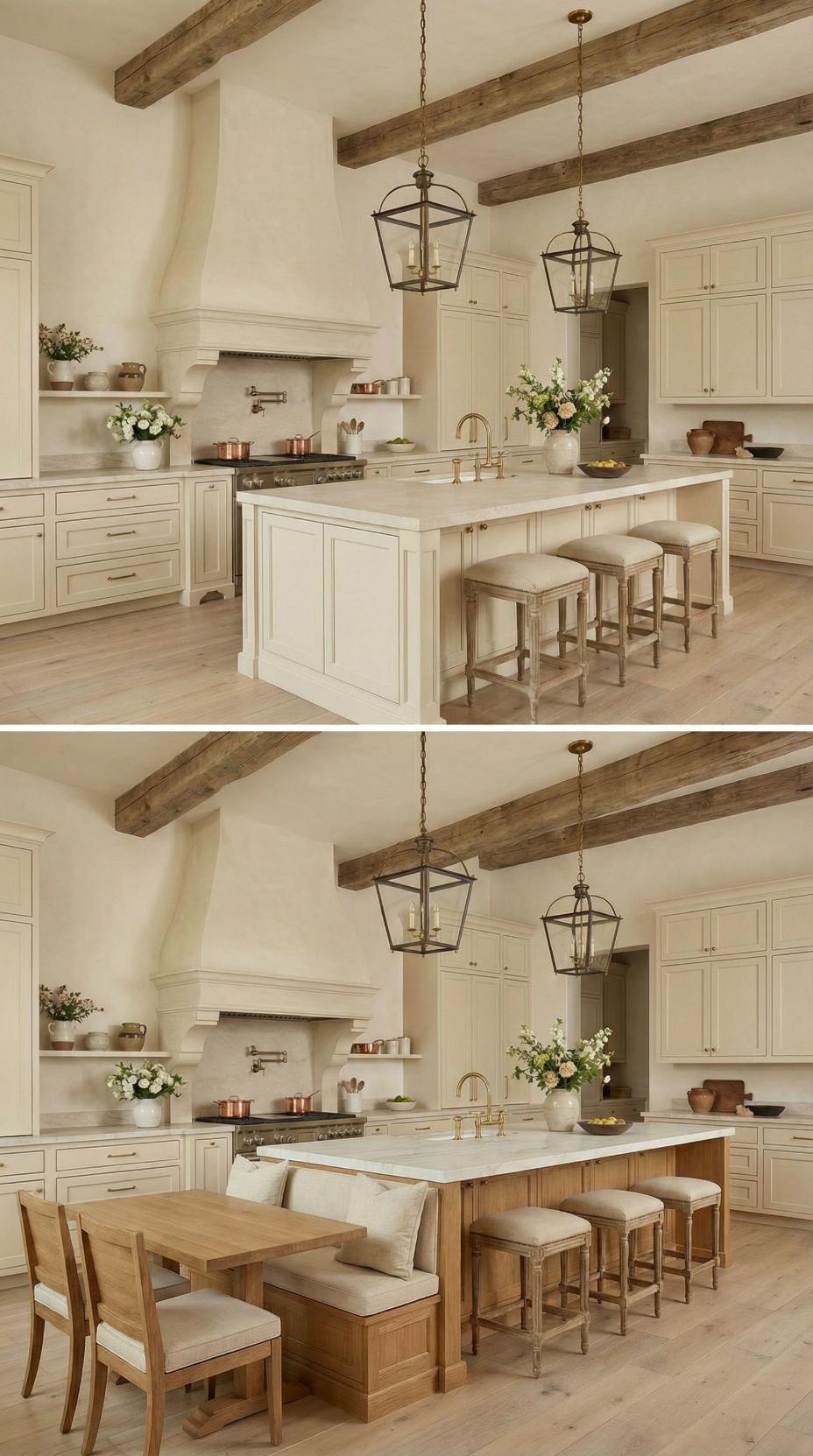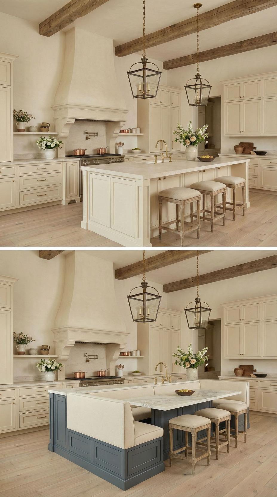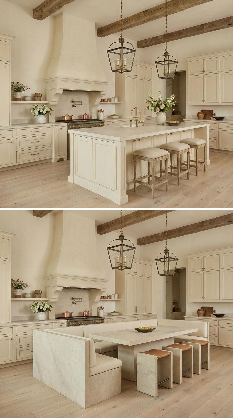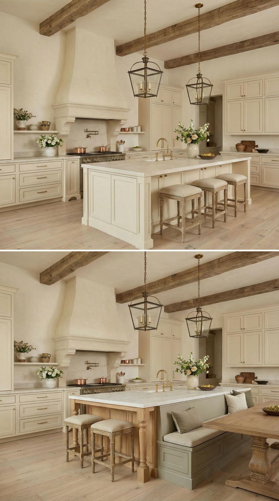 Gone are the basic bar stools that lined this French Country kitchen with plain island! A custom banquette with neutral linen cushions now wraps around one end, paired with a rustic wood dining table that extends the workspace into an intimate breakfast nook. Exposed ceiling beams and lantern-style pendants maintain the kitchen’s authentic charm while maximizing both seating capacity and comfort for family meals.