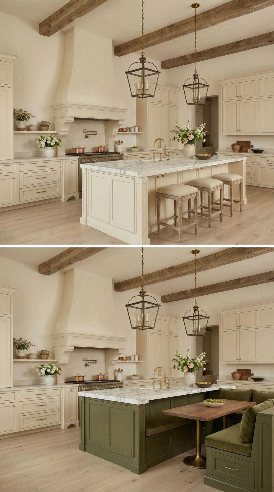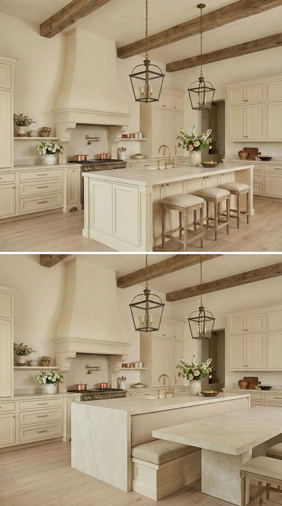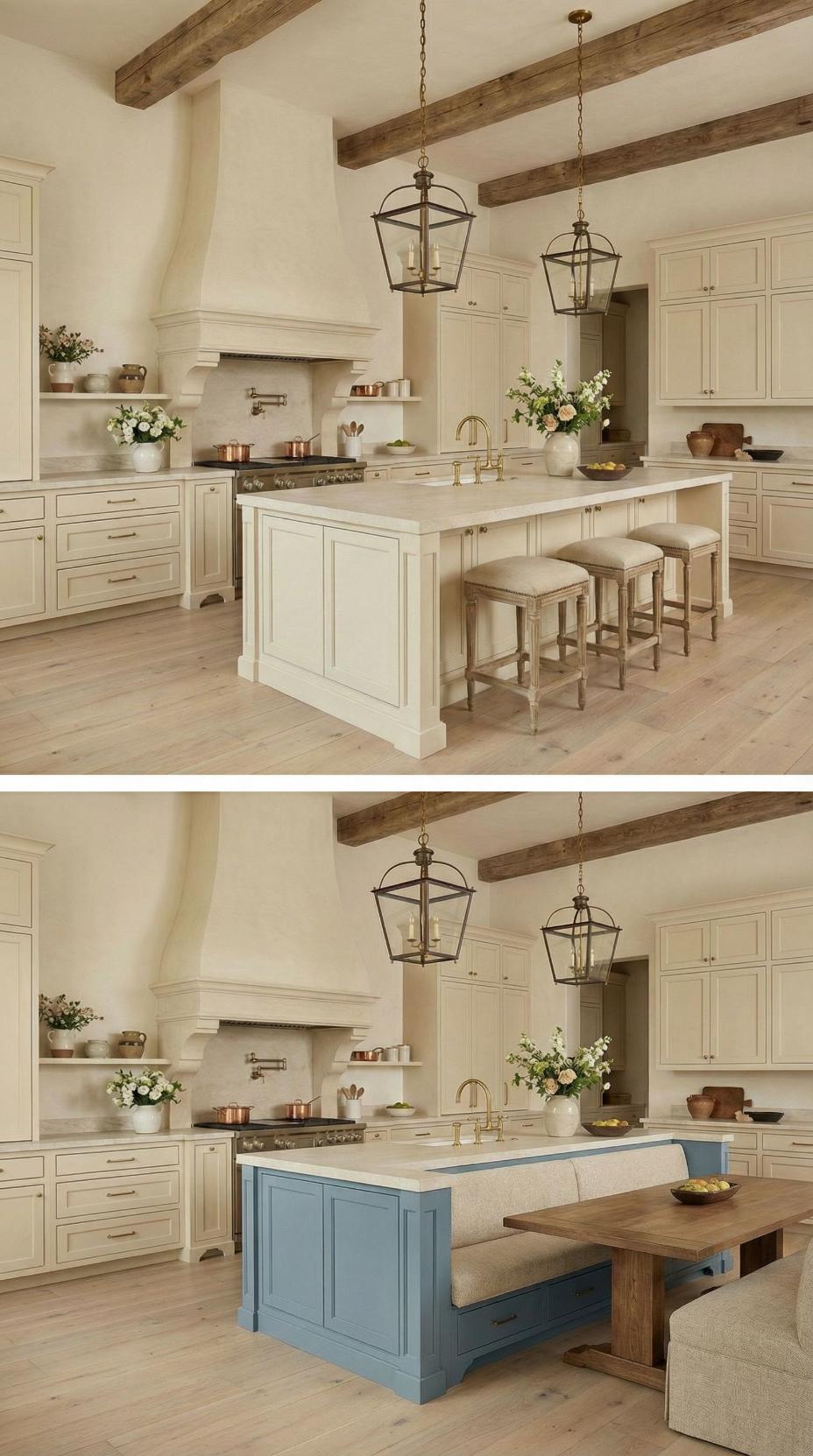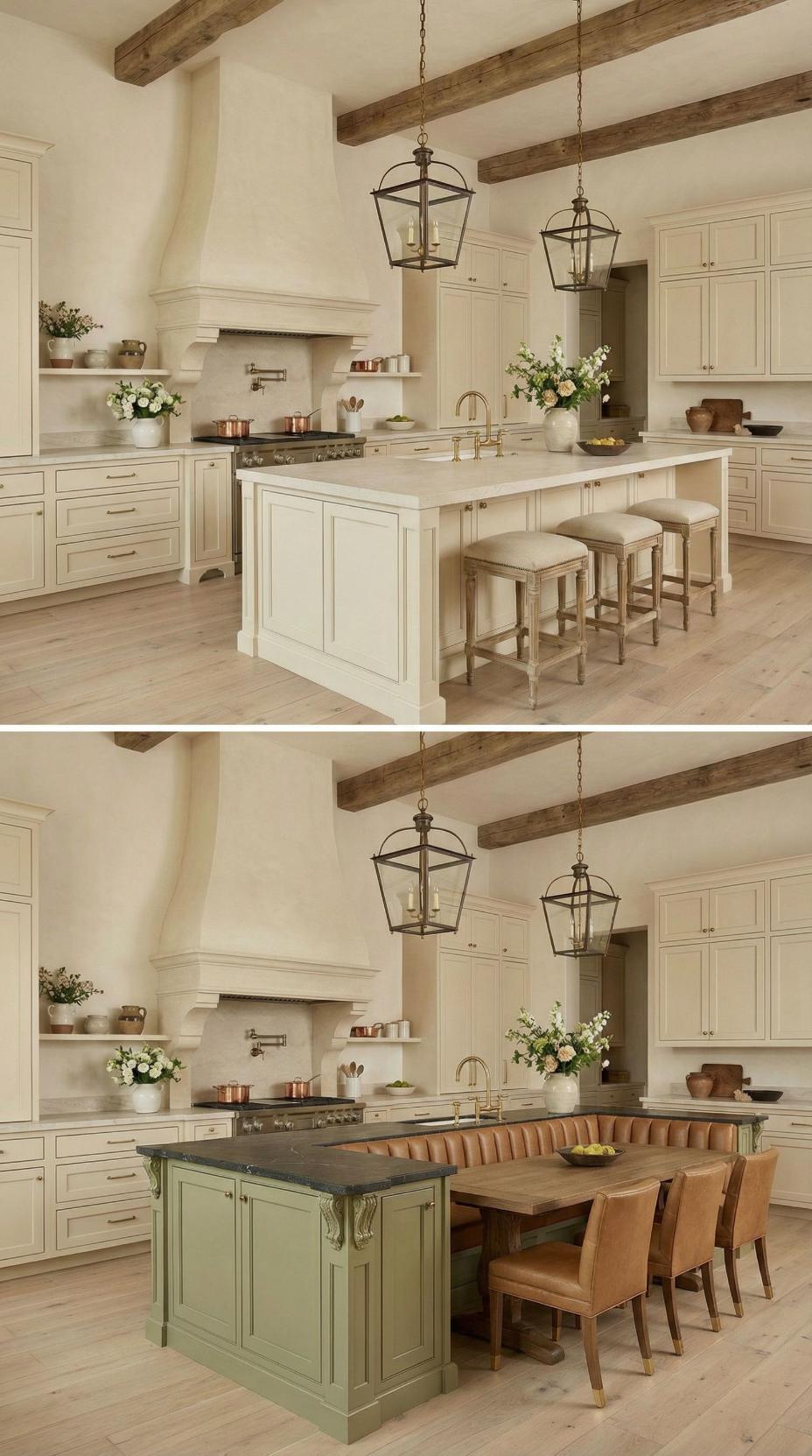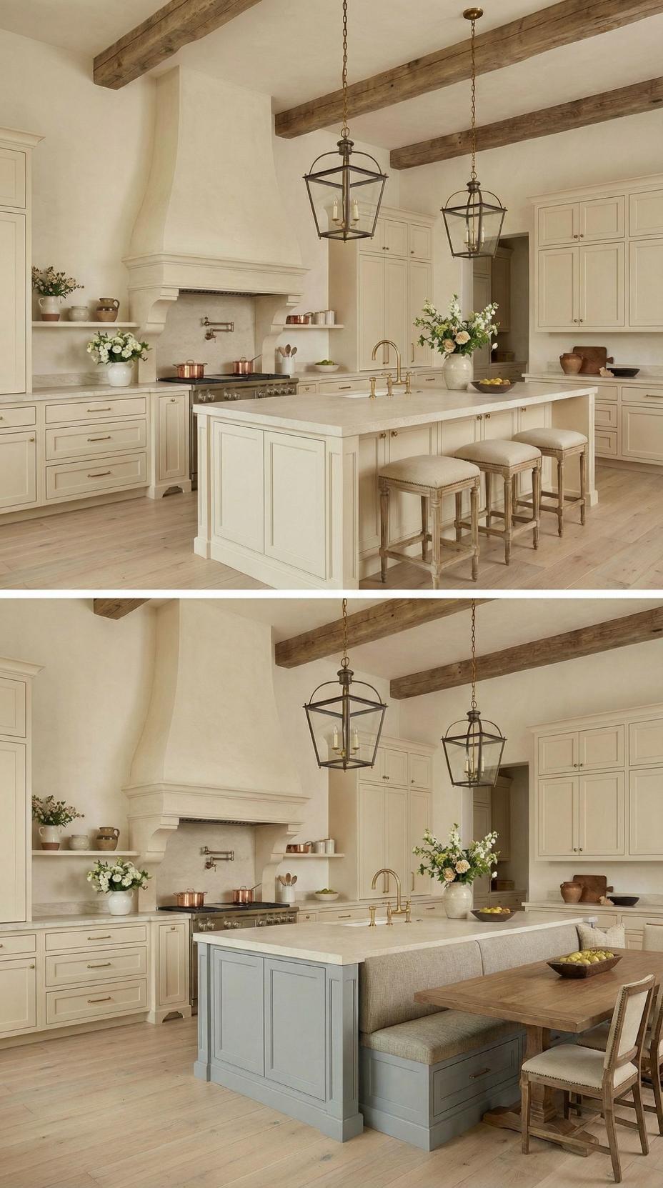 Gone are the basic bar stools that lined this French Country kitchen with plain island! A custom banquette with neutral linen cushions now wraps around one end, paired with a rustic wood dining table that extends the workspace into an intimate breakfast nook. Exposed ceiling beams and lantern-style pendants maintain the kitchen’s authentic charm while maximizing both seating capacity and comfort for family meals.