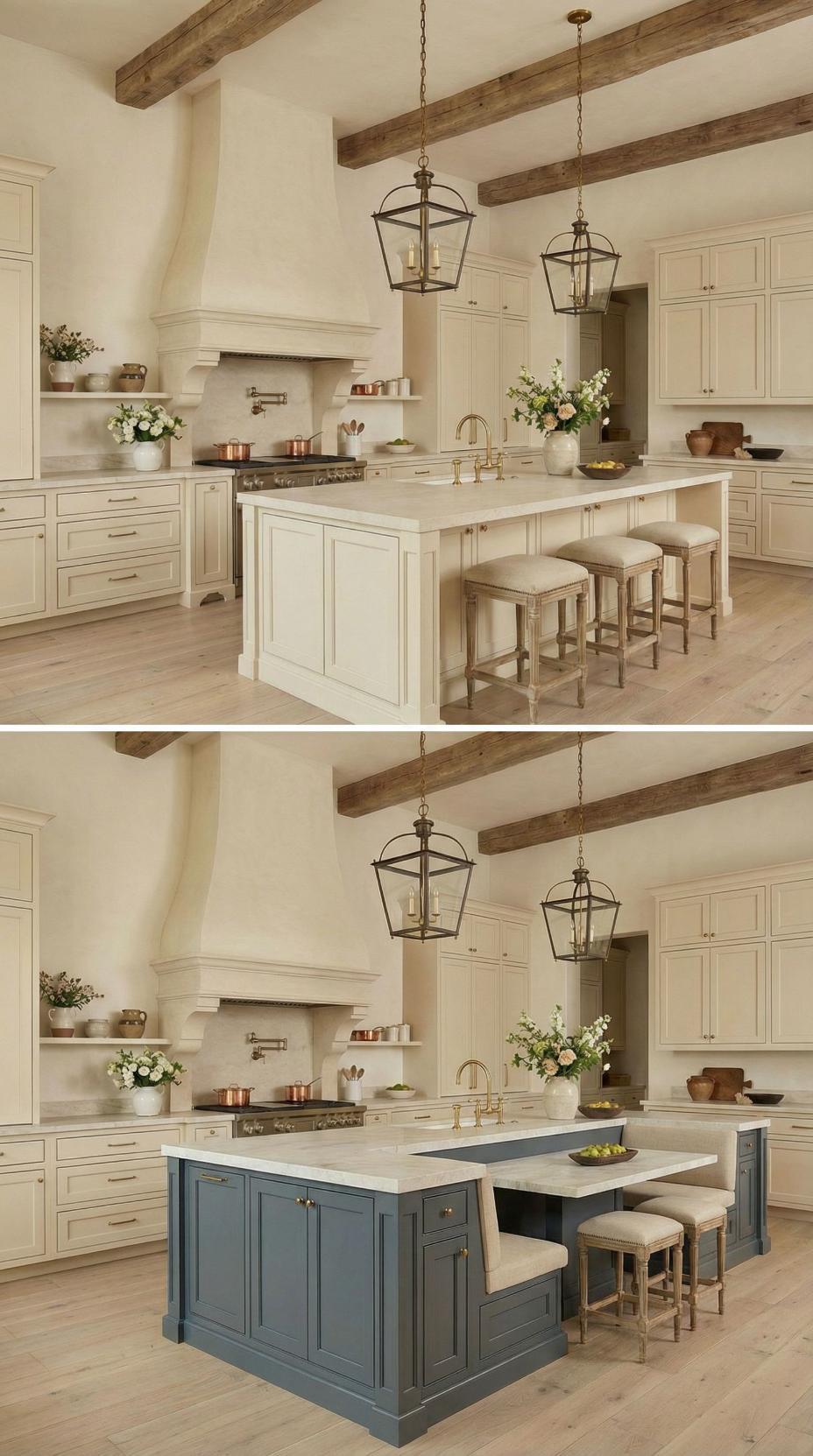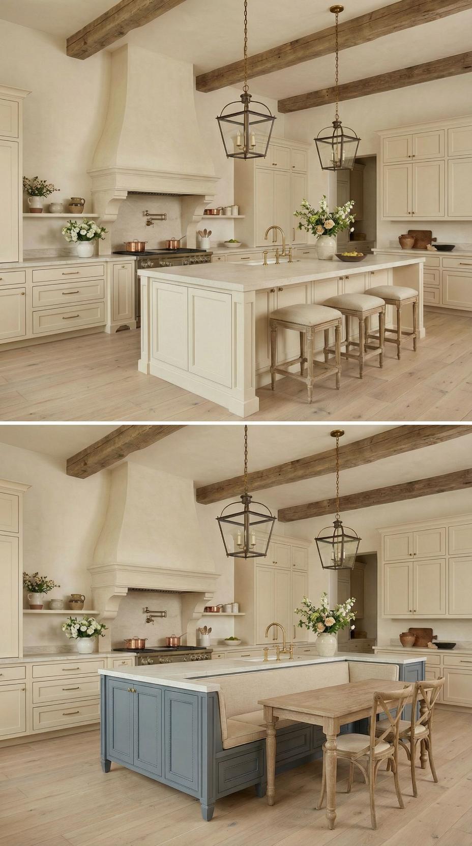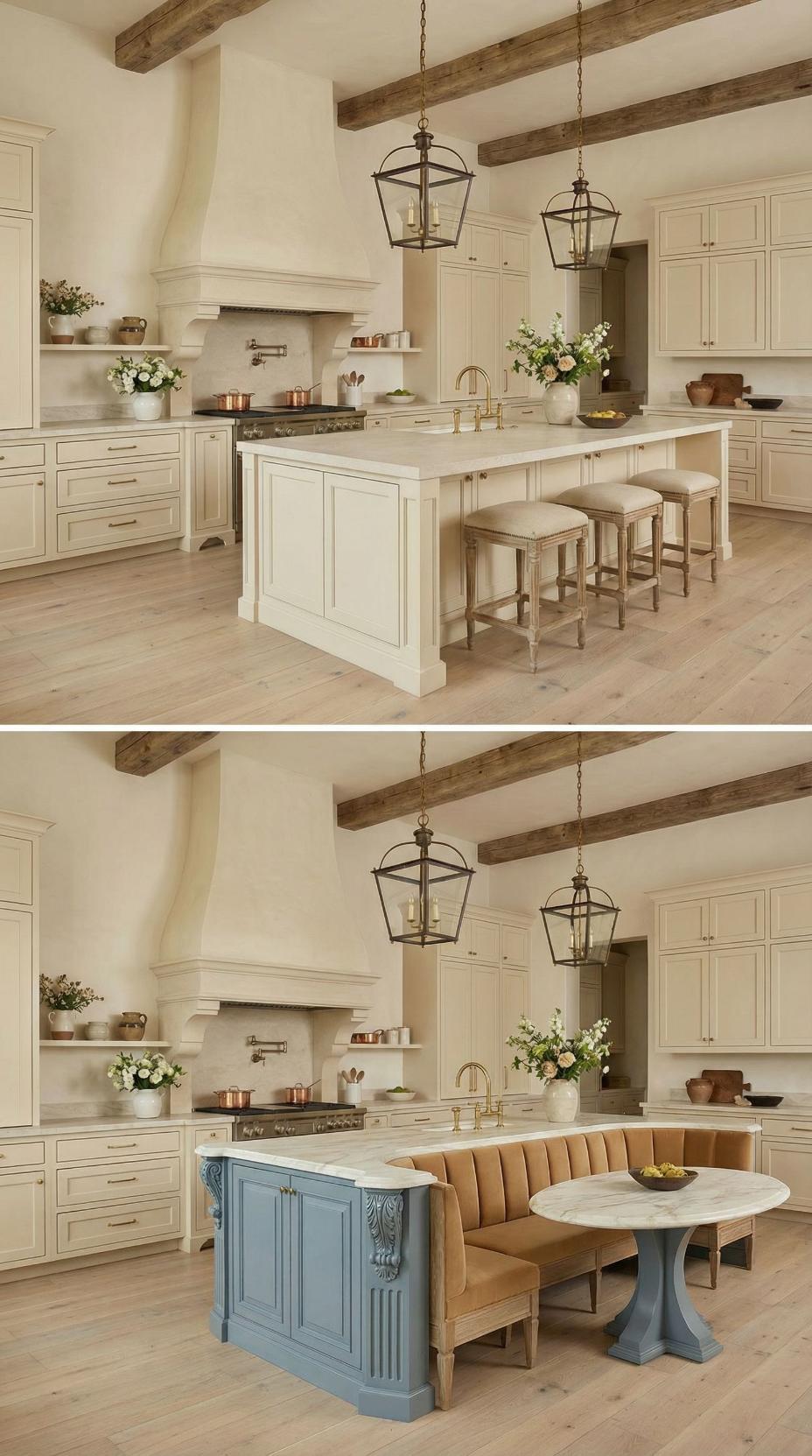 Exposed wooden beams frame this stunning transformation where a boring French Country kitchen with plain island becomes an inviting gathering space. The original white marble-topped island gains new life with the addition of a blue-gray base cabinet featuring built-in banquette seating. Neutral linen cushions and a natural wood dining table create the perfect breakfast nook, while lantern-style pendant lights maintain the room’s elegant farmhouse aesthetic.