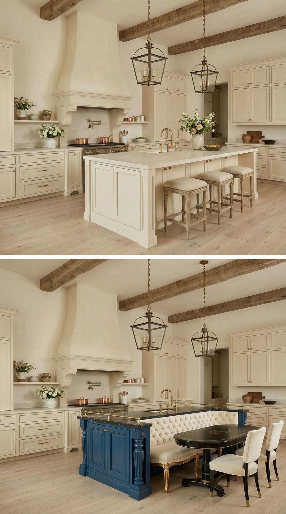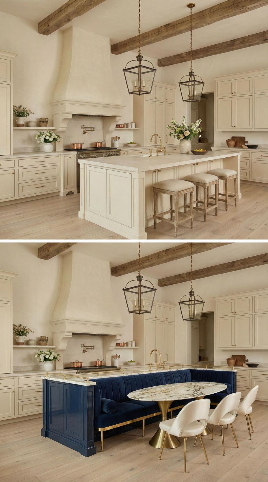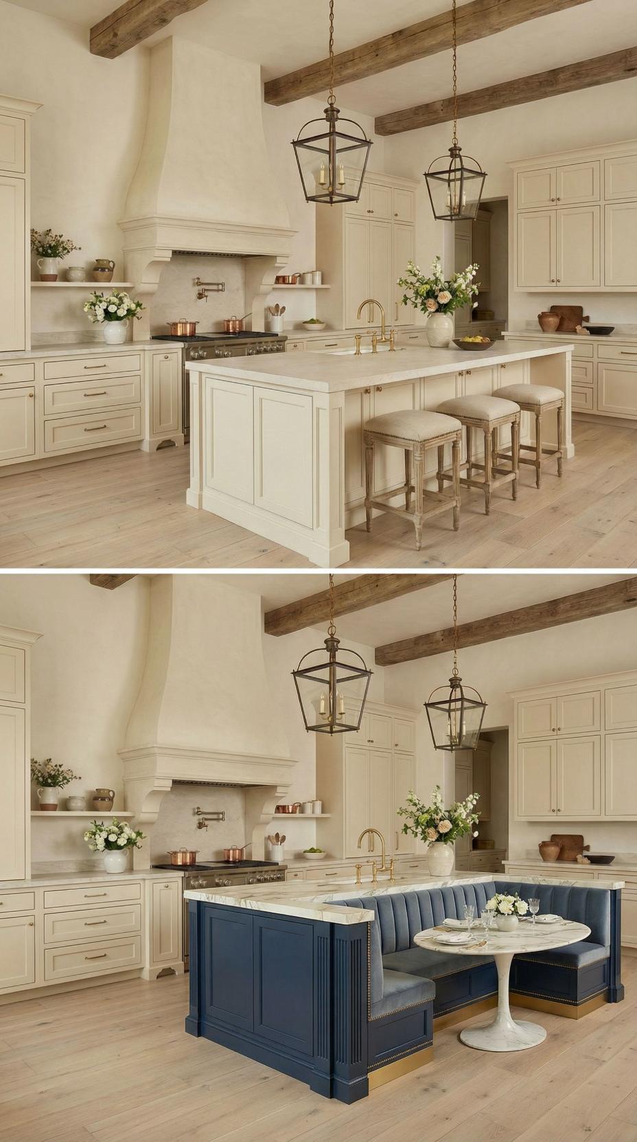 Transforming a French Country kitchen with plain island into this elevated design showcases the power of thoughtful renovation. The original neutral island gets reimagined with rich navy blue cabinetry and built-in banquette seating upholstered in coordinating fabric. A white marble pedestal table anchors the breakfast nook, while exposed wooden ceiling beams and lantern-style pendant lights maintain the room’s rustic charm throughout the stunning makeover.