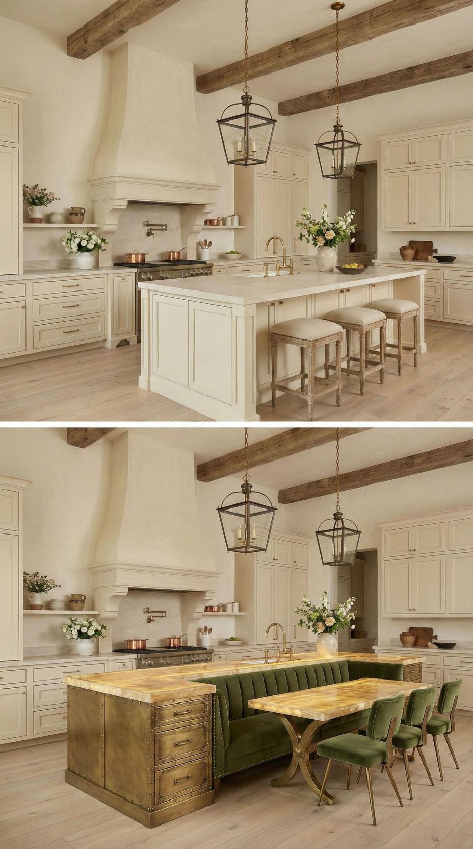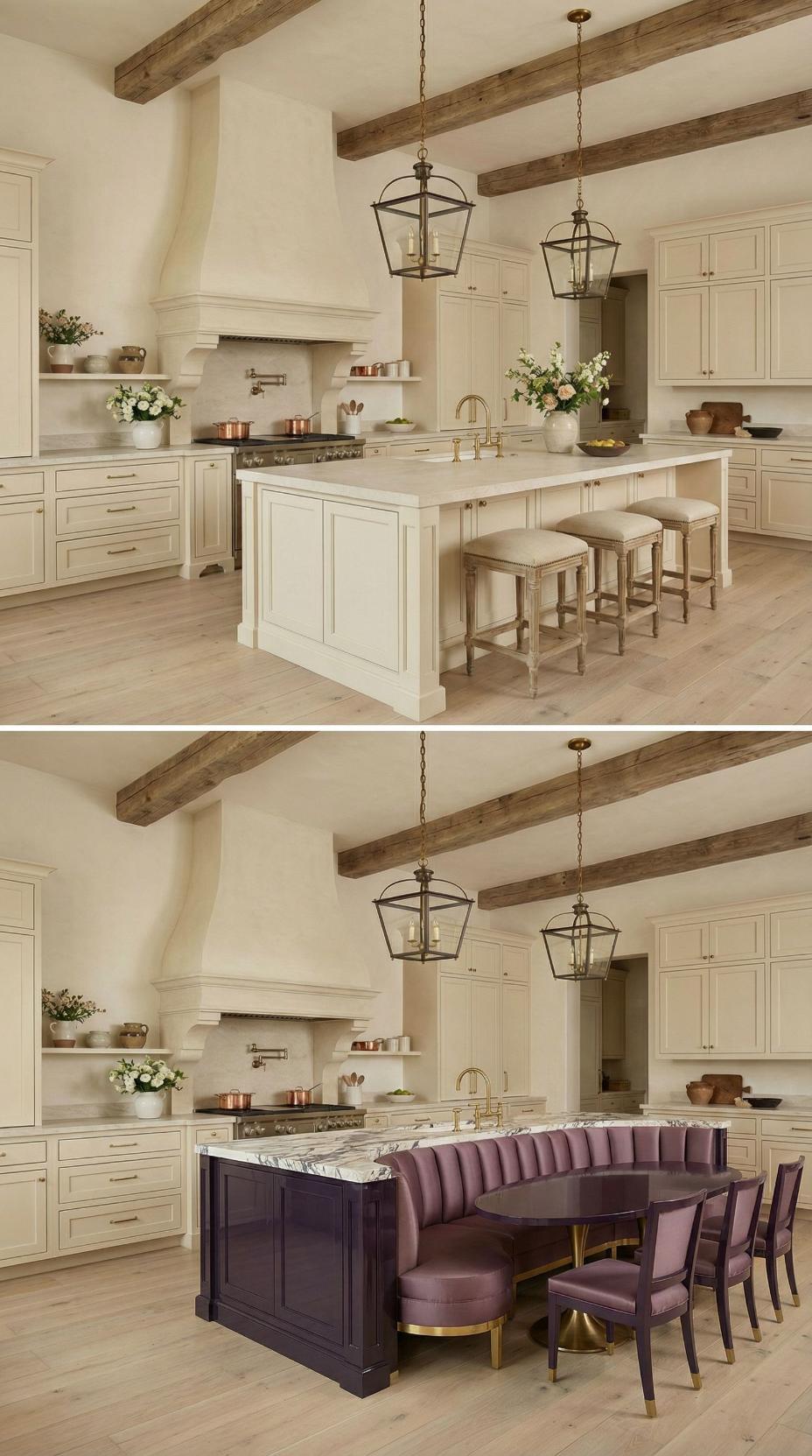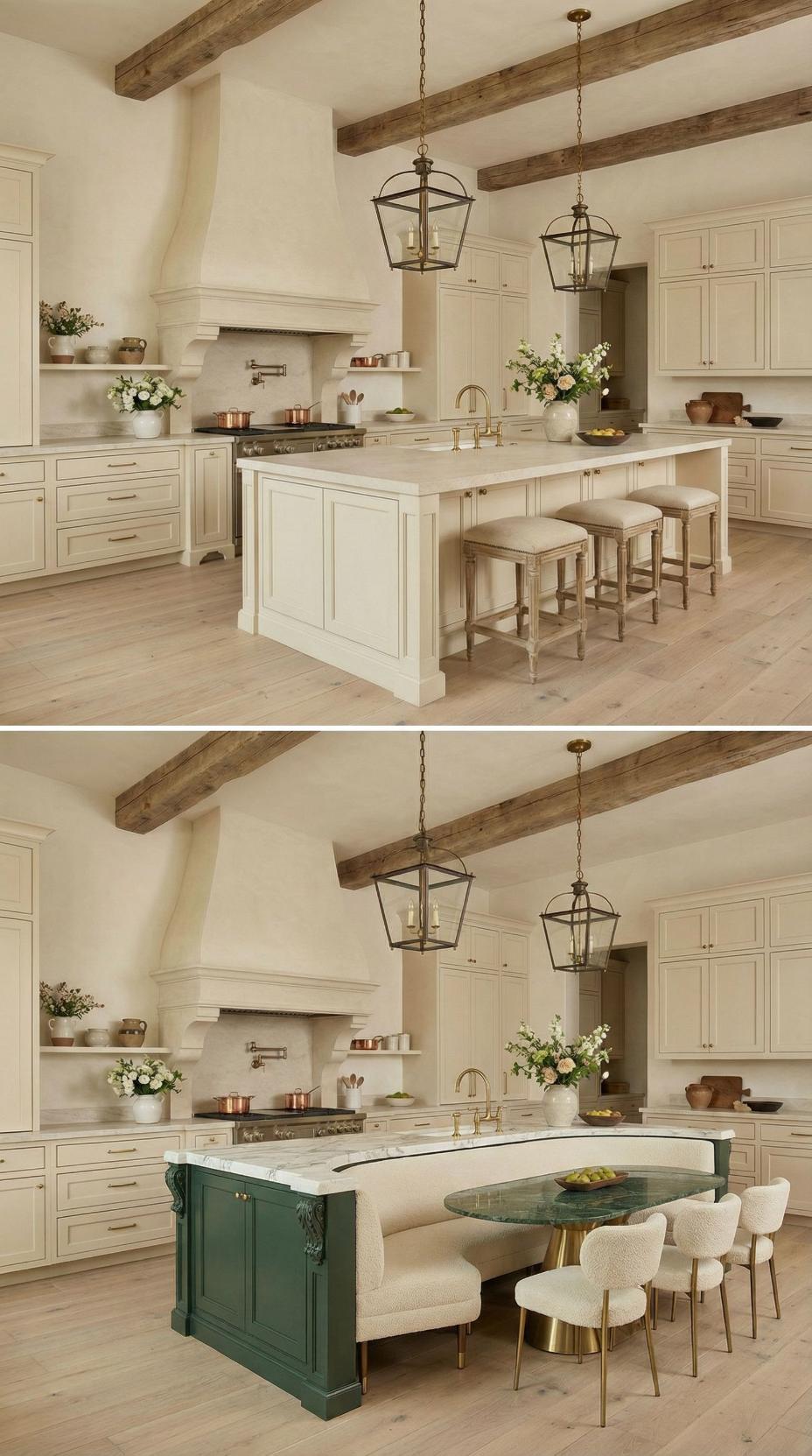 Transforming a French Country kitchen with plain island into this sophisticated dining setup elevates both function and style. The extended marble countertop now accommodates a built-in banquette with cream upholstered seating, while the natural wood dining table creates an intimate breakfast nook. Lantern-style pendant lights maintain the kitchen’s rustic charm while highlighting this clever space-saving solution that maximizes seating capacity.
