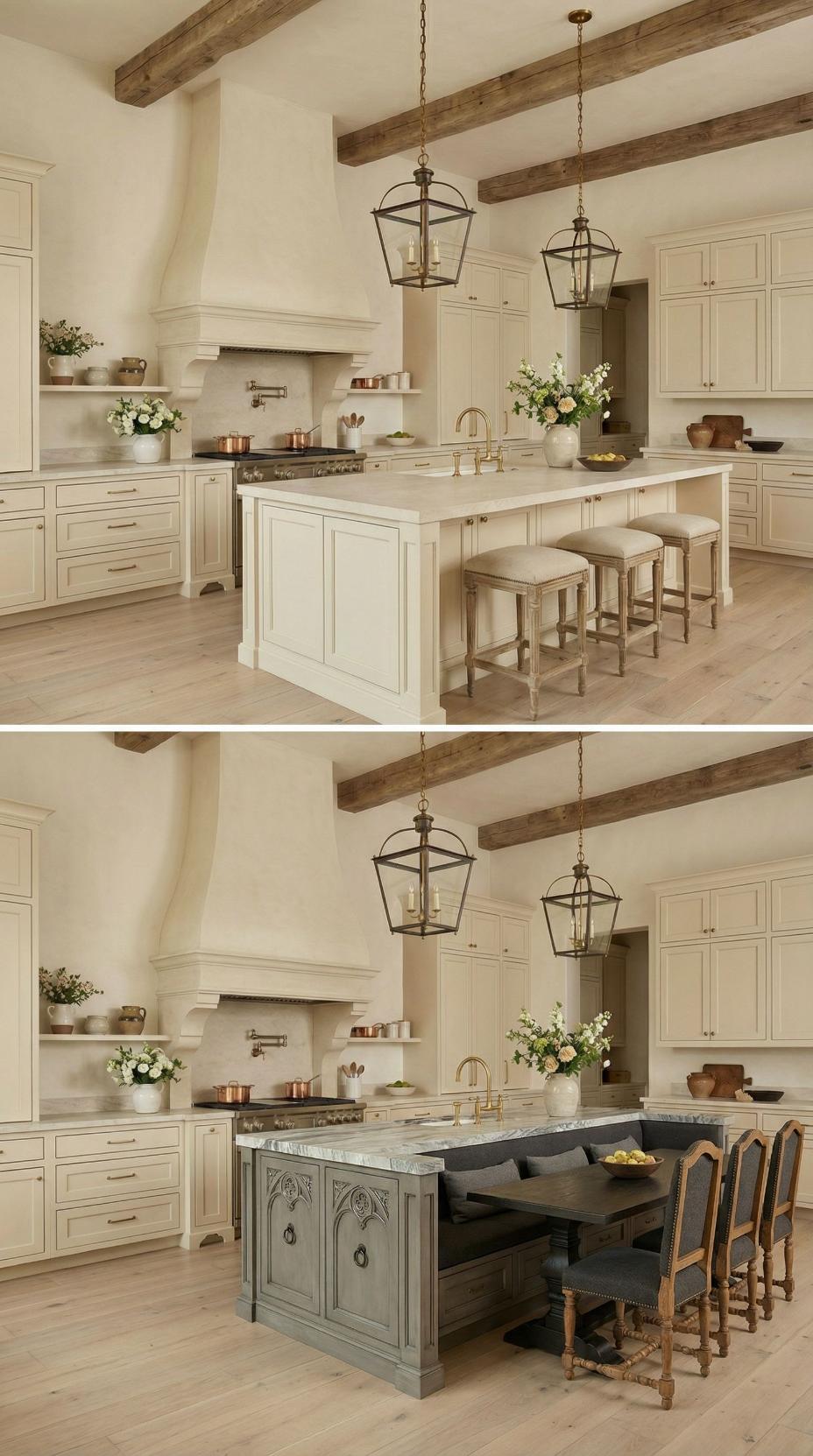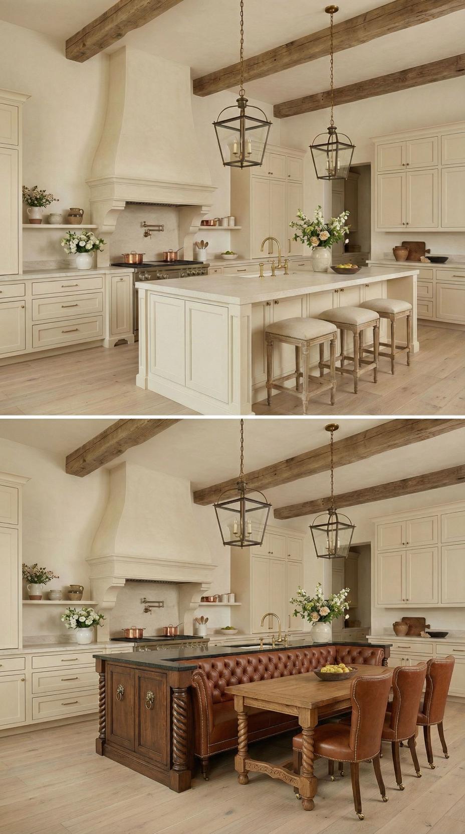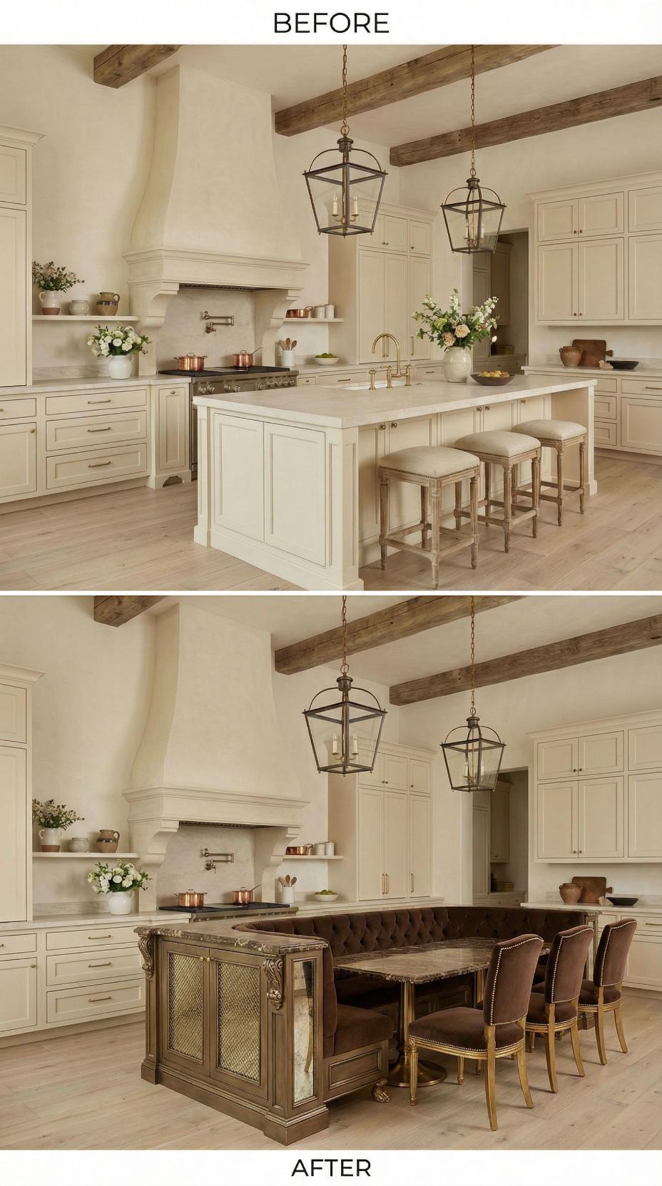 Warm cream cabinetry and exposed wooden beams create the perfect backdrop for this stunning transformation. The original plain island gets reimagined with rich dark wood construction and elegant turned legs, while marble countertops add luxurious contrast. Lantern-style pendant lights maintain the French country charm, and the addition of a dark wood pedestal dining table with cream upholstered chairs creates a cohesive, sophisticated gathering space.