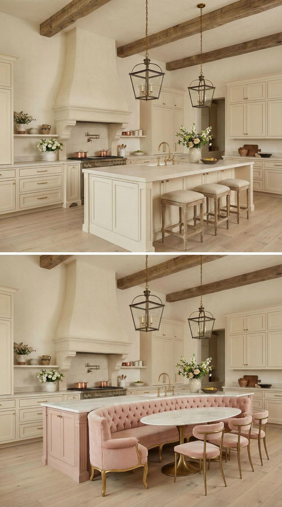 Replacing standard counter seating with a curved blush velvet banquette transforms this French country kitchen into an intimate dining destination. The tufted upholstered seating wraps gracefully around the island’s end, paired with brass-based pink velvet chairs and a sleek marble-top table. Exposed wood beams, lantern pendants, and cream cabinetry provide the perfect backdrop for this luxurious seating upgrade that elevates everyday meals into special occasions.