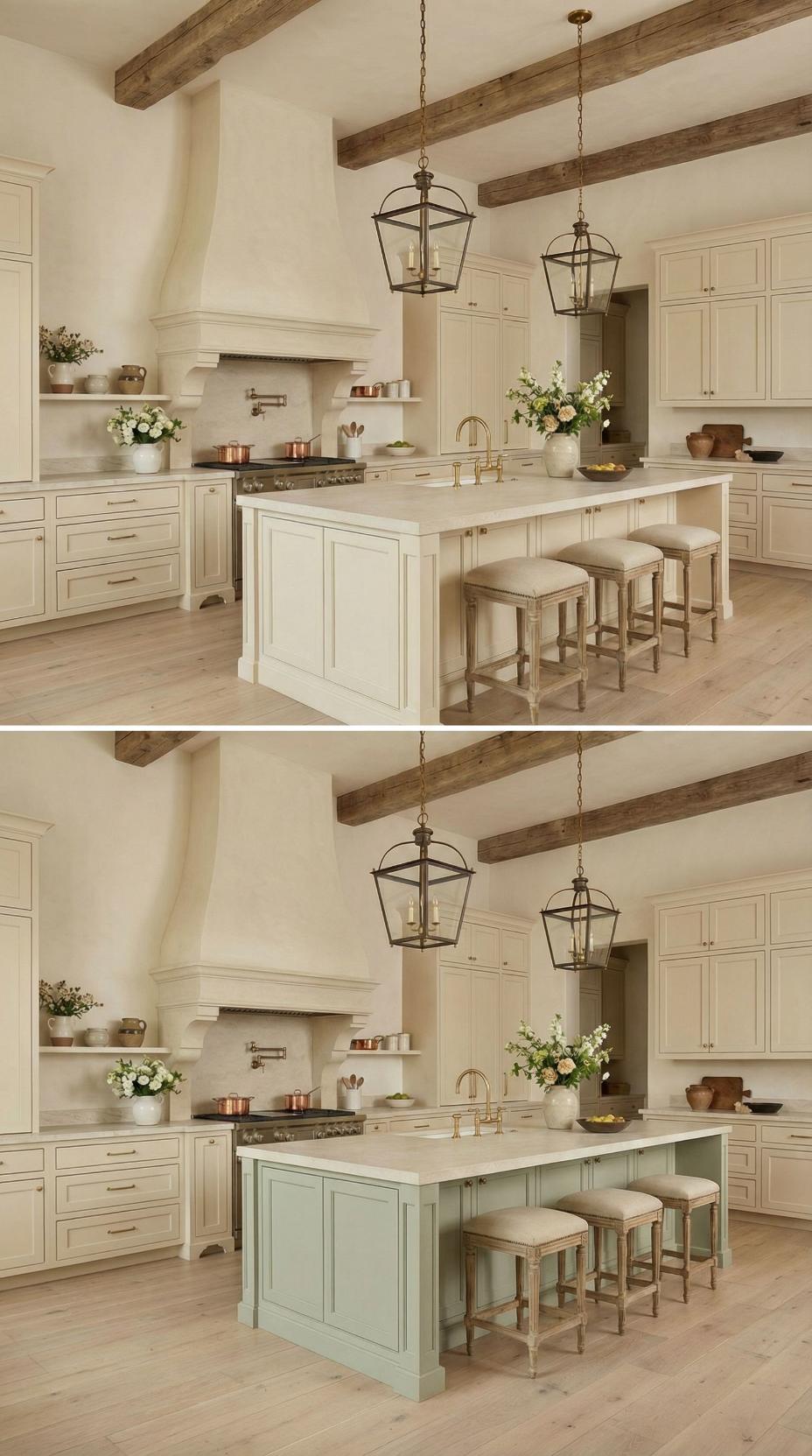 Copper pots gleam against pristine white cabinetry while exposed wooden ceiling beams anchor this elegant transformation. The French Country kitchen with plain island evolves dramatically through the addition of sage green paint on the central island, creating visual depth and organic warmth. Lantern-style pendant lights illuminate marble countertops, while natural wood bar stools provide comfortable seating for casual dining and conversation.