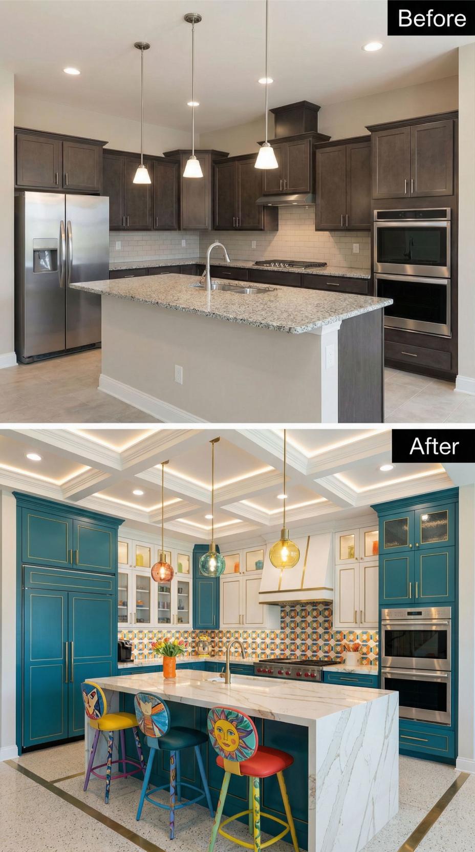 Bold teal cabinets with brass hardware replace generic brown cabinetry, creating an energetic culinary workspace. Colorful geometric backsplash tiles and whimsical sun-motif bar stools inject personality into the previously neutral space. Dramatic coffered ceiling with LED strip lighting elevates the entire room, while marble waterfall countertops add luxurious sophistication to this playful yet refined transformation.
