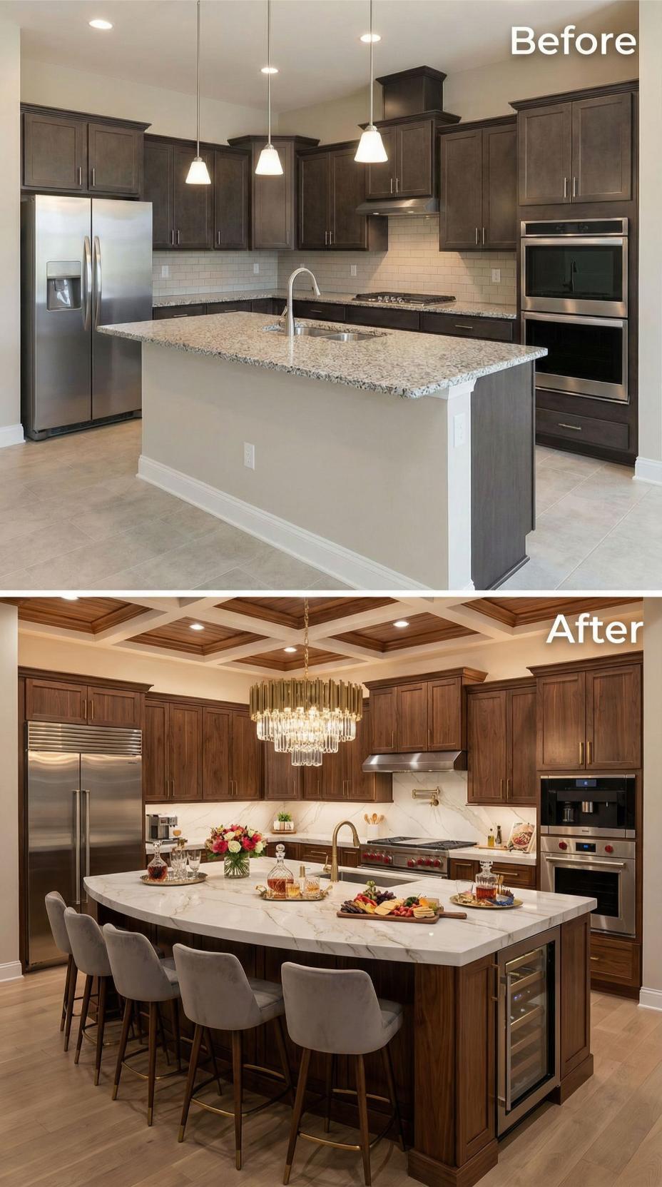 Dramatic coffered ceilings with exposed beams elevate this formerly basic builder-grade kitchen for happy people into a sophisticated culinary sanctuary. Stunning crystal chandeliers replace simple pendant lighting, while luxurious marble waterfall countertops upgrade the standard granite surfaces. Rich walnut cabinetry maintains warmth while gaining elegant hardware and refined proportions that showcase premium stainless steel appliances.