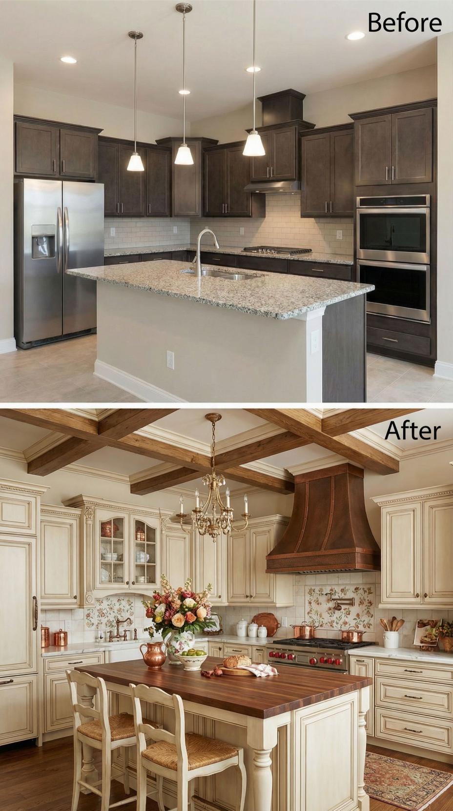 Dramatic wooden ceiling beams and an ornate crystal chandelier replace simple recessed lighting, instantly elevating this builder-grade kitchen for happy people into a sophisticated French country retreat. Cream glazed cabinetry with decorative molding transforms plain dark cabinets, while a decorative floral backsplash and copper range hood create stunning focal points. The butcher block island top and rush-seat stools add warmth and authentic farmhouse character to complete the elegant transformation.