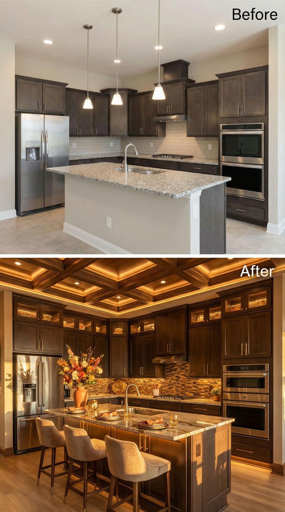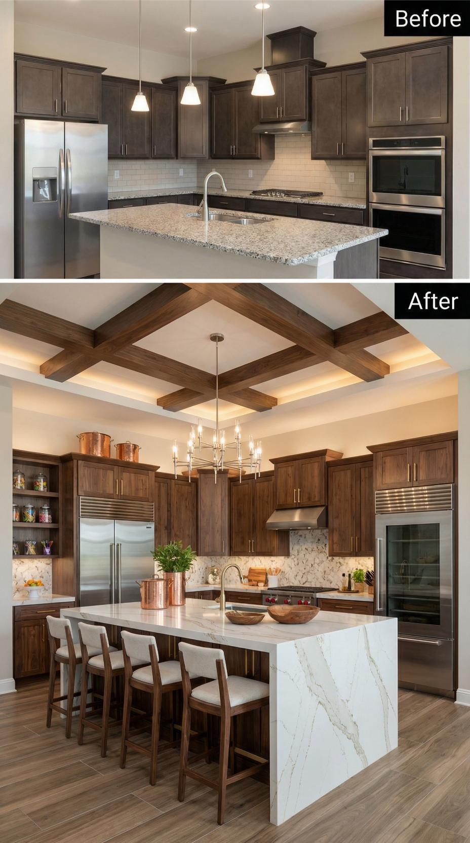 From Builder-Grade to Luxe Culinary Haven with Coffered Ceiling Drama