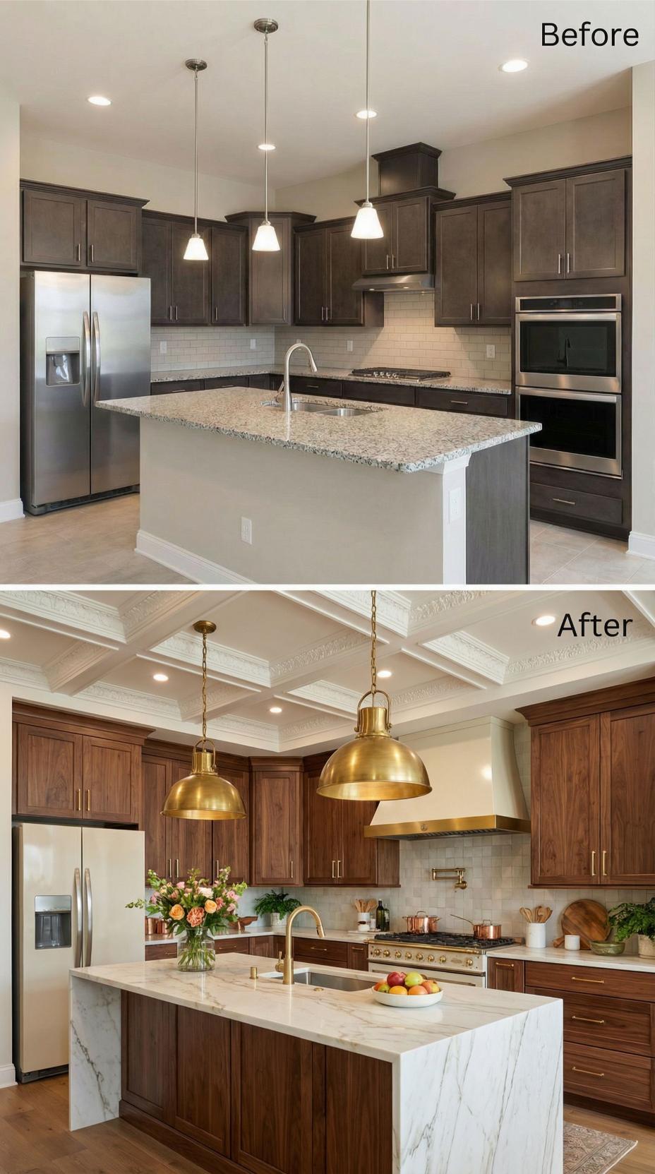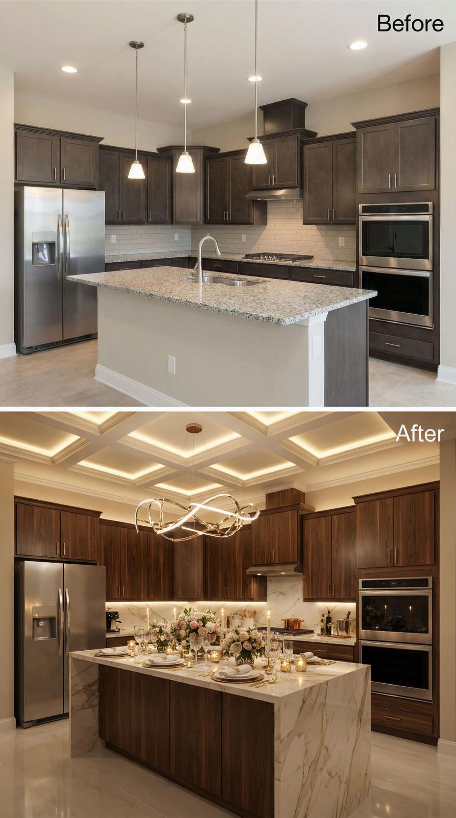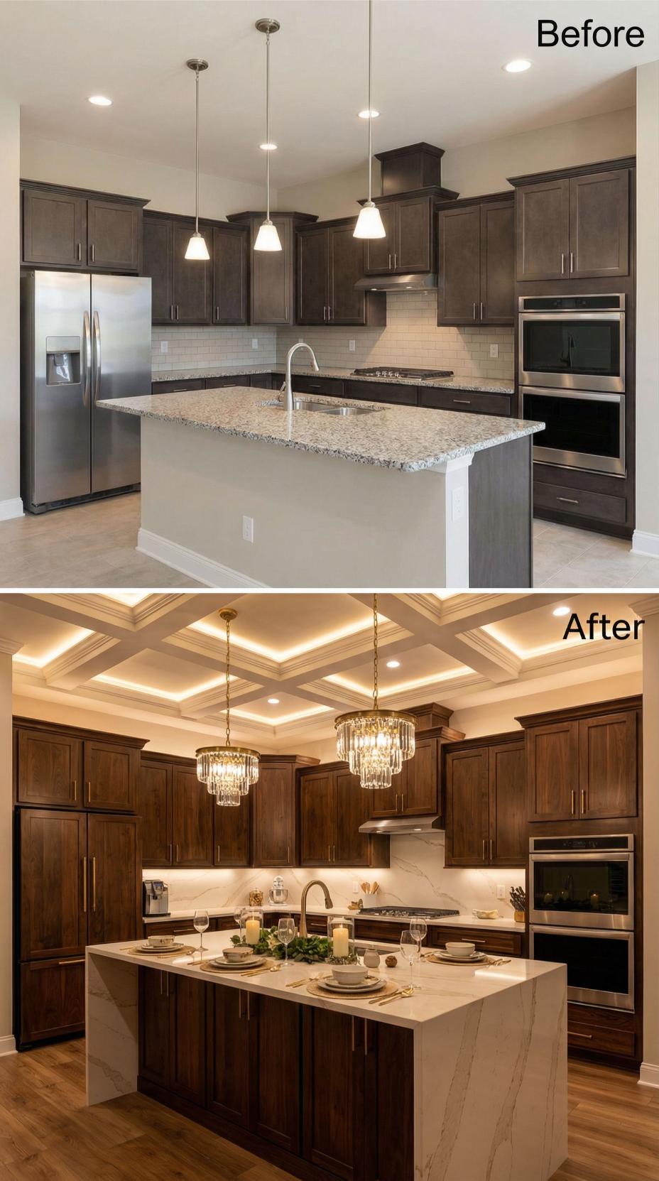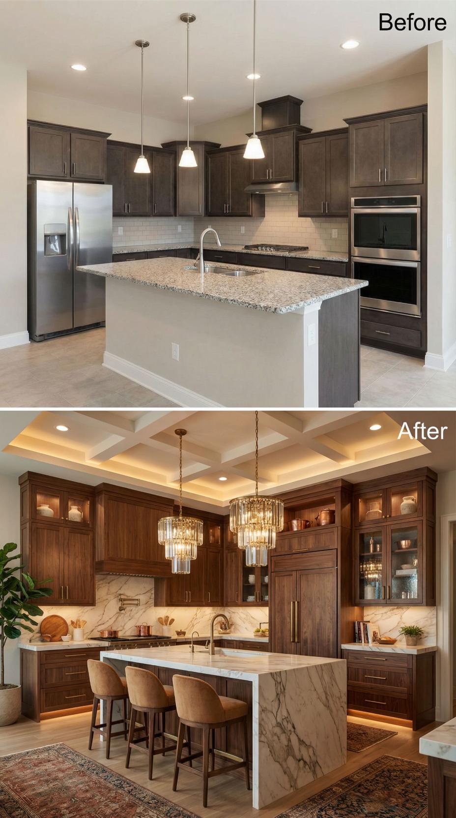 Elaborate coffered ceiling details with integrated LED lighting completely reimagine this builder-grade kitchen for happy people. Rich walnut cabinetry replaces basic brown finishes while dramatic marble waterfall countertops upgrade the simple granite island. Under-cabinet LED strips and a sculptural brass chandelier create sophisticated ambient lighting that transforms the entire atmosphere into restaurant-quality elegance.