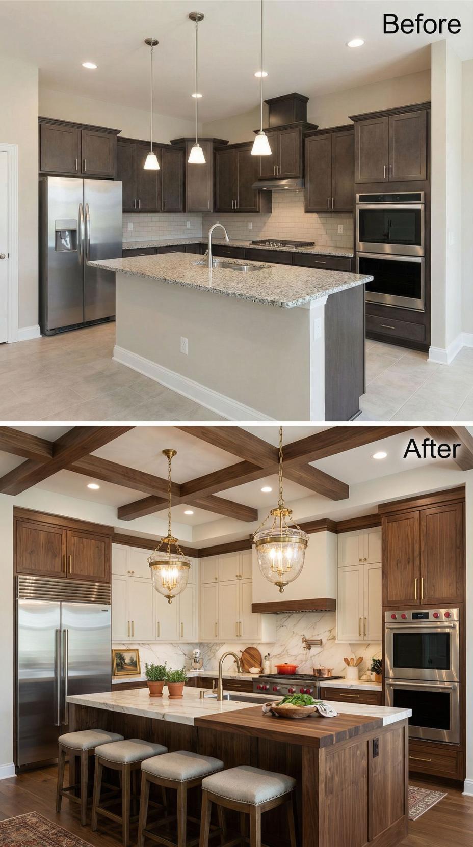 Exposed wooden beams and coffered ceilings replace the basic flat ceiling, instantly elevating this builder-grade kitchen for happy people into a sophisticated culinary haven. Warm walnut cabinetry pairs beautifully with crisp white upper cabinets, while ornate brass pendant lights create dramatic focal points above the expanded island. The transformation includes luxurious marble countertops and a custom wood butcher block extension that invites family gatherings.