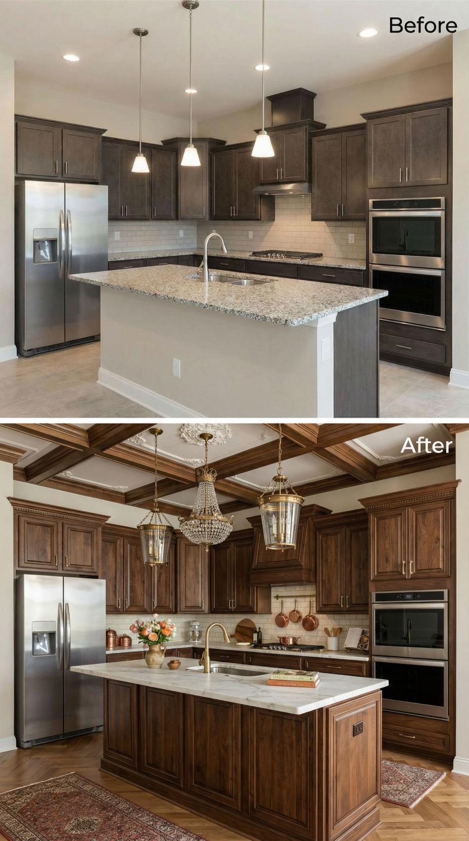 Dark espresso cabinets receive a stunning upgrade to warm honey oak finishes, while elaborate coffered ceiling details replace the plain flat surface above. Ornate crystal chandeliers dramatically transform the lighting from basic pendant fixtures, creating an upscale ambiance. Rich natural wood tones throughout the space establish a sophisticated traditional aesthetic that elevates every cooking experience.