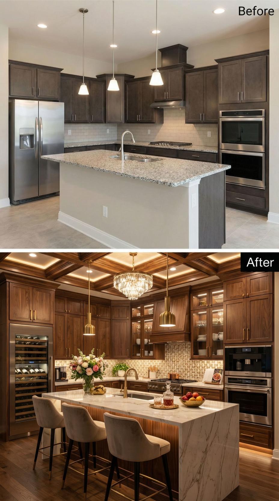 Builder-grade Kitchens for Happy People receive stunning makeovers through dramatic architectural upgrades and luxurious finishes. Elaborate coffered ceilings with integrated LED lighting replace flat surfaces, while crystal chandeliers add sophisticated sparkle above the island. Rich walnut cabinetry maintains the original layout but elevates the entire aesthetic with premium materials and expert craftsmanship.