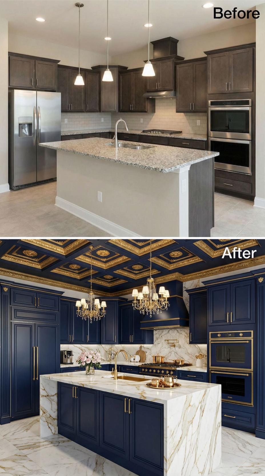 Bold navy cabinetry with brass hardware transforms a standard builder-grade kitchen into palatial luxury. Coffered ceilings adorned with intricate gold molding create dramatic height, while dual crystal chandeliers replace simple pendant lighting. Calacatta marble waterfall countertops and backsplash elevate the space with natural veining, complemented by brass fixtures that echo the ornate ceiling details throughout this regal transformation.