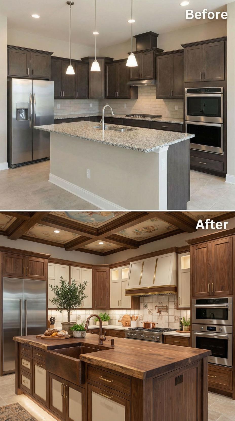 Warm walnut cabinetry and an elaborate coffered ceiling transform this once-standard space into a luxurious culinary haven. Rich wood butcher block countertops replace cold granite, while cream-painted upper cabinets create beautiful contrast against the darker base units. Decorative tile backsplash and thoughtful styling with copper cookware and fresh greenery complete this stunning metamorphosis from basic to breathtaking.