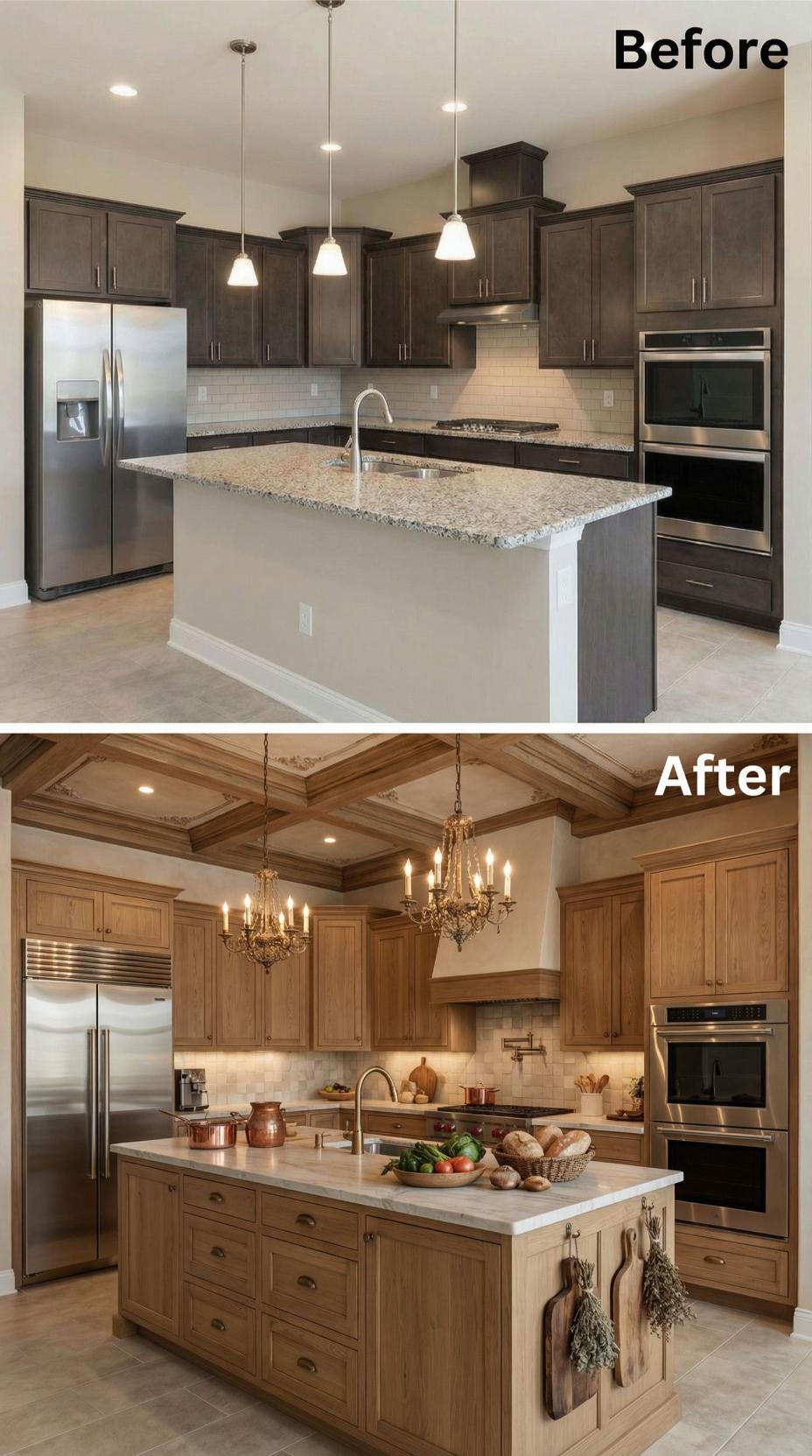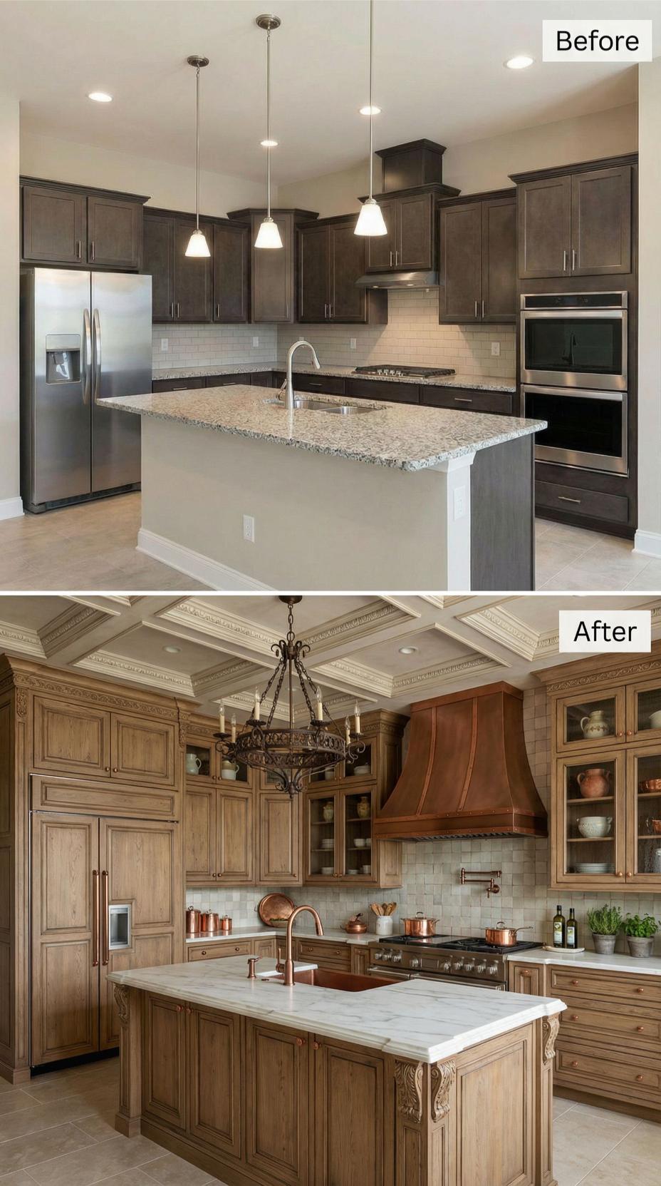 Builder-grade Kitchens for Happy People transform into sophisticated culinary havens through dramatic architectural upgrades. Dark espresso cabinets give way to warm honey oak with intricate detailing, while standard granite counters evolve into luxurious marble surfaces. The addition of coffered ceilings, copper range hood, and wrought iron chandelier creates an old-world charm that elevates the entire space from basic to breathtaking.